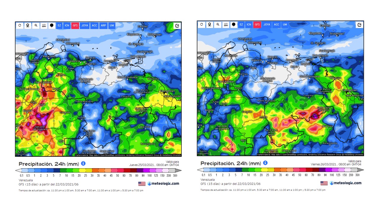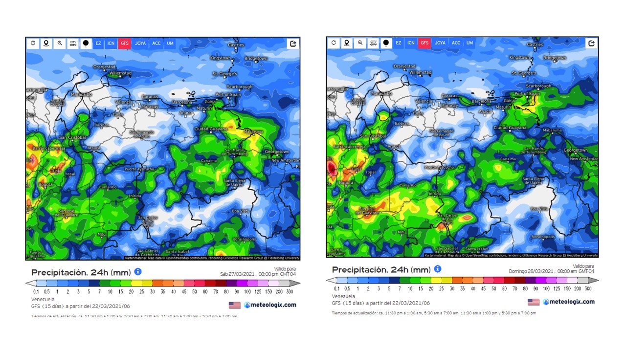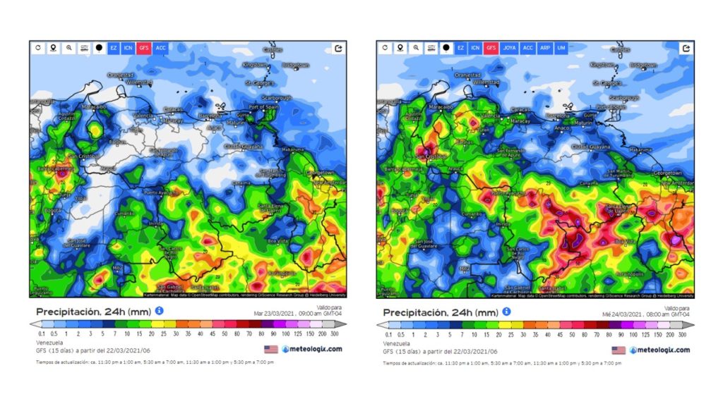 La semana del 22 al 28 de marzo, se prevé a partir del martes en la madrugada un incremento de las precipitaciones en el sur del país (Bolívar y Amazonas), luego esta se extiende hacia los andes, reduciendo los eventos hacia el fin de semana.