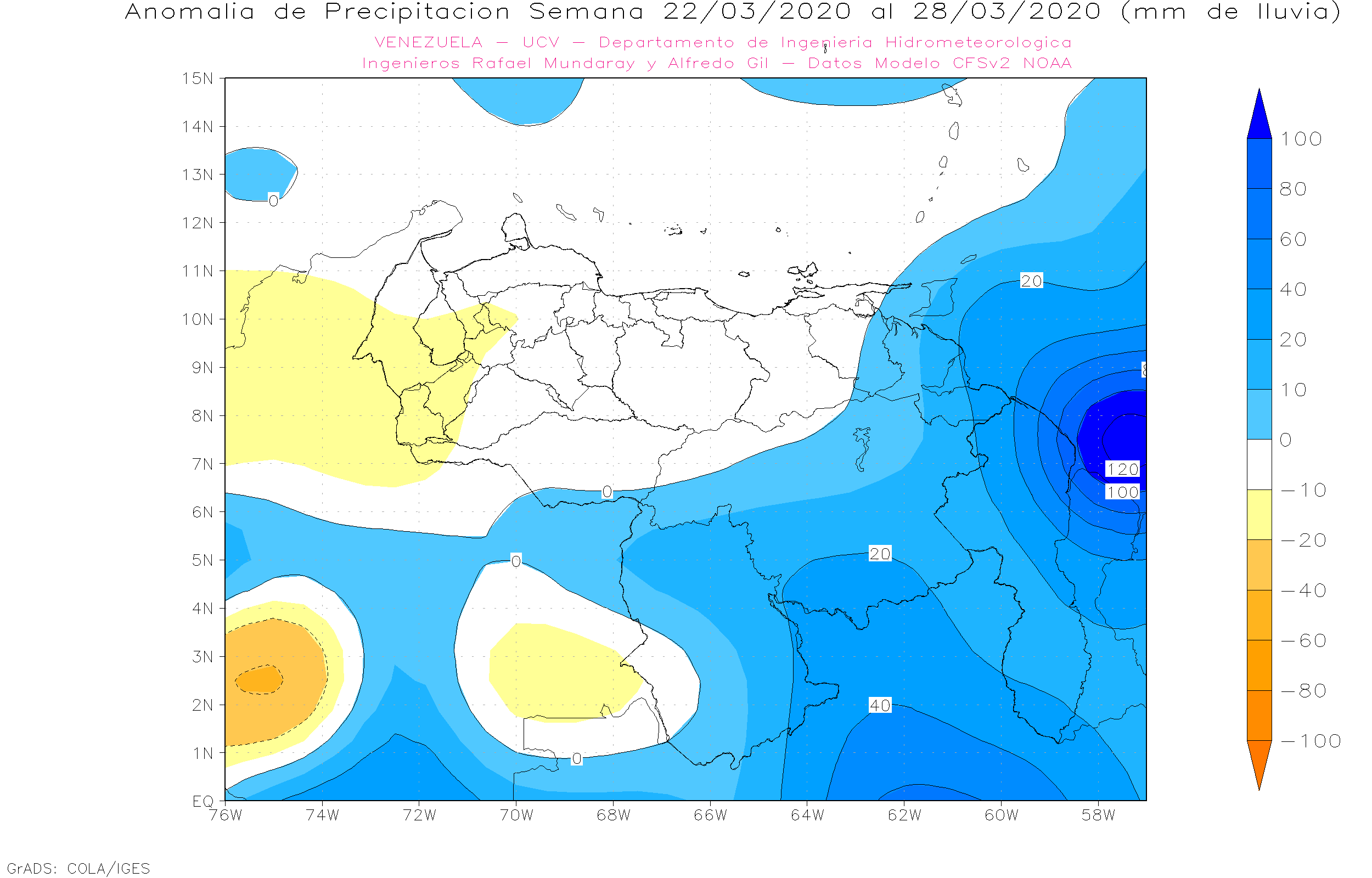 La semana del 22 al 28 de marzo, se prevé anomalías positivas al sur (Bolívar, Amazonas) y Oriente (Monagas, Delta Amacuro), el resto del país con anomalías cercanas al promedio.