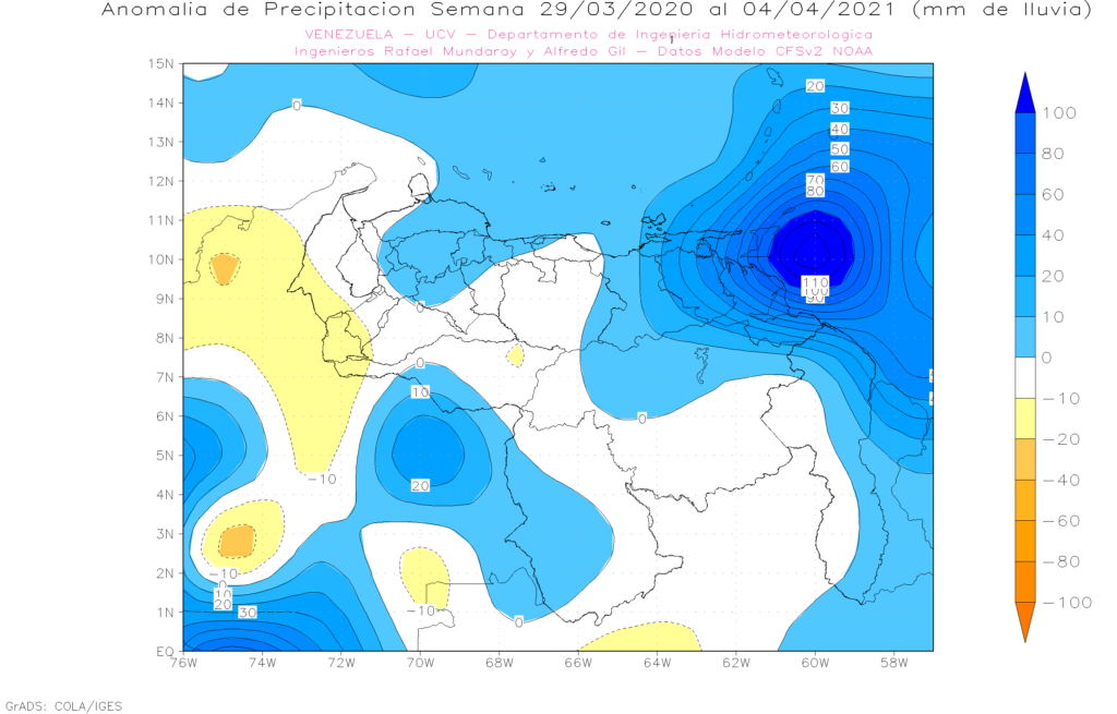 La semana del 29 de marzo al 04 de abril, se prevé anomalías positivas en el oriente del país (Sucre, Monagas, Delta Amacuro y Anzoátegui), el resto de país con anomalías cercana a la media.