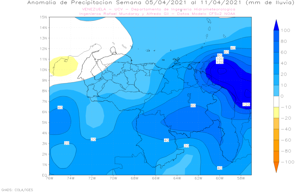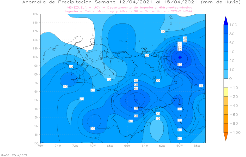 La semana del 12 al 18 de abril, se prevé que se mantengan anomalías positivas en casi todo el país, las mas importantes al sur ( Bolívar, Amazonas)., oriente ( Sucre, Monagas, Delta Amacuro y Anzoátegui) y los andes