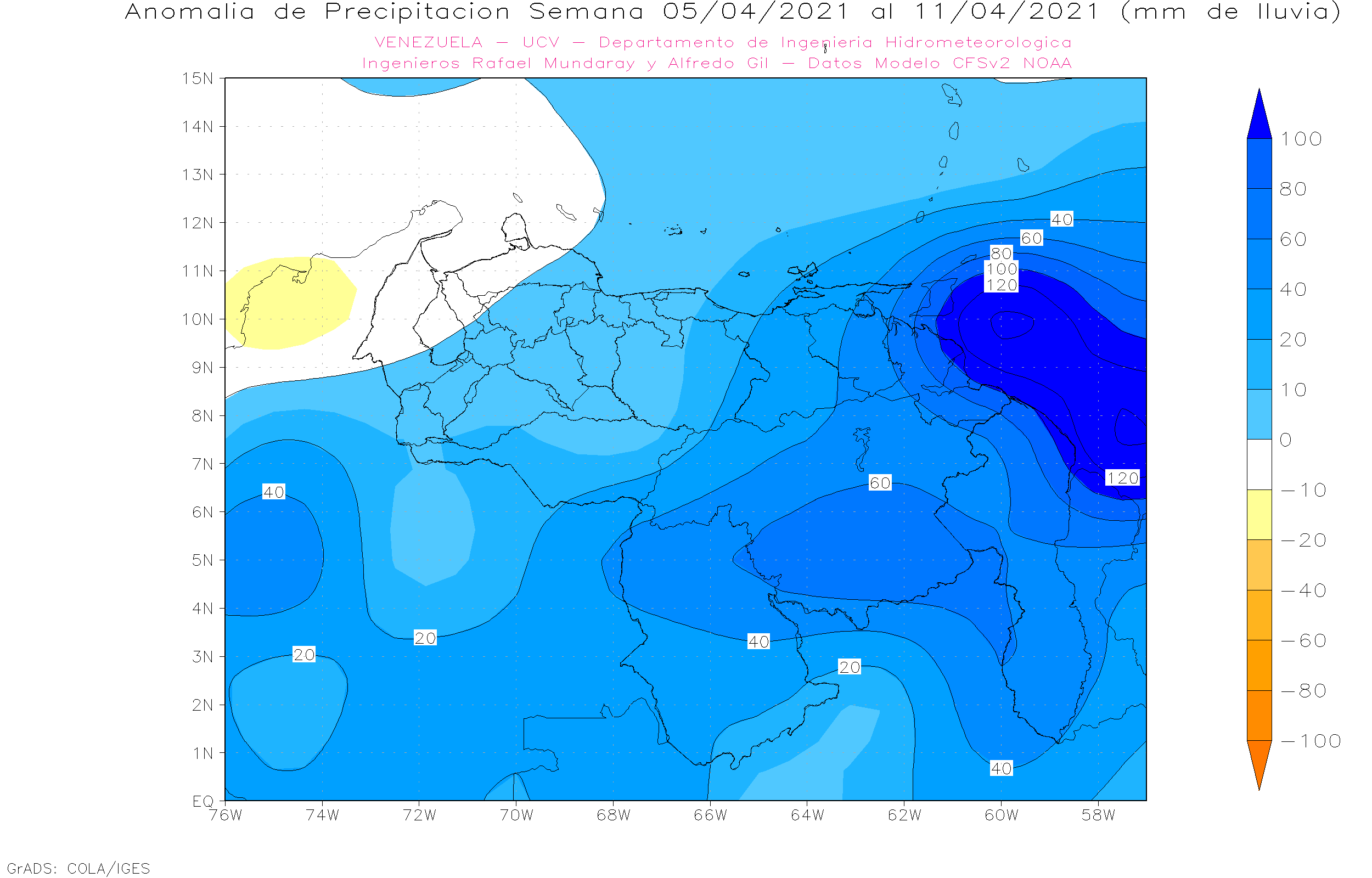 La semana del 05 al 11 de abril, se prevé una reactivación de los eventos de precipitaciones, con anomalías positivas en casi todo el país, las mas importantes al sur ( Bolívar, Amazonas) y oriente ( Sucre, Monagas, Delta Amacuro y Anzoátegui)