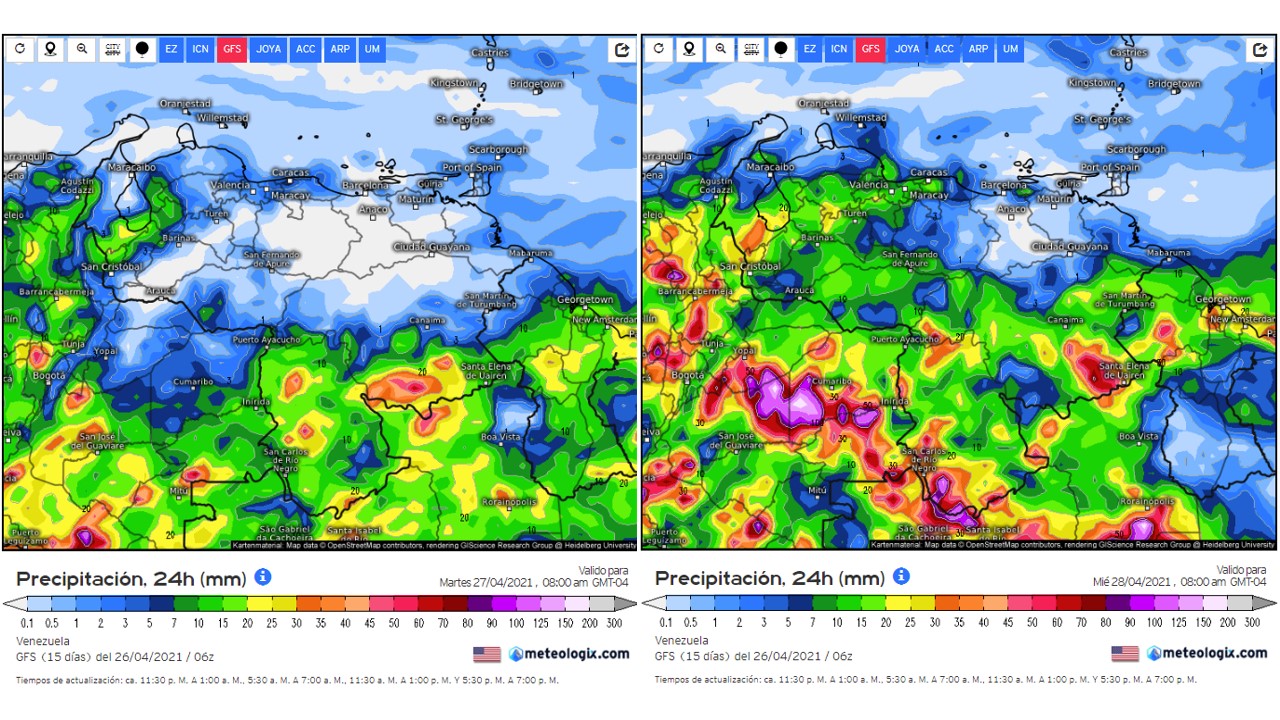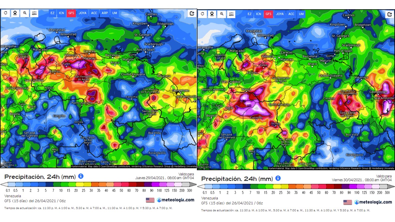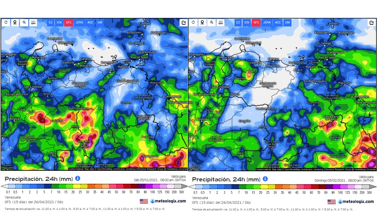 En el pronostico diario del modelo GFS desde 27 de abril hasta 05 de mayo, se aprecia que las lluvias comienzan por el sur del país, luego abarcan los andes, finalizando con casi todo el país, y reduciendose en los dos ultimos días al sur de pais, los andes y los llanos occidentales. Los eventos mas importantes se pronosticoan sobre los llanos occidentales