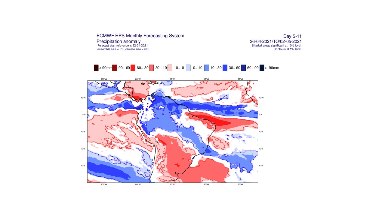 PRONOSTICO DE ANOMALÍAS SEMANALES DE PRECIPITACIÓN, DURANTE EL PERIODO DEL 26/04 AL 23/05 DE 2021