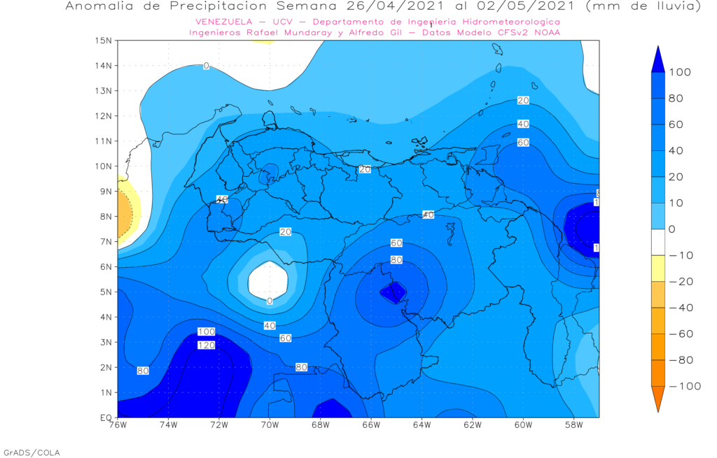 La semana del 26 de abril al 02 de mayo, se prevé anomalías positivas en todo el territorio nacional, las importantes se pronostican entre Amazonas y Bolívar (80 mm), el restoe staran por encima de los 20 mm.
