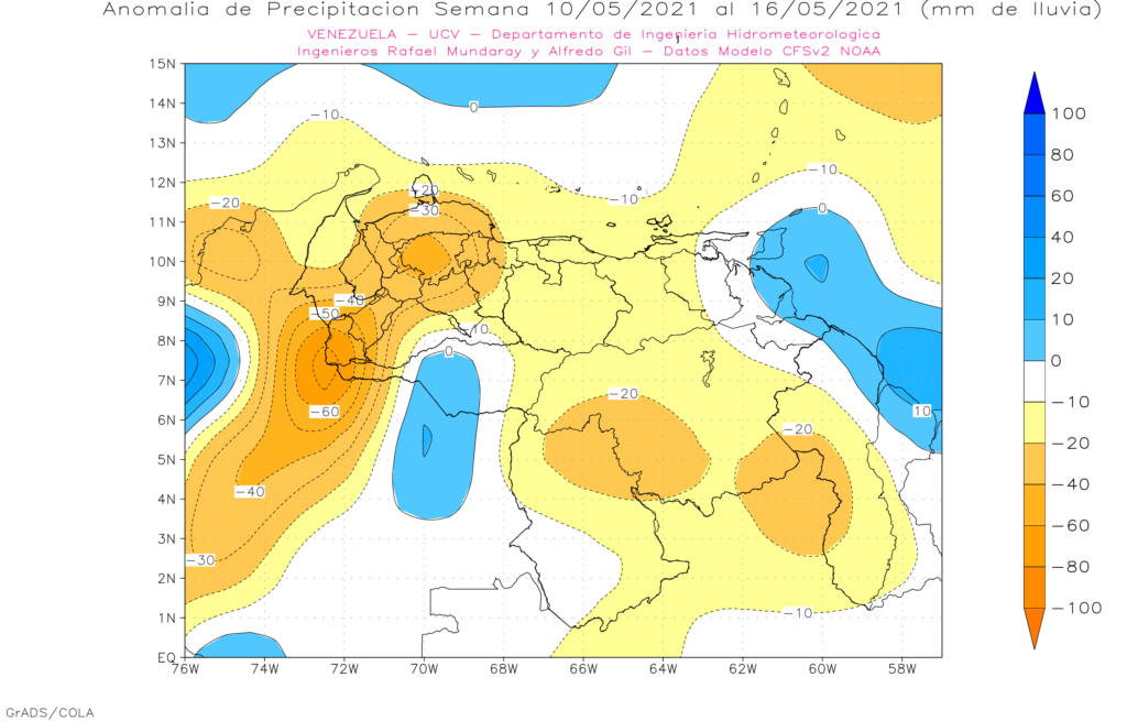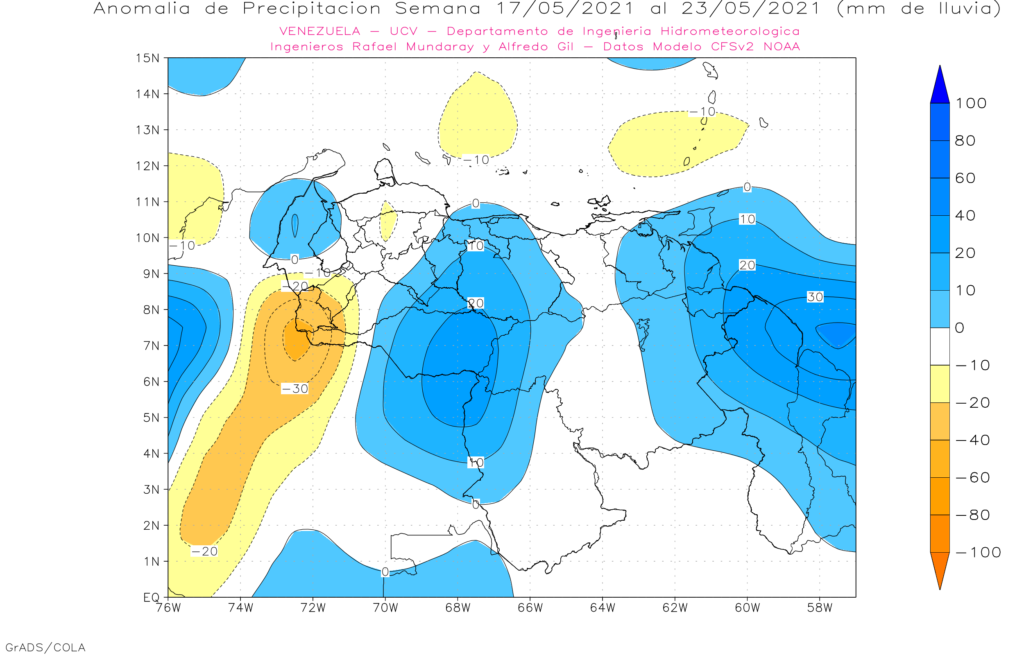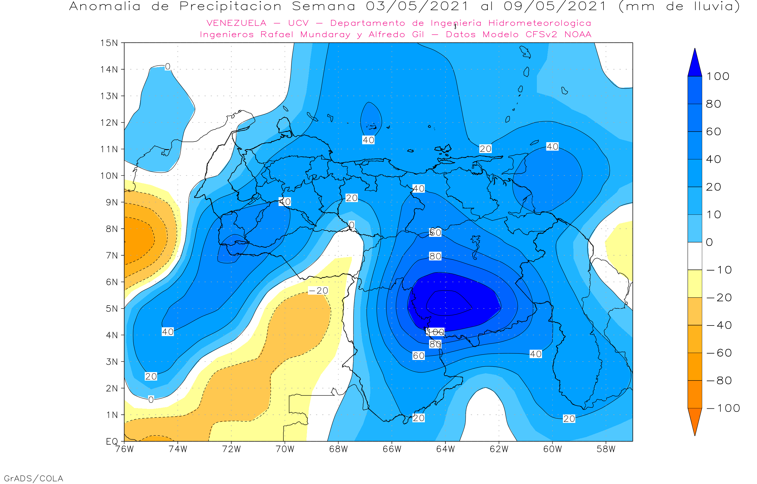 La semana del 03 al 09 de mayo, se prevé que se mantengan las anomalías positivas en casi todo el territorio nacional, las mas importante al sur de Bolívar.