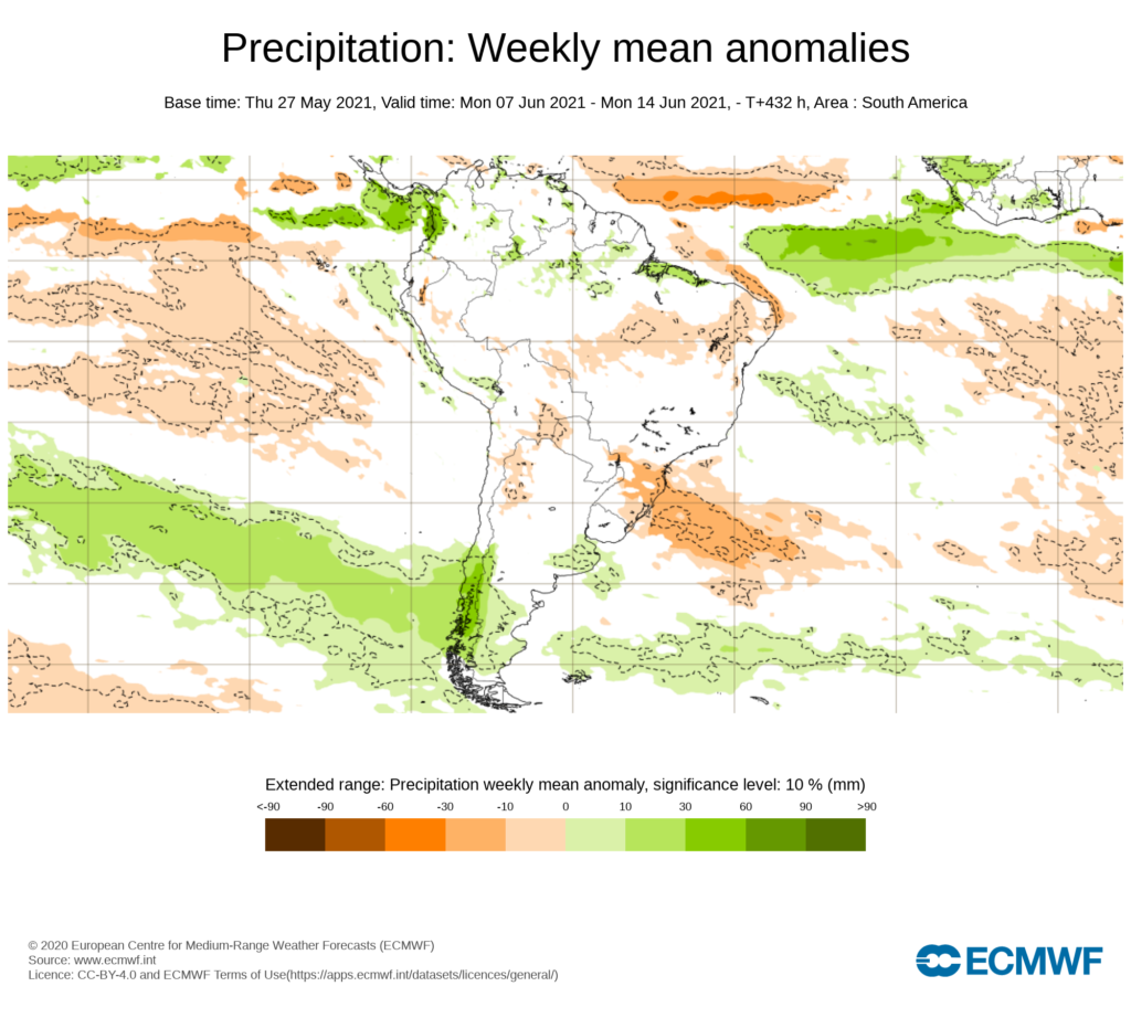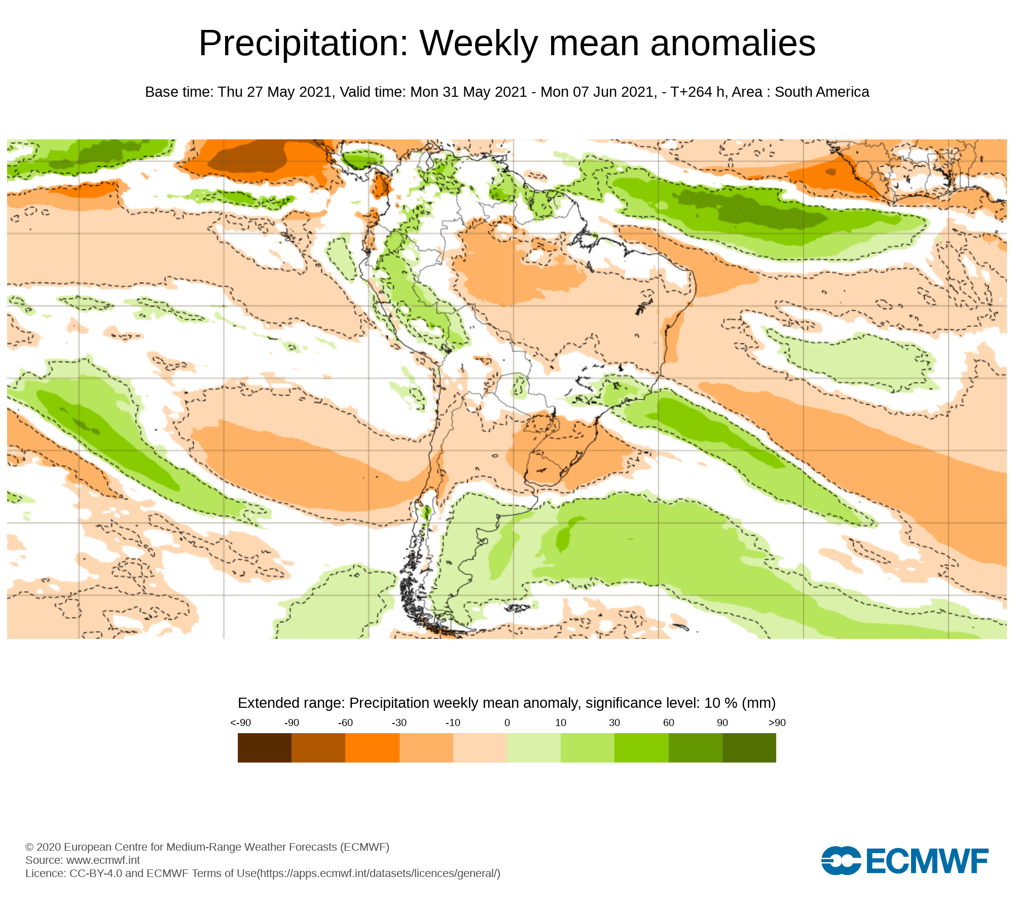 Al comparar el pronostico semanal de anomalías del CFSv2 con el emitido por European Centre for Medium-Range Weather Forecast (ECMWF), se observa anomalías de positivas de precipitaciones al sur (coincide con el GFS) y llanos occidentales (no hay coincidencia).