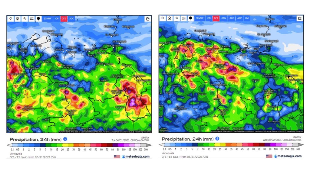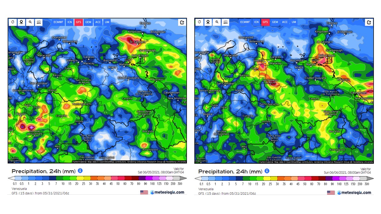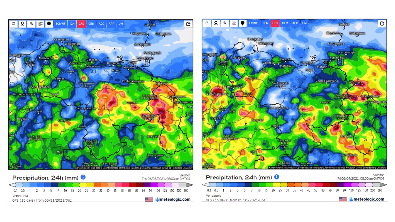 En el pronostico diario del modelo GFS del 31 de mayo al 06 de junio, se prevé que las lluvias mas importantes al sur del país, para el martes lluvias en los llanos occidentales, para el final de la semana lluvias dispersas sobre el territorio nacional.