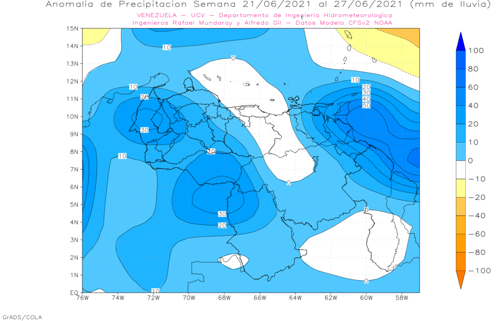 Semanales para Venezuela, del 31/05 al 27/06 de 2021, usando datos del Modelo CFSv2 de NOAA.