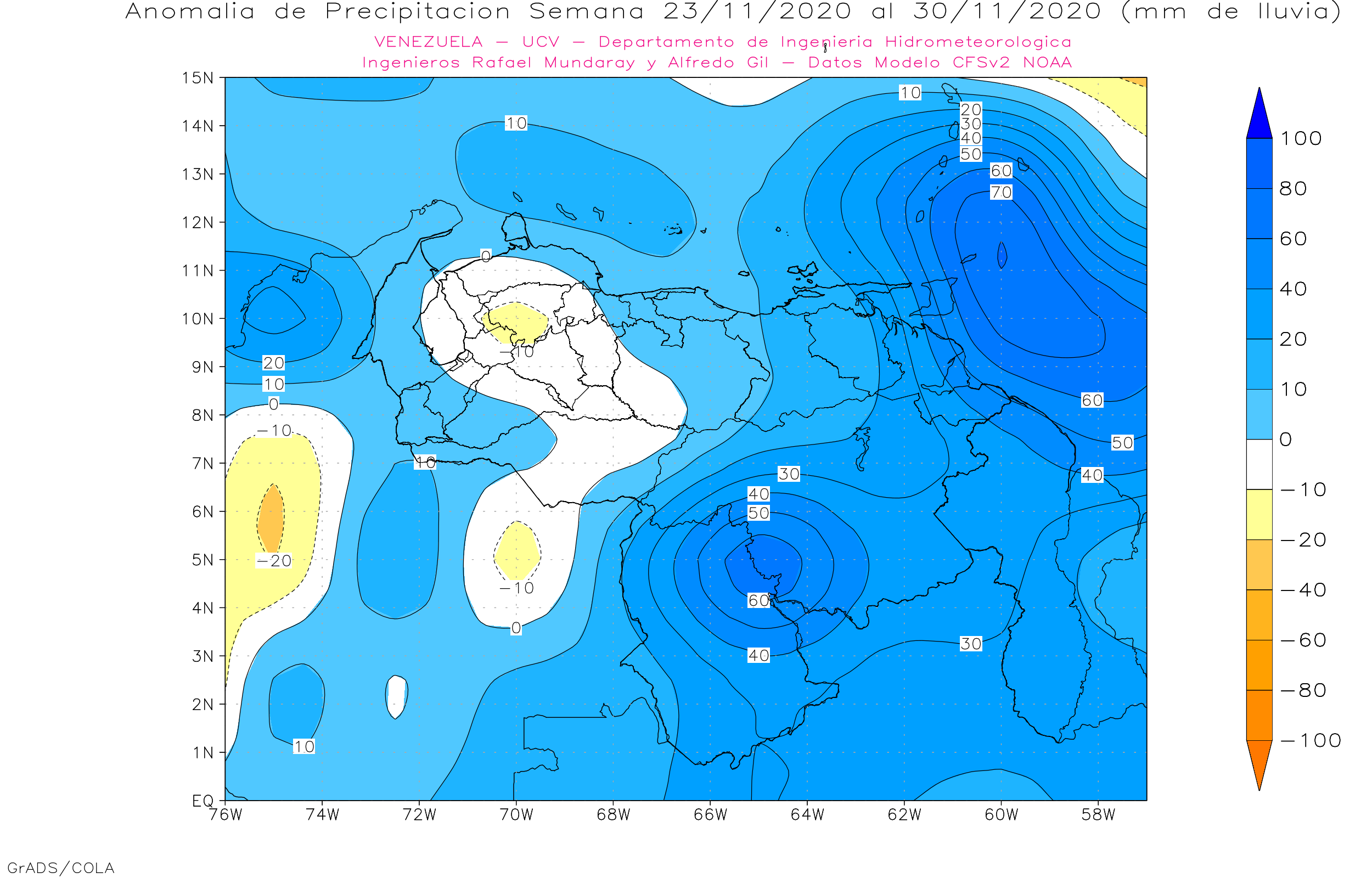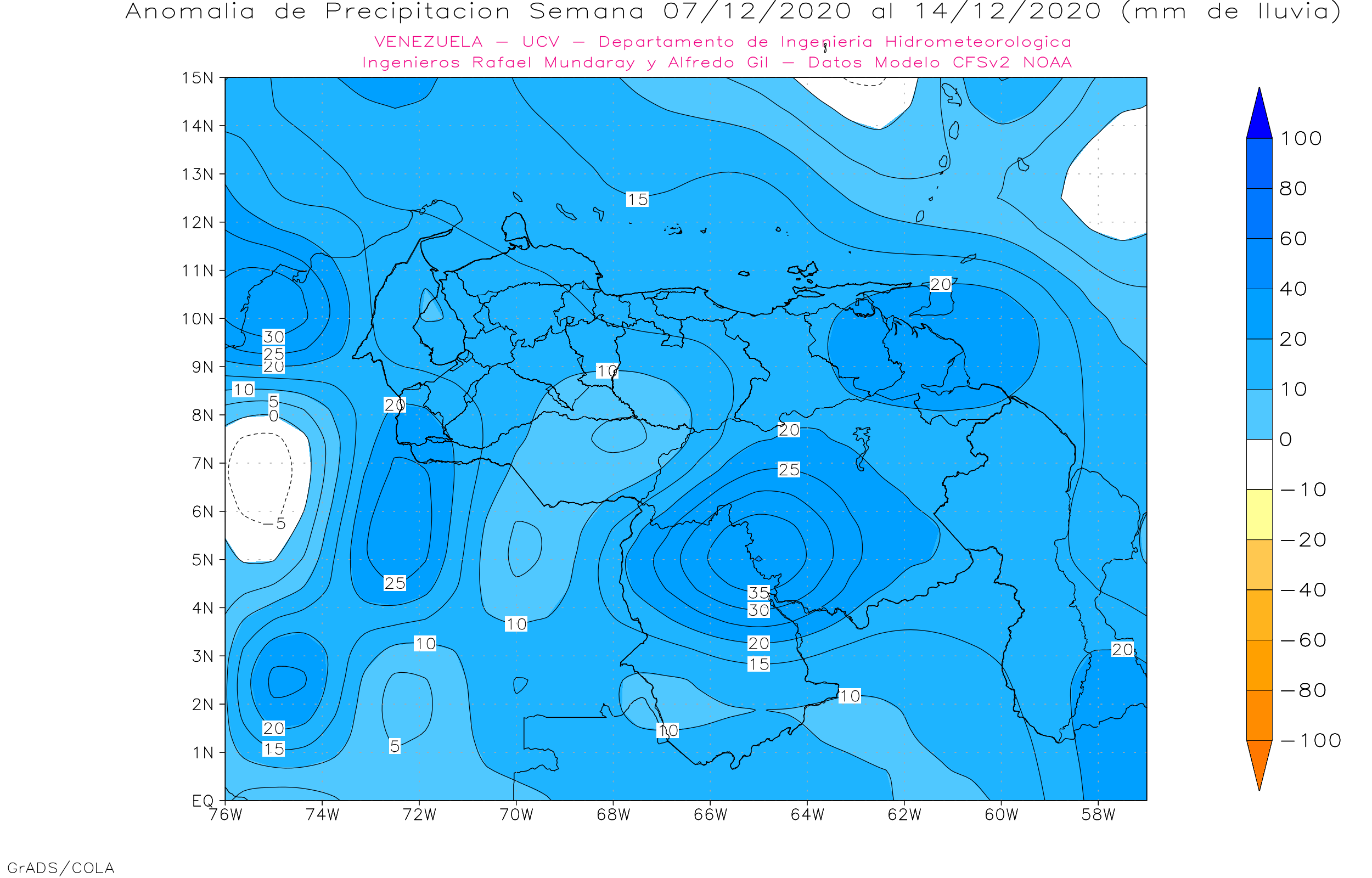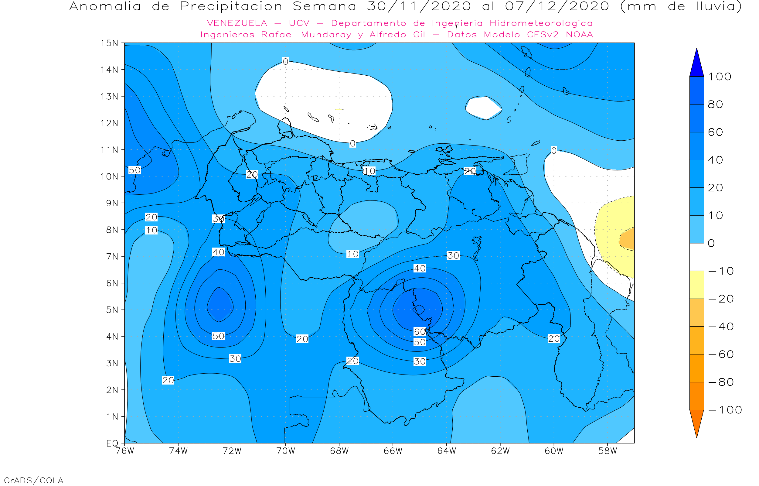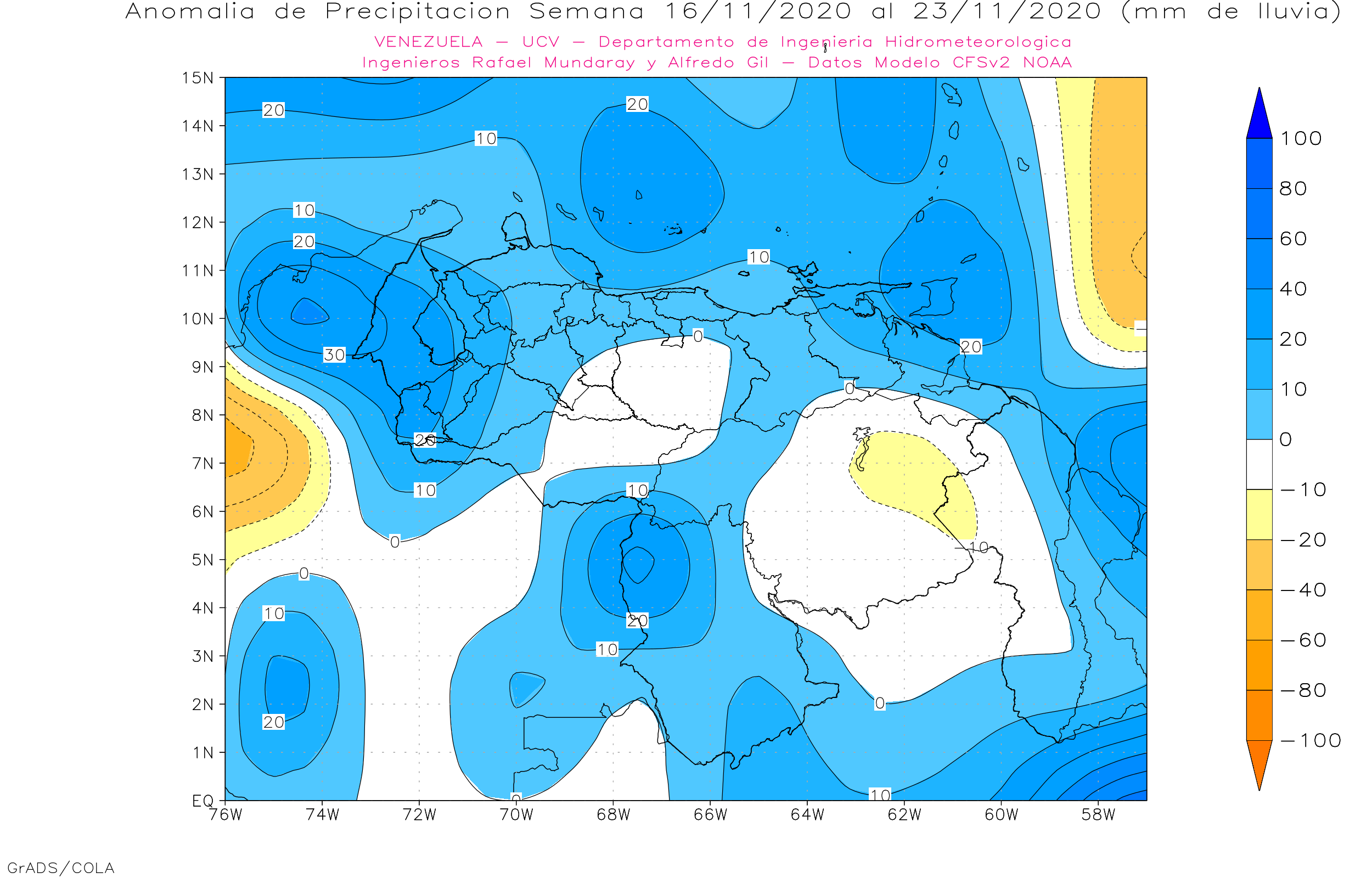 Pronostico subestacional de Anomalías de Precipitaciones Semanales para Venezuela, entre 16/11 al 14/12 de 2020, usando datos del Modelo CFSv2 de NOAA.
