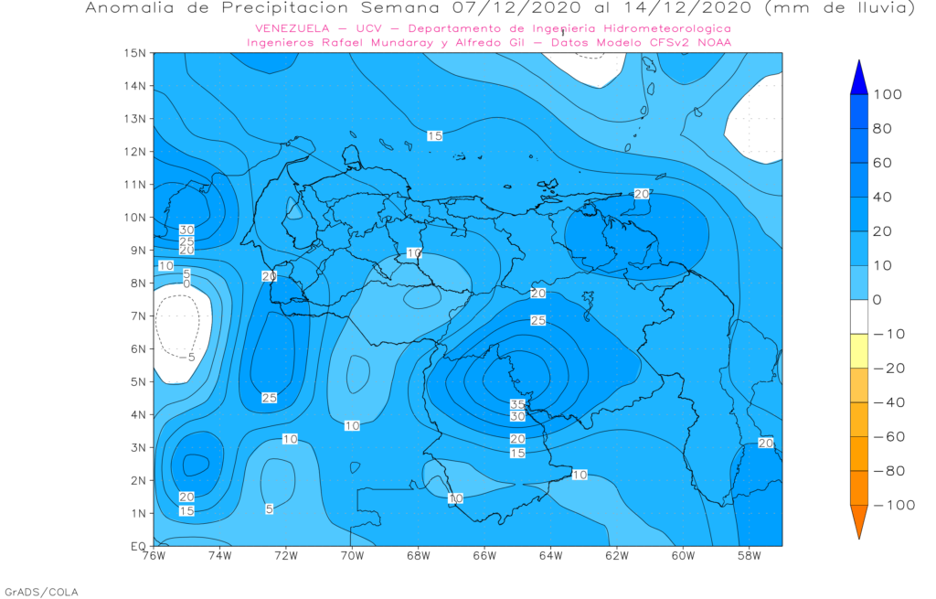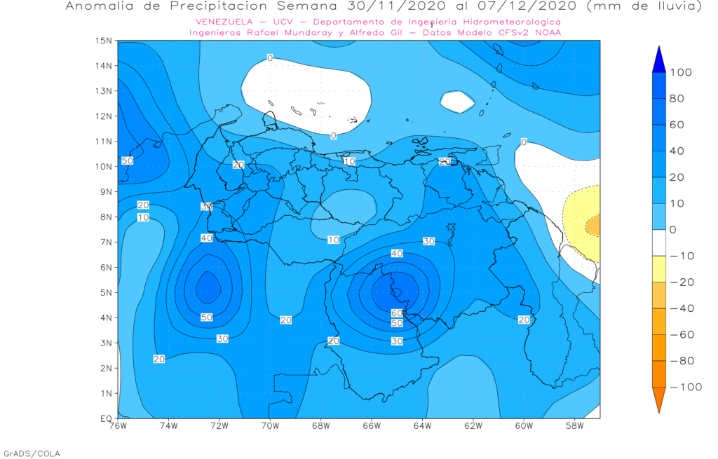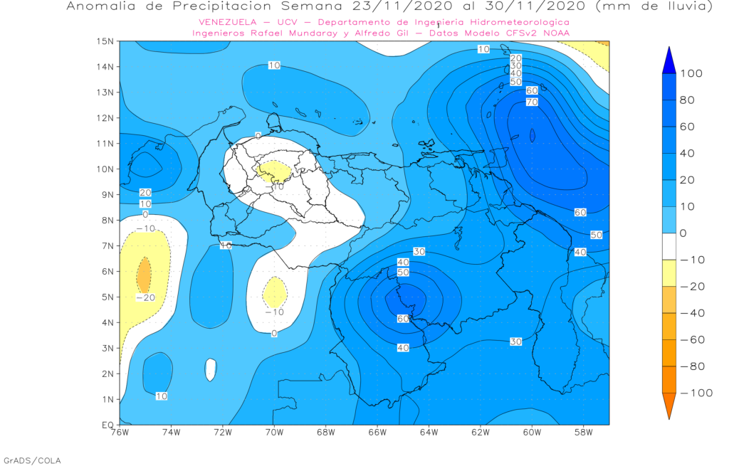 La semana del 16 al 23 de noviembre se espera en general precipitaciones cercana a la media histórica, destacando anomalías positivas en los andes, Amazonas y en el occidente de Zulia.