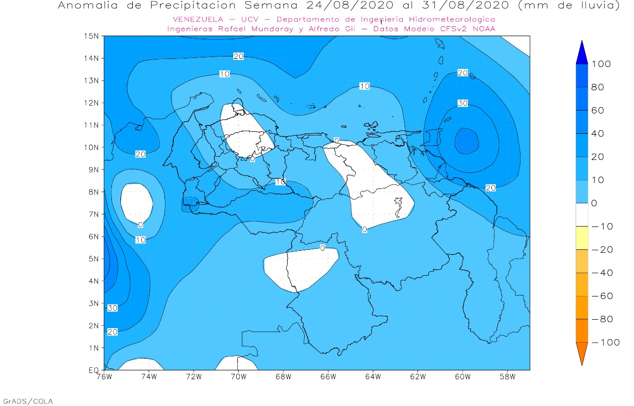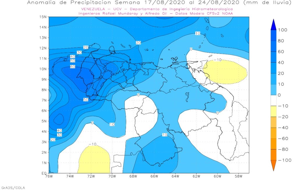 La semana del 17 al 24 de agosto, las principales anomalías positivas se esperan en los andes, Zulia, Lara, Falcón y llanos occidentales, el resto con eventos cercano al promedios histórico.