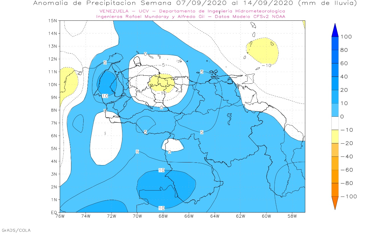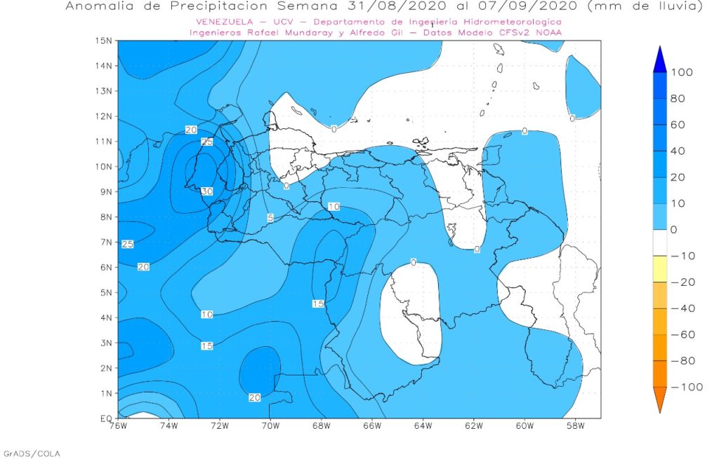 La semana del 31 de agosto al 07 de septiembre, se prevé las anomalías mas importante sobre Zulia y este de Barinas, el resto del país cercano al promedio histórico.