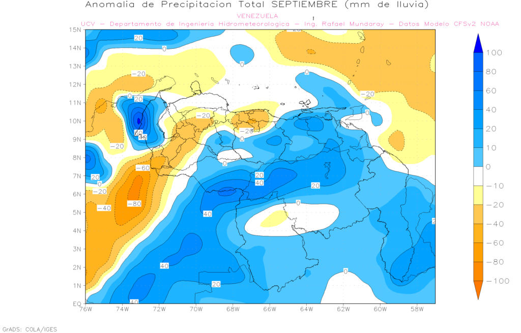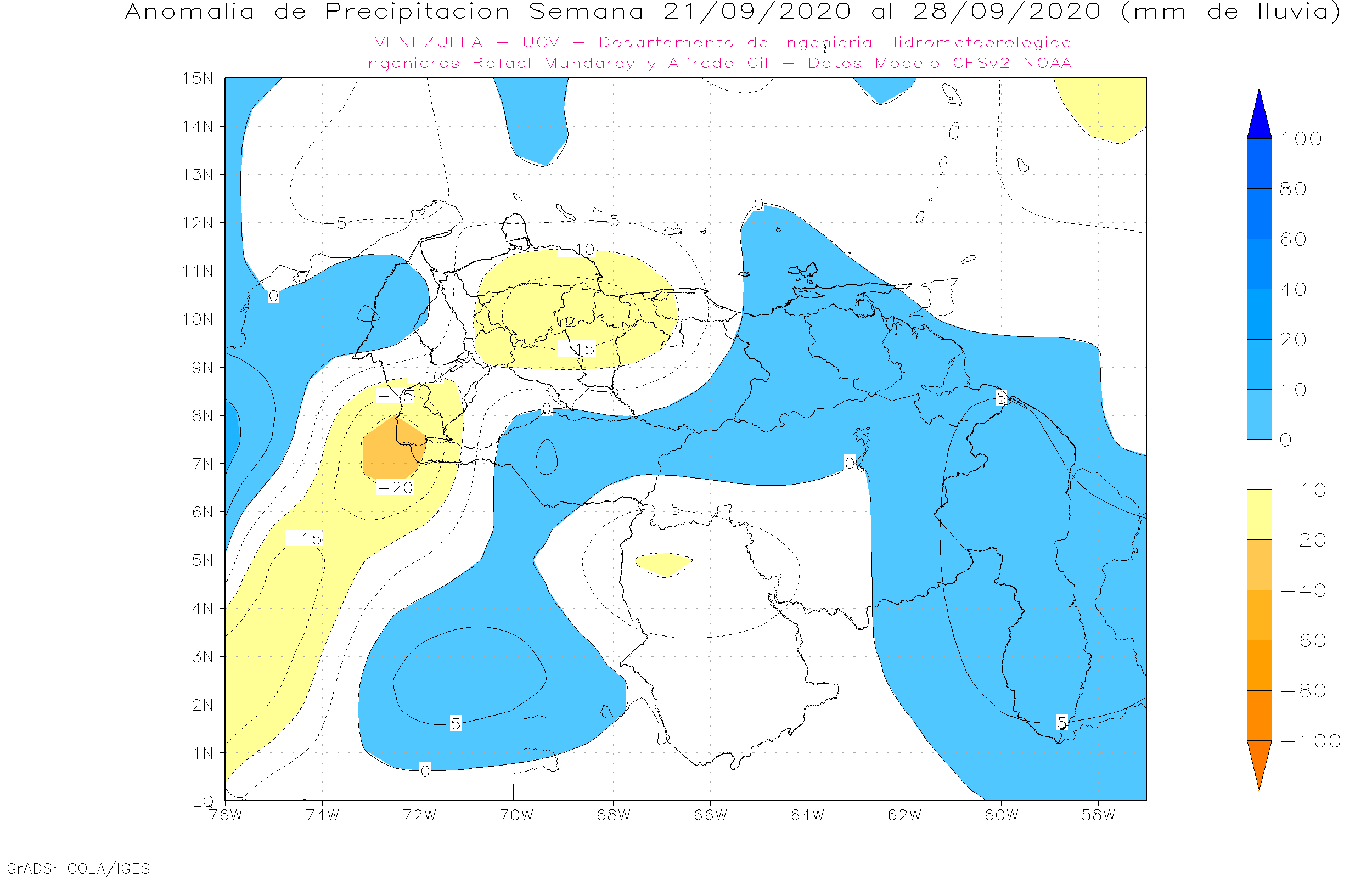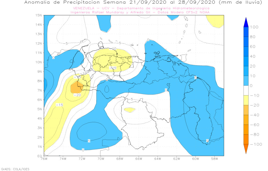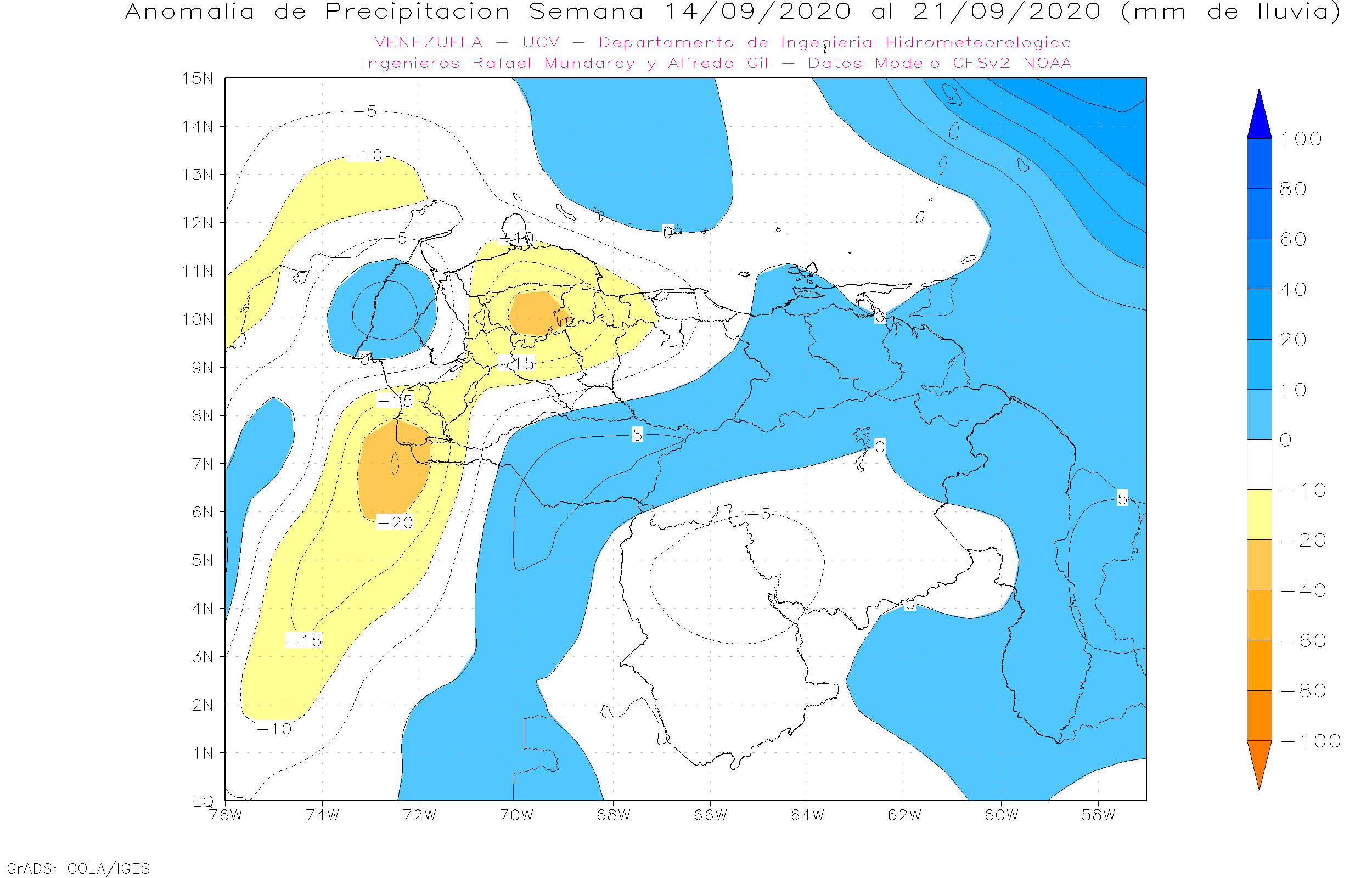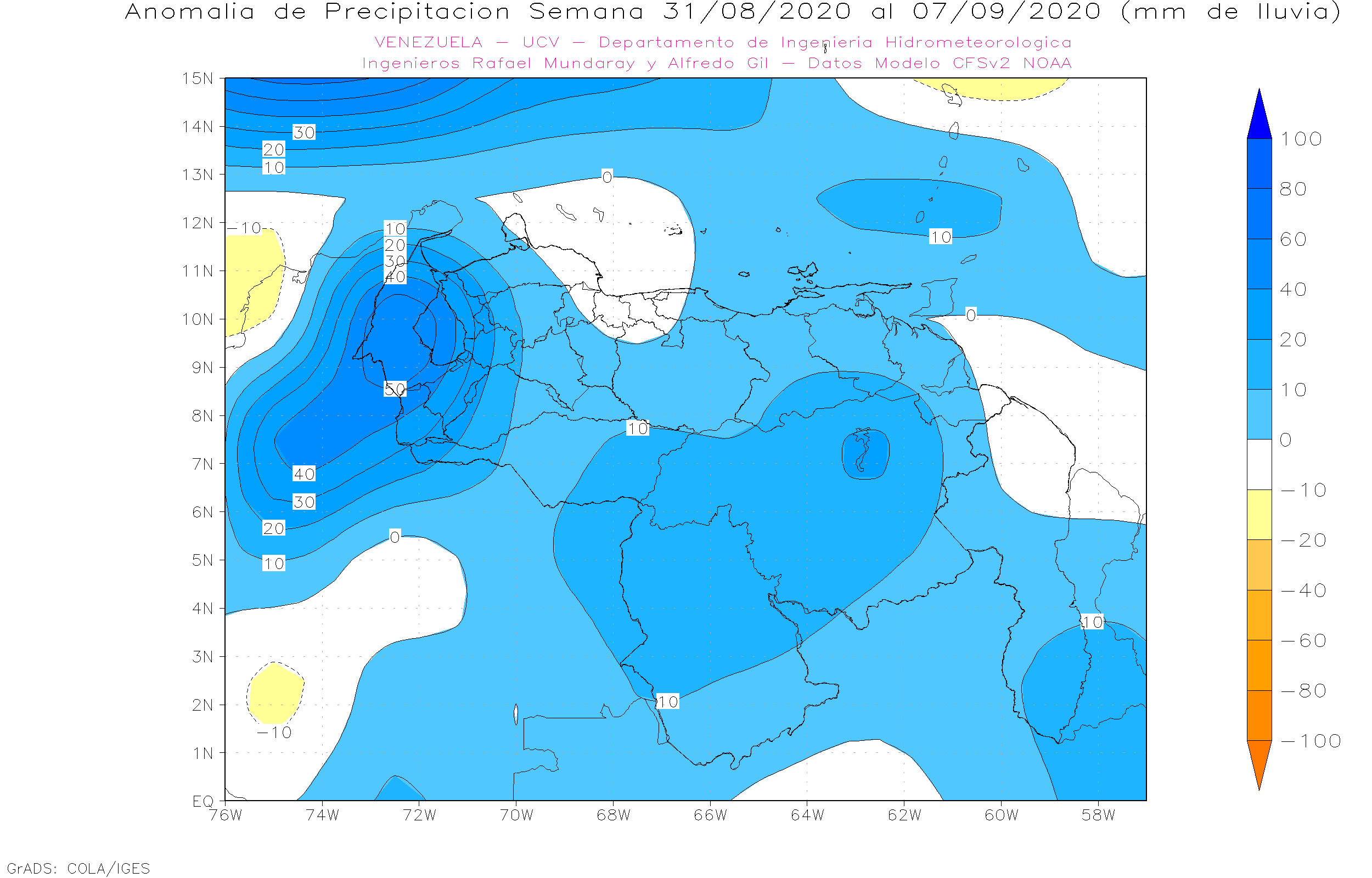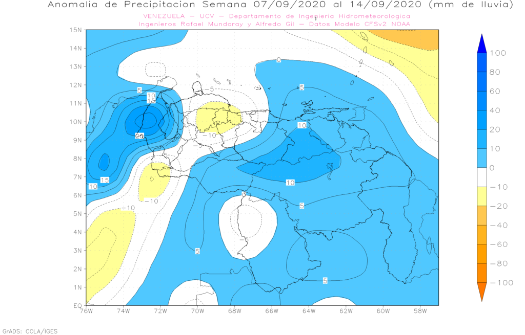 Para la semana del 07 al 14 de septiembre, se esperan anomalías positivas de precipitaciones en el oriente del país y occidente del Zulia, anomalías negativas en la región andina, Lara, Yaracuy y Carabobo.