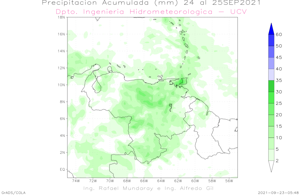 Entre el 24 al las 08:00 HLV y el 25 a las 8:00 HLV de septiembre se prevé eventos de precipitaciones en casi todo ele territorio nacional, los mas importantes en la región oriental, norte de Amazonas y este de Guárico