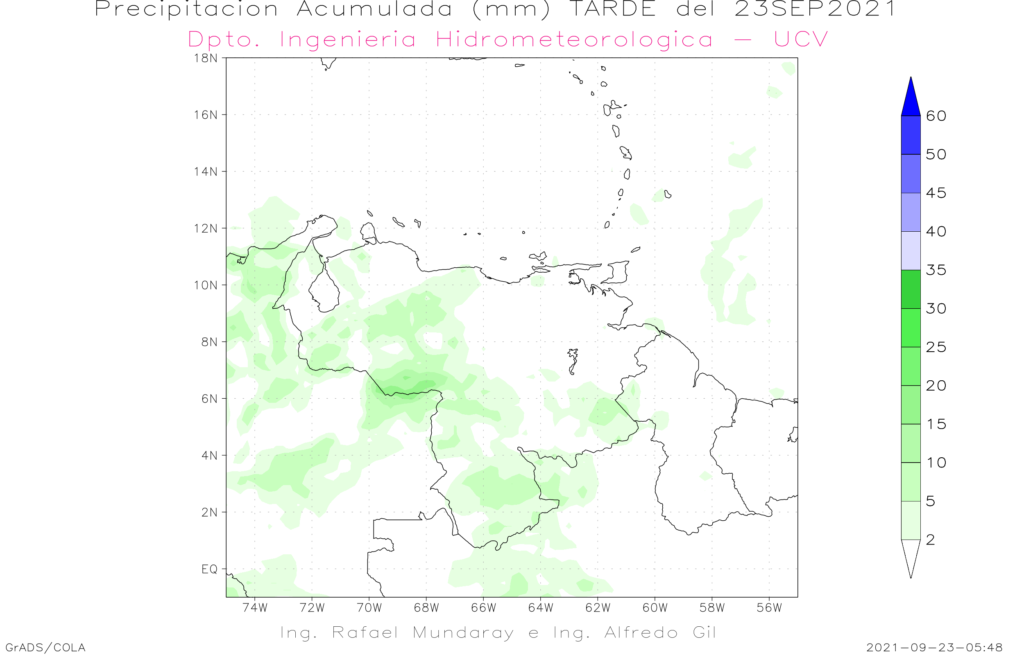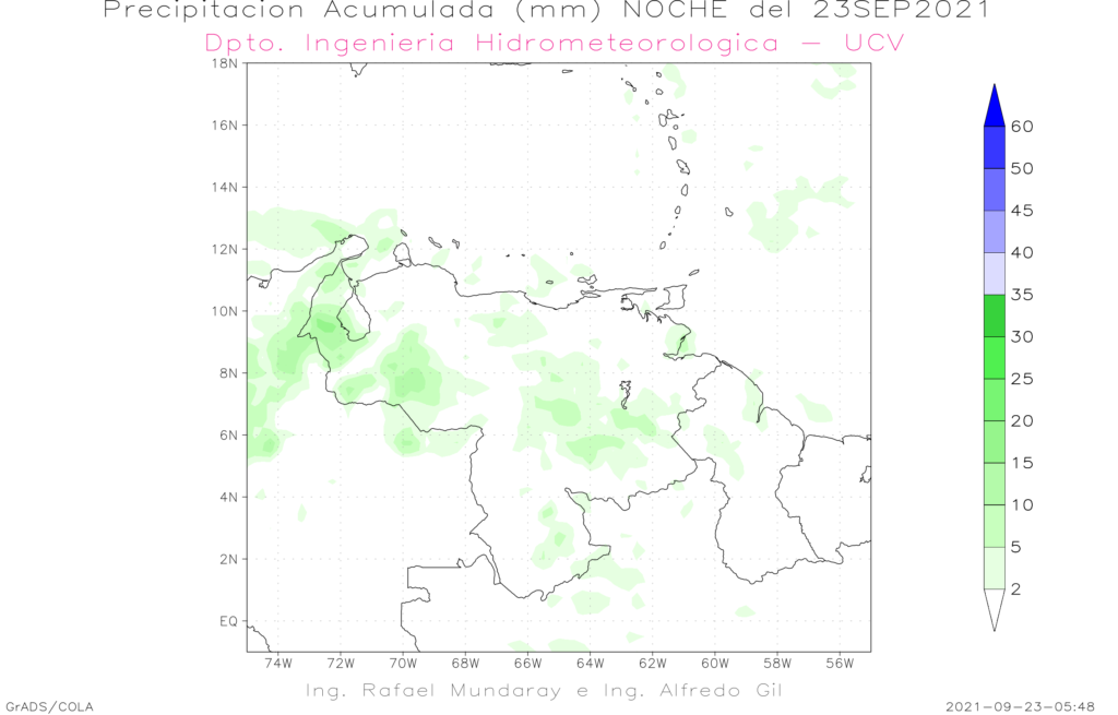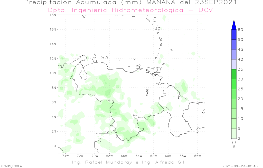 Entre el 23 al las 08:00 HLV y el 24 a las 8:00 HLV de septiembre se prevé eventos precipitaciones en casi todo el territorio nacional, los eventos mas importantes se esperan Zulia, región andina, llanos occidentales, Bolívar, y sur de Amazonas. Se espera que se mantengan las lluvias durante la mañana en Apure, sur de los estados Amazonas y Guárico, luego en horas de la tarde se deben reactivar los eventos de precipitaciones