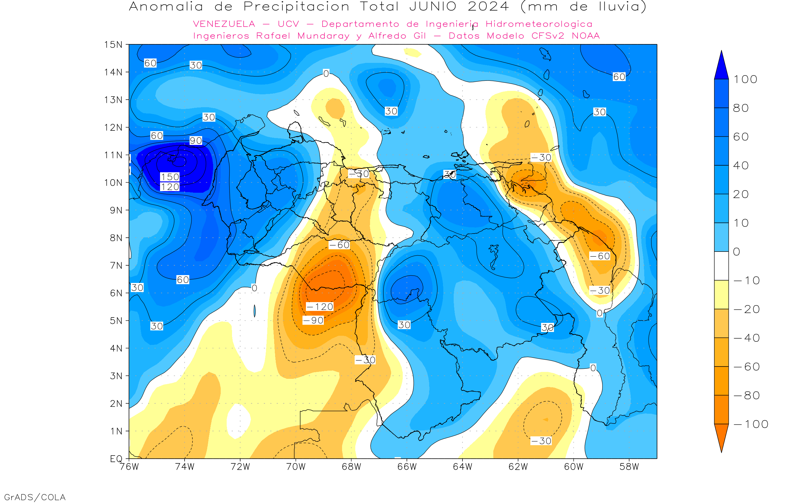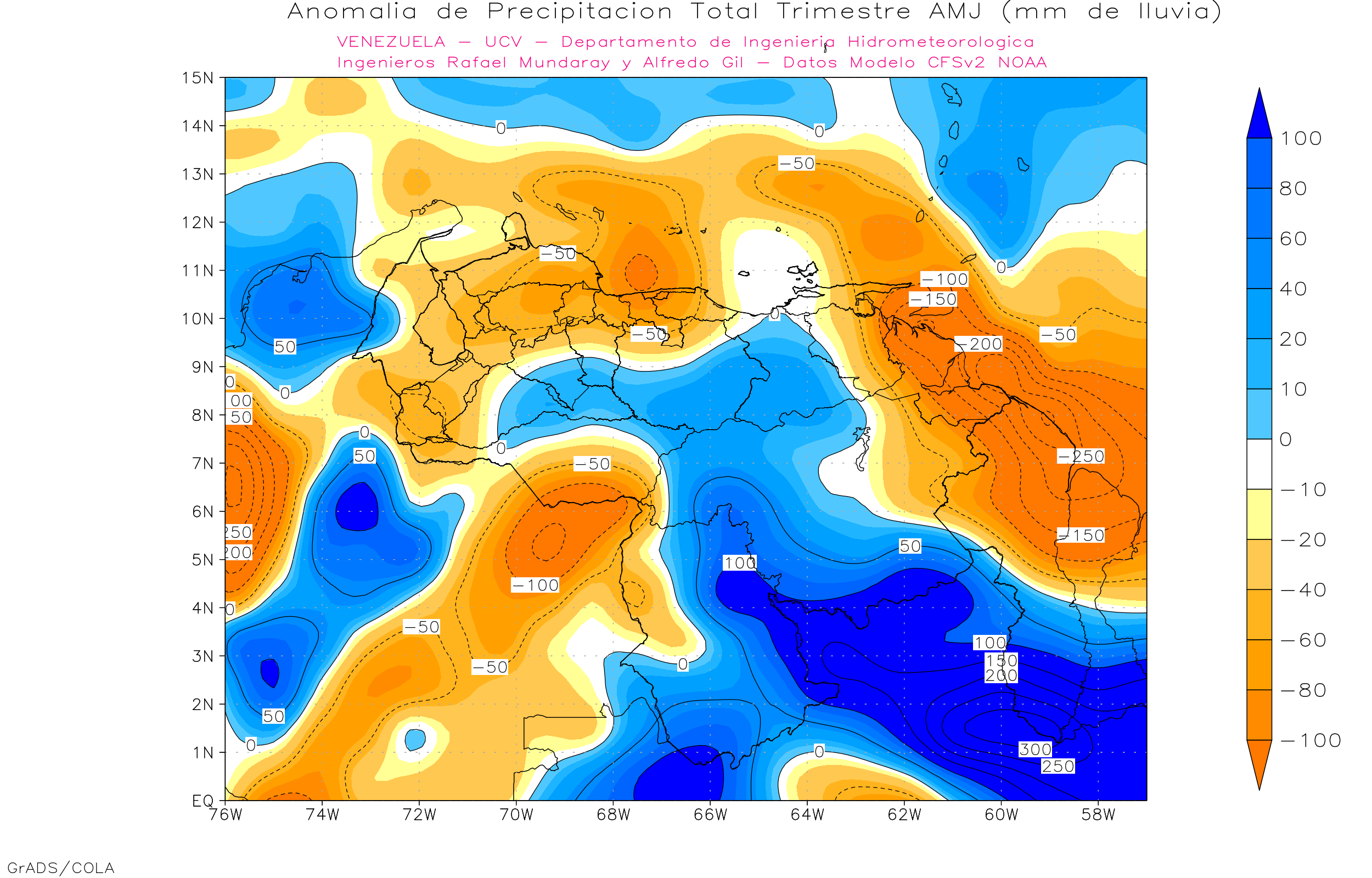 De acuerdo a la estadística de la precipitación estimada ( NOAA NCEP CPC CMORPH, daily_calculated) durante el trimestre Abr-May-Jun, los principales eventos de precipitaciones se ven en Amazonas, sur Bolívar y sur0oeste de Zulia, por encima del 7° nortes precipitaciones por debajo de los 300 mm, por debajo de los 7° N la precipitación entre 700 y 1300 mm.