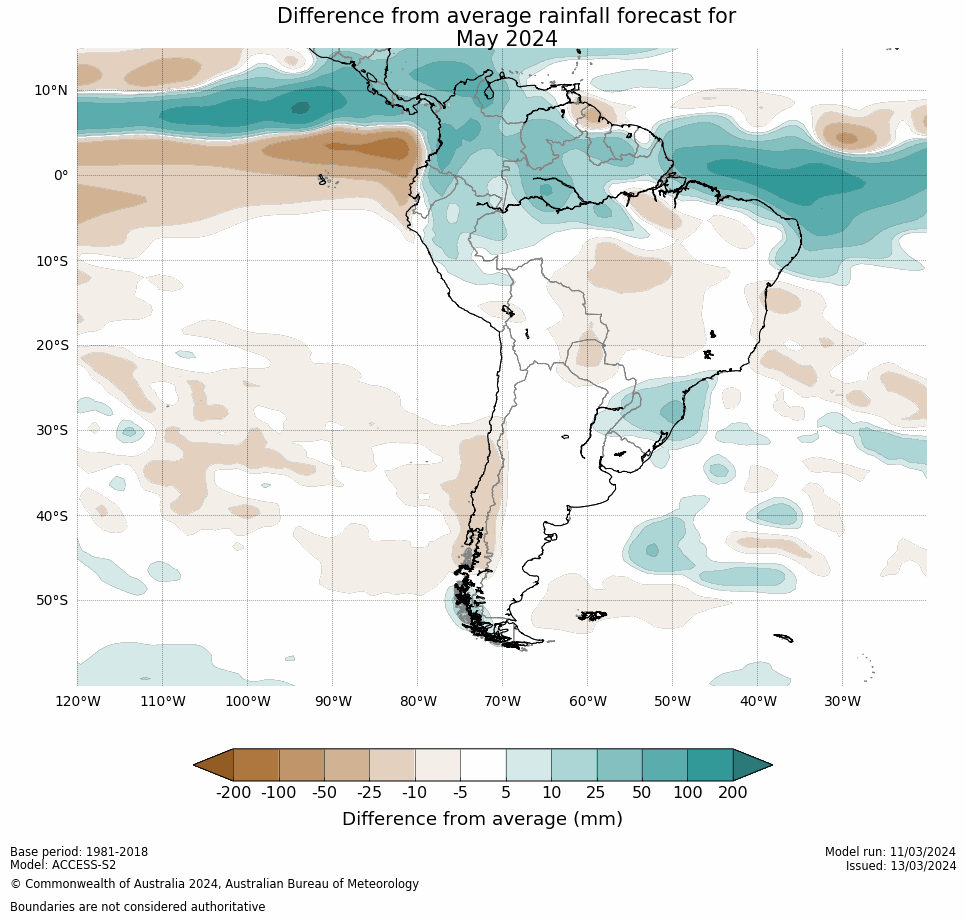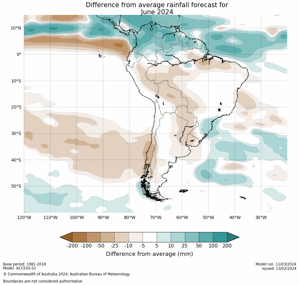 The North American Multi-Model Ensemble (NMME), Deutscher Wetterdienst de Alemania, Meteo France de Francia, ECMWF europeo, Met Office de Inglanterra, IRI, Australia Bureau of Meteorology, emperical, Integrated del CPTEC Brasil y CFSv2 de Estados Unidos. Se observa que el comportamiento de la precipitación para el trimestre Abr – Jun/2024 el 80% de los modelos ubican gran parte del país por encima de la media y se observa que la temporada de lluvia llegara en proemdio para el sur del país..