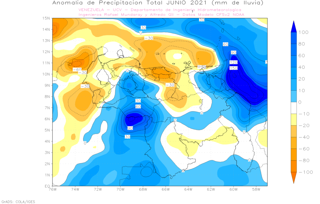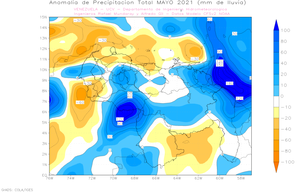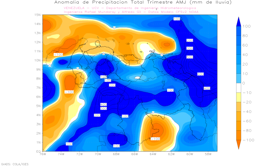 Evaluando 6 modelos de pronósticos estacionales de precipitaciones, de diferentes países (Met Office de Inglaterra, Deutscher Wetterdienst de Alemania, Meteo France de Francia, ECMWF europeo, IRI y CFSv2 de Estados Unidos). Se observa en general, para el trimestre abr-may-jun de 2021, existen coincidencia que al sur del país (Bolívar y Amazonas) con anomalías positivas de precipitaciones, la región costera (Aragua, Vargas, Miranda, Falcón y norte de Zulia), se prevé anomalías negativas de precipitaciones, el resto del país no existe coincidencia entre los modelos.