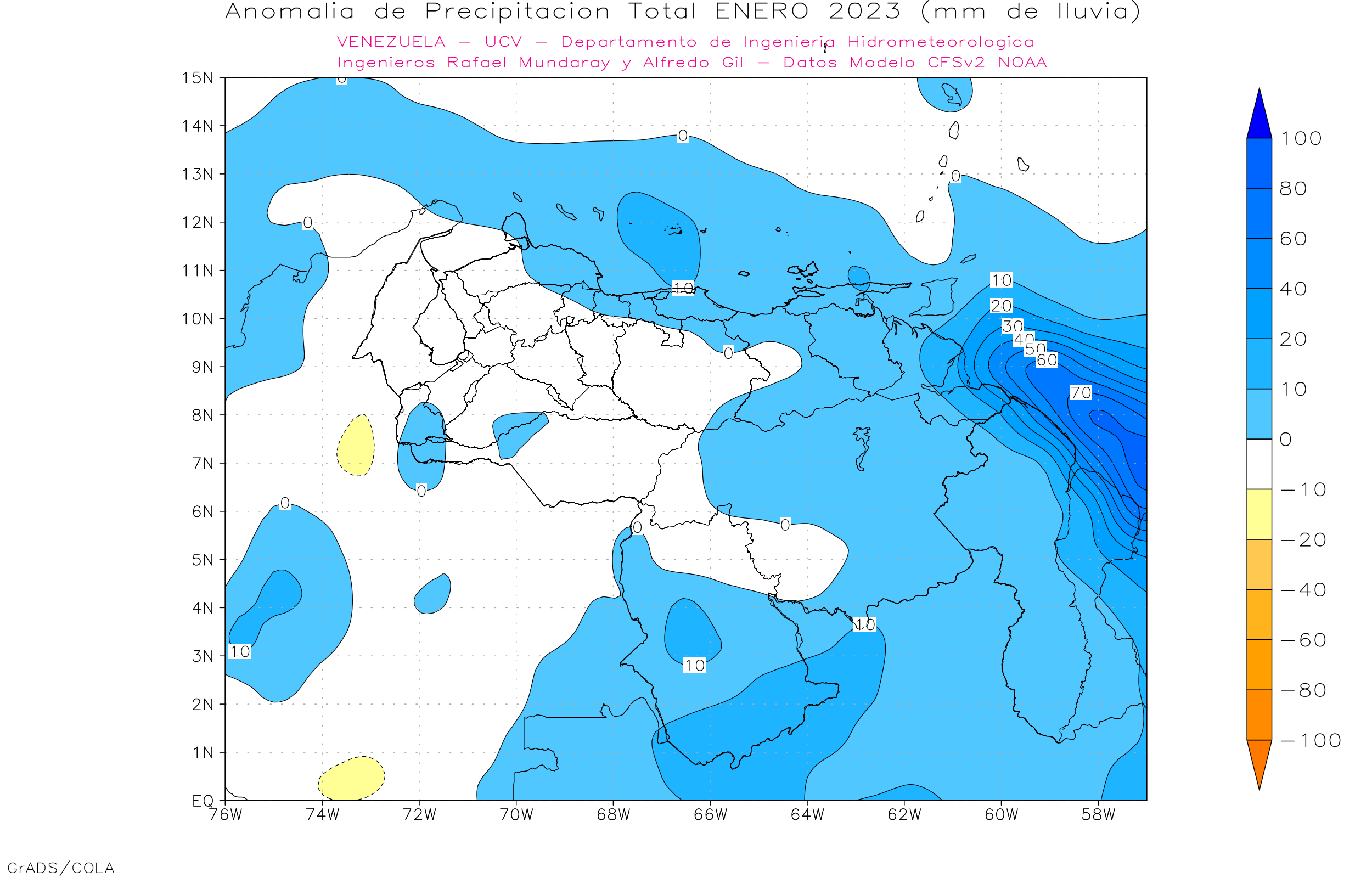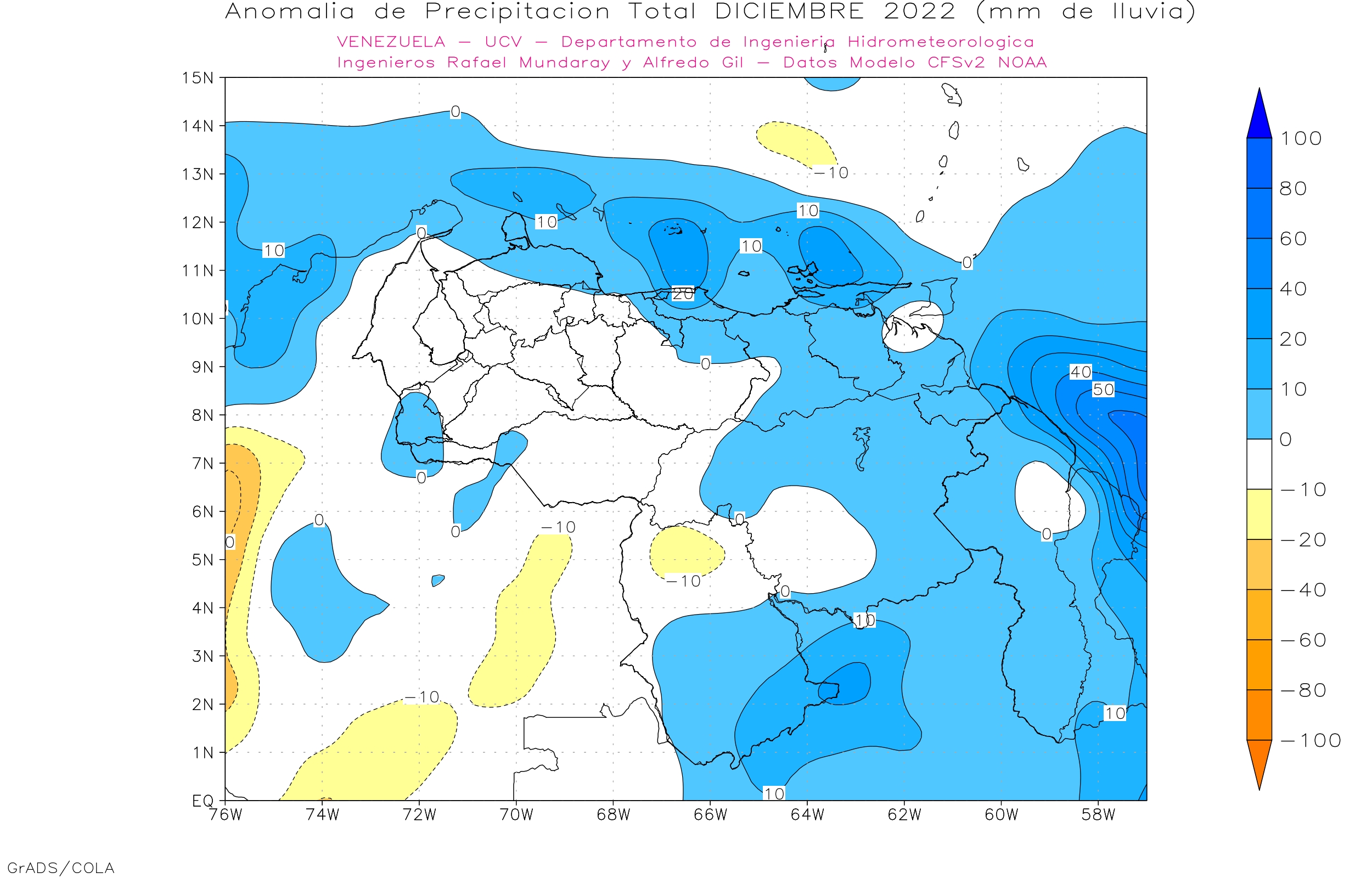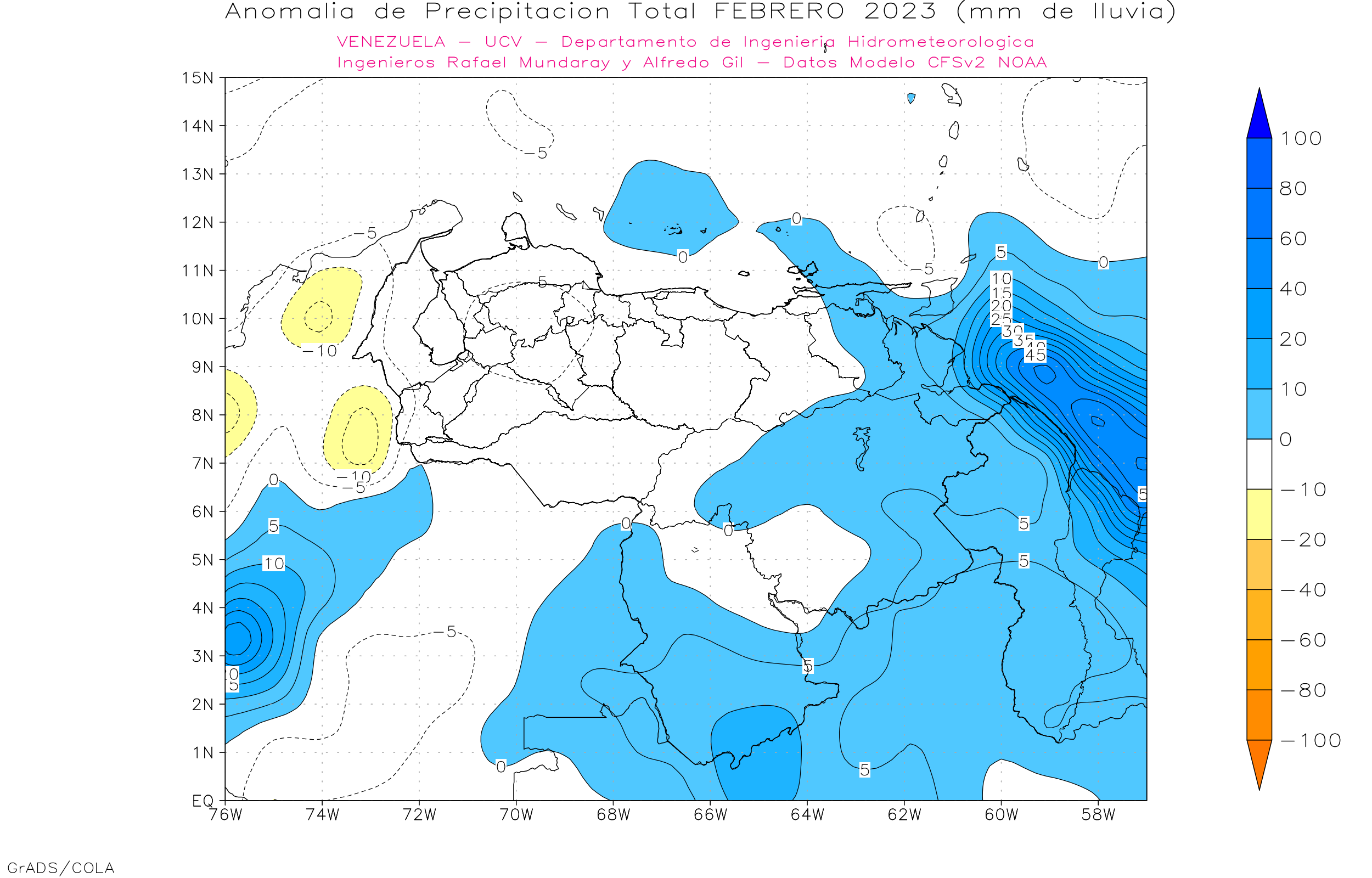De acuerdo a la estadística de la precipitación estimada ( NOAA NCEP CPC CMORPH, daily_calculated) durante el trimestre Dic 2022-Ene-Feb 2023, los principales eventos de precipitaciones se ven en sureste de Amazonas y sur de Bolívar, los menores eventos se observa en la franja norte costera, llanos centrales, occidentales y orientales, las precipitaciones por encima de los 150 mm se ubican al sur de 6° norte y sur del lago de Maracaibo.