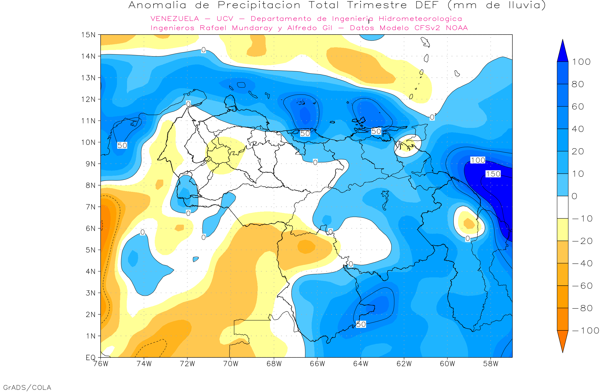 Los estados occidentales (Zulia, Lara, Falcón) 4 (57.1%) modelo dan anomalías positivas y 3 (42.9%) dan precipitaciones promedio.