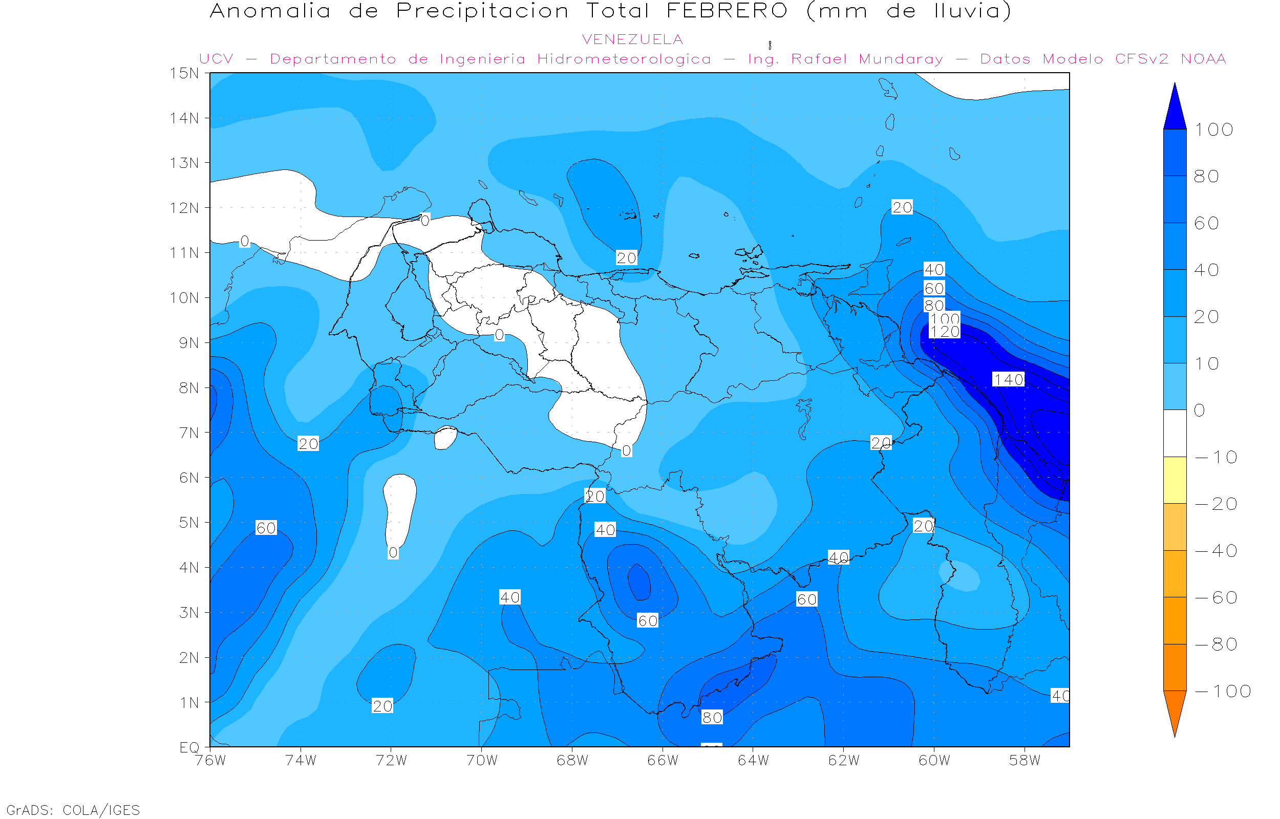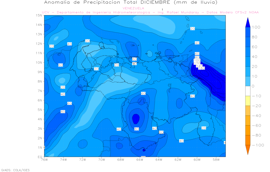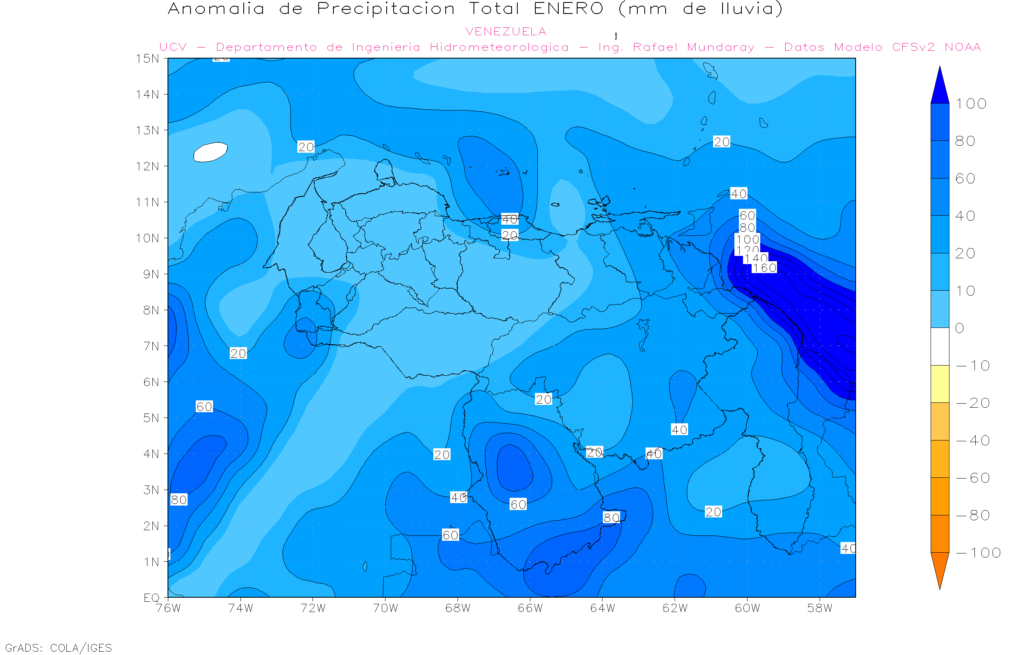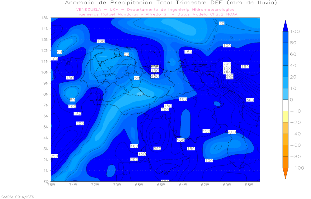 Evaluando 8 modelos de pronósticos estacionales de precipitaciones, de diferentes países (Met Office de Inglaterra, Deutscher Wetterdienst de Alemania, Meteo France de Francia, ECMWF europeo, IRI y CFSv2 de Estados Unidos, y los modelos integrado y empírico, del CPTEC de Brasil). Se observa en general, para el trimestre diciembre 2020 a febrero 2021, eventos de precipitaciones por encima de la media histórica, en casi todo el territorio nacional. Las área que presentan mayor coincidencia de anomalías de precipitaciones positivas importantes son: Cuenca del Río Caroní, los andes y la región norte costera.
