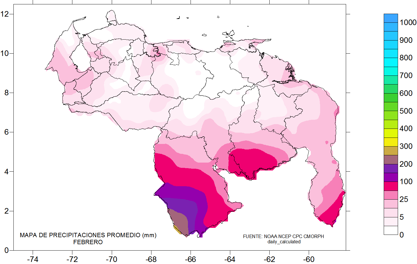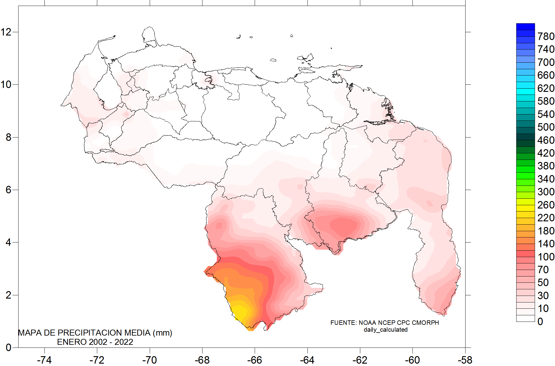 En los mapas de la estadística de la precipitación estimada ( NOAA NCEP CPC CMORPH, daily_calculated) durante los meses enero, febrero y marzo, se observa que enero ese presenta una reducción importante de la precipitaciónes, a partir de febrero comienza el incremento de los eventos de precipitaciones al sur del país y se mantiene el icnremento en marzo al sur.