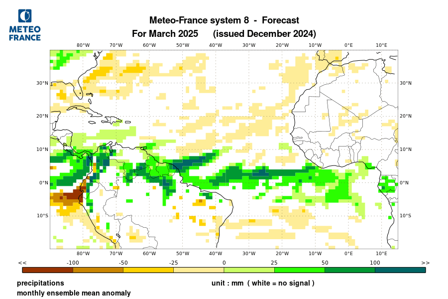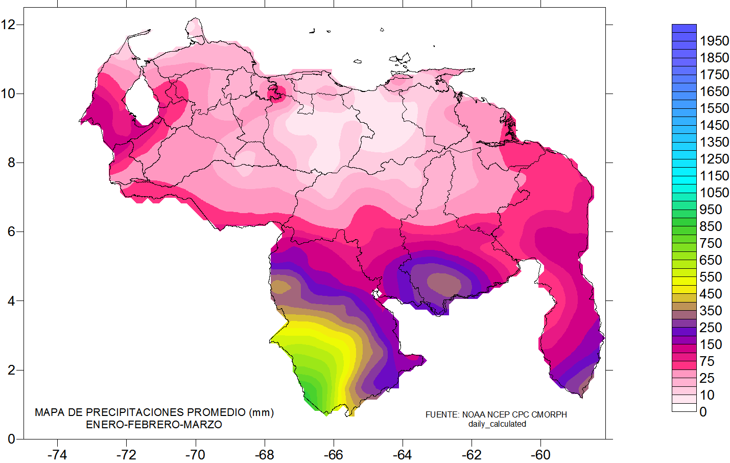 De acuerdo a la estadística de la precipitación estimada ( NOAA NCEP CPC CMORPH, daily_calculated) durante el trimestre Ene-Feb-MAR, los principales eventos de precipita 80 y 650 mm, por encima del 7° nortes precipitaciones por debajo de los 75 mm, por debajo de los 7° N la precipitación entre 80 y 650 mm. A lo largo de costa las precipitaciones por debajo de los 25 mm. precipitaciones típica de la temporada de pocas precipitaciones.