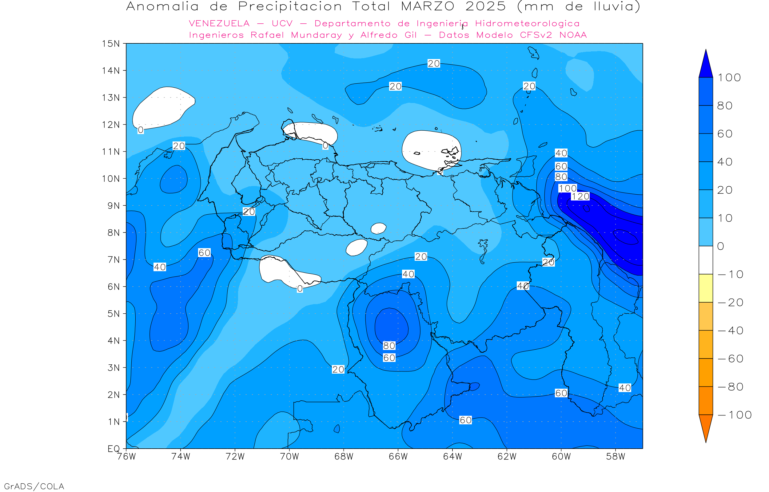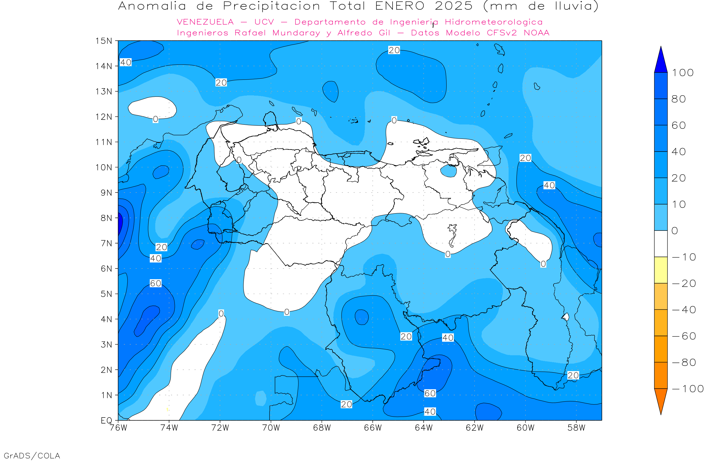 Mapas de pronostico mensual del modelo Seasonal climate forecast from CFSv2. NOAA, The North American Multi-Model Ensemble (NMME), Meteo France, Australia Bureau of Meteorology, durante enero se aprecia que el oeste y sur del país se presenta anomalías positivas de precipitación en tres modelos, el cuarto solo occidente y anomalías negativas hacia oriente. Para febrero casi todo el país con anomalías positivas, exceptuando los llanos occidentales que se ubica en promedio. En marzo todo el país con anomalías positivas de precipitación. Hay que destacar que esta tendencia del incremento de las anomalías positivas como van avanzando los meses, se ha venido observando en las últimas salidas de pronóstico de meses pasados.