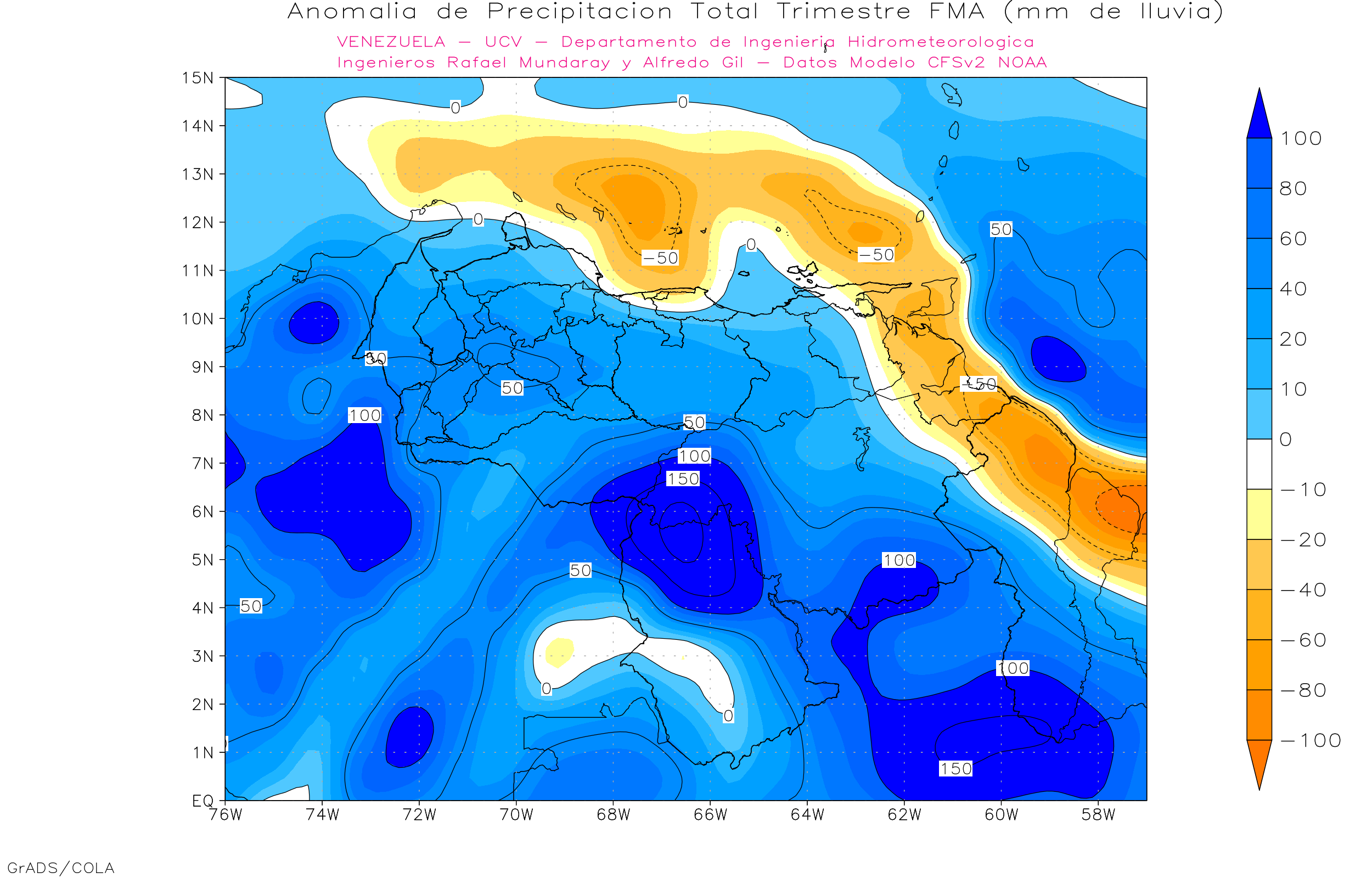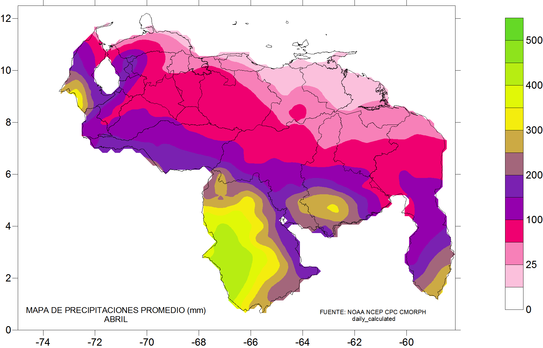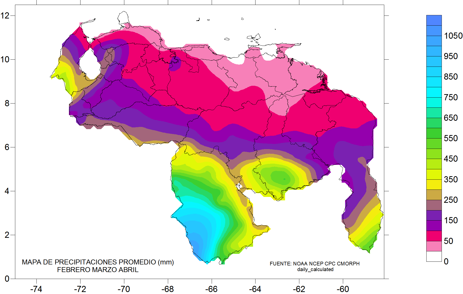 De acuerdo a la estadística de la precipitación estimada ( NOAA NCEP CPC CMORPH, daily_calculated) durante el trimestre Feb-Mar-Abr, los principales eventos de precipitaciones se ven en al suroeste de Amazonas, sur Bolívar y sur0oeste de Zulia, por encima del 6° nortes precipitaciones por debajo de los 200 mm, por debajo de los 6° N la precipitación entre 300 y 800 mm.