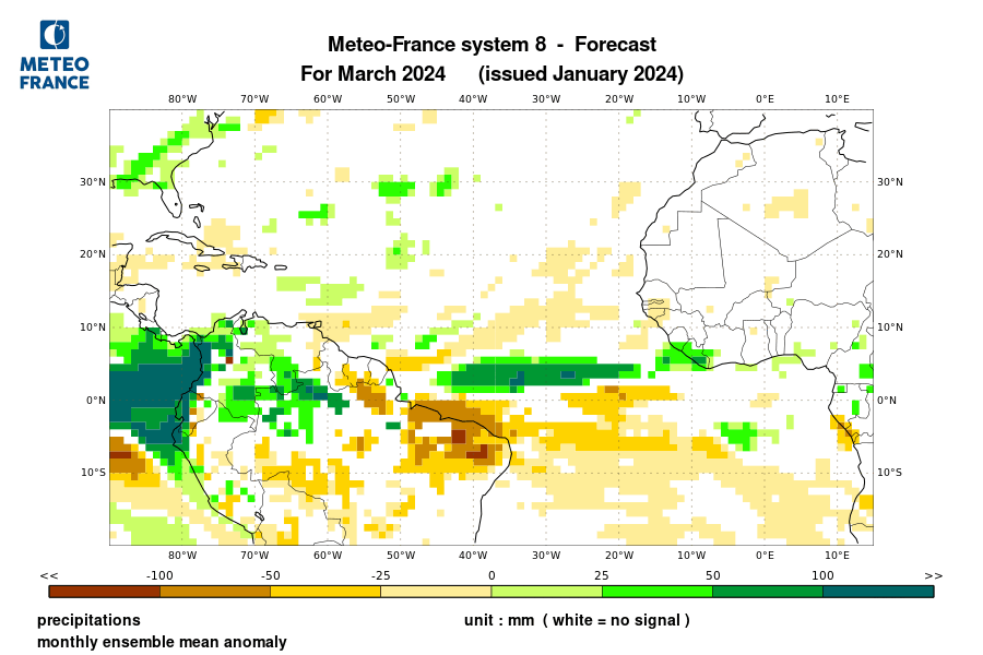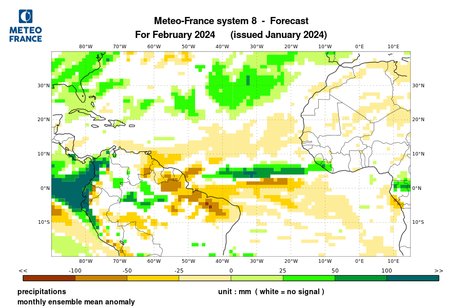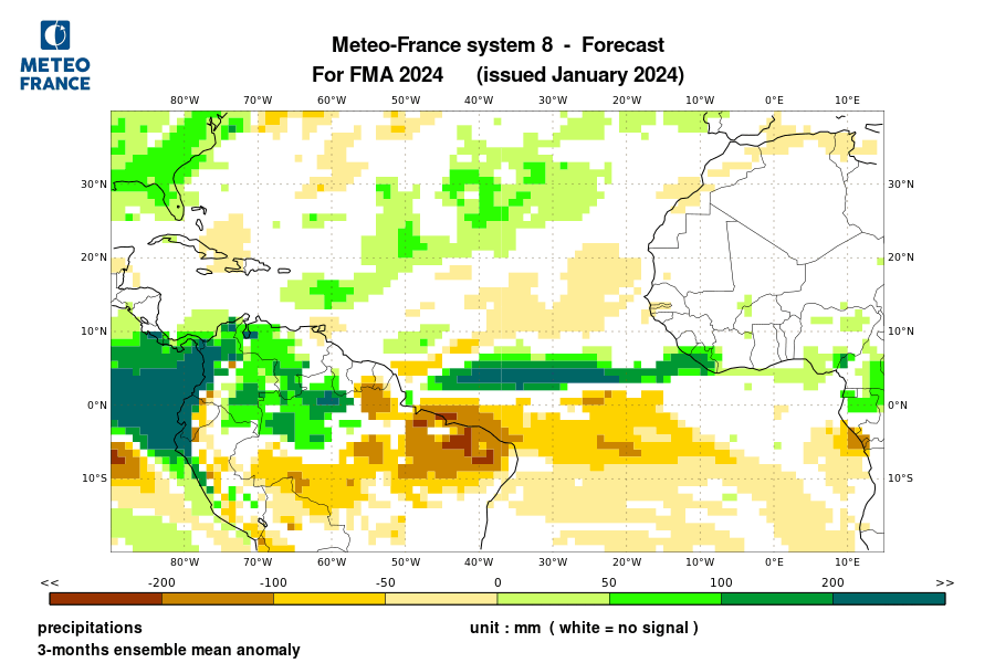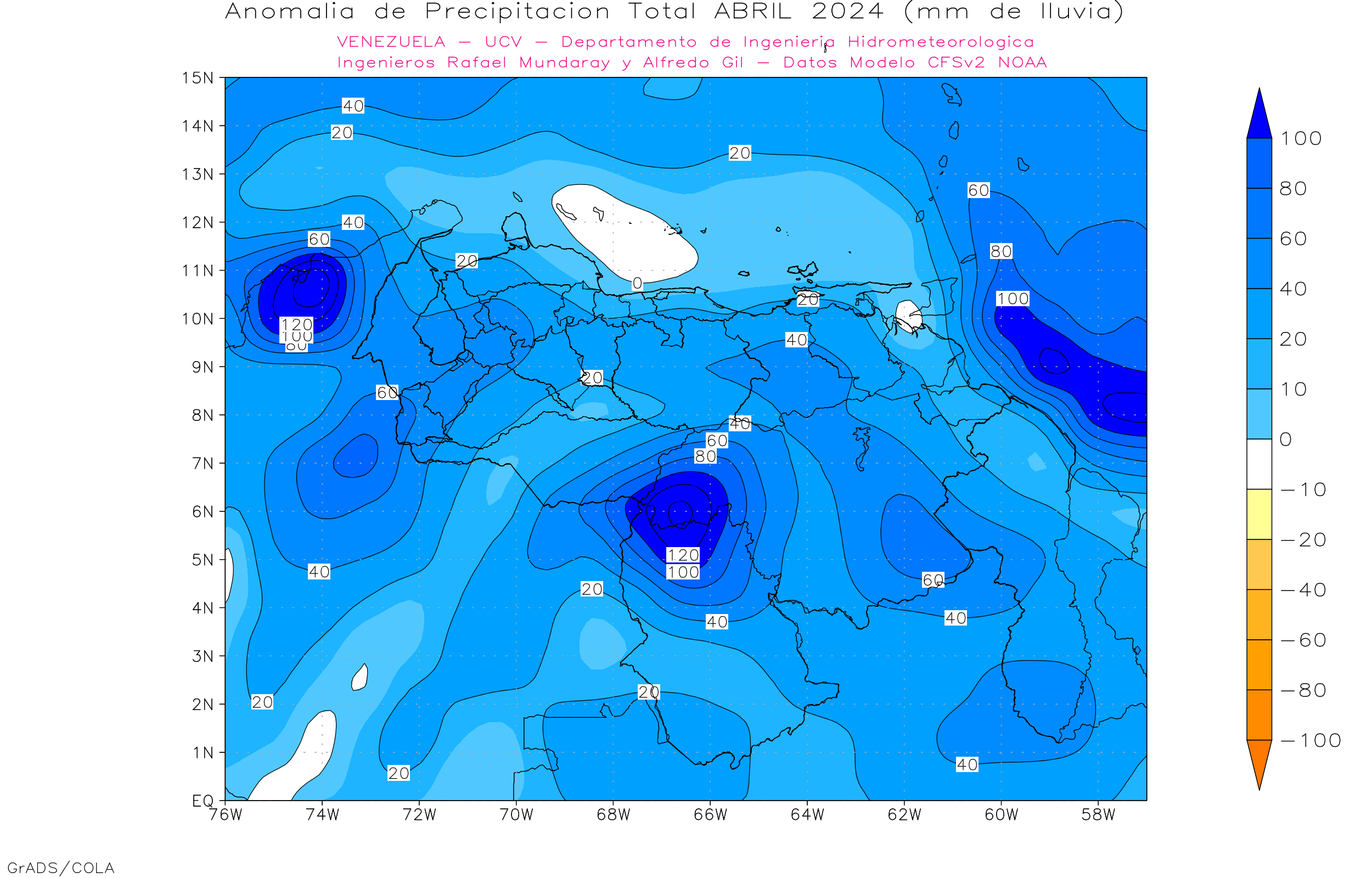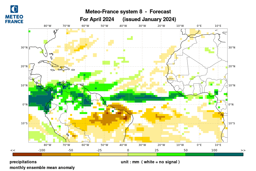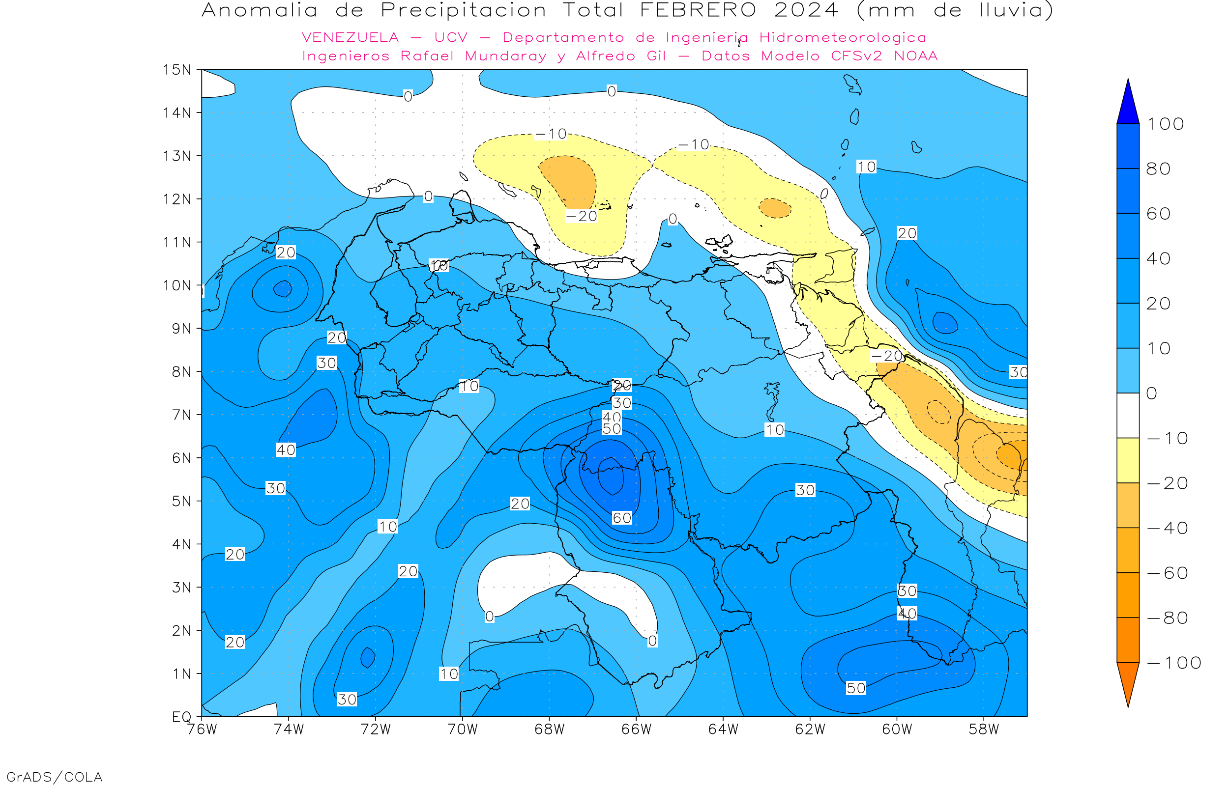 The North American Multi-Model Ensemble (NMME), Deutscher Wetterdienst de Alemania, Meteo France de Francia, ECMWF europeo, Met Office de Inglanterra, IRI, Australia Bureau of Meteorology, emperical, Integrated del CPTEC Brasil y CFSv2 de Estados Unidos. Se observa que el comportamiento de la precipitación para el trimestre Feb – Mar/2024 algunos sectores de Venezuela se ubican por encima de la media, en lo cual coinciden muchos modelos. Febrero debe continuar el déficit de precipitaciones, disminuyendo estas para marzo e incrementándose las anomalías positivas en abril, exceptuando el Oriente se mantiene las anomalías negativas.