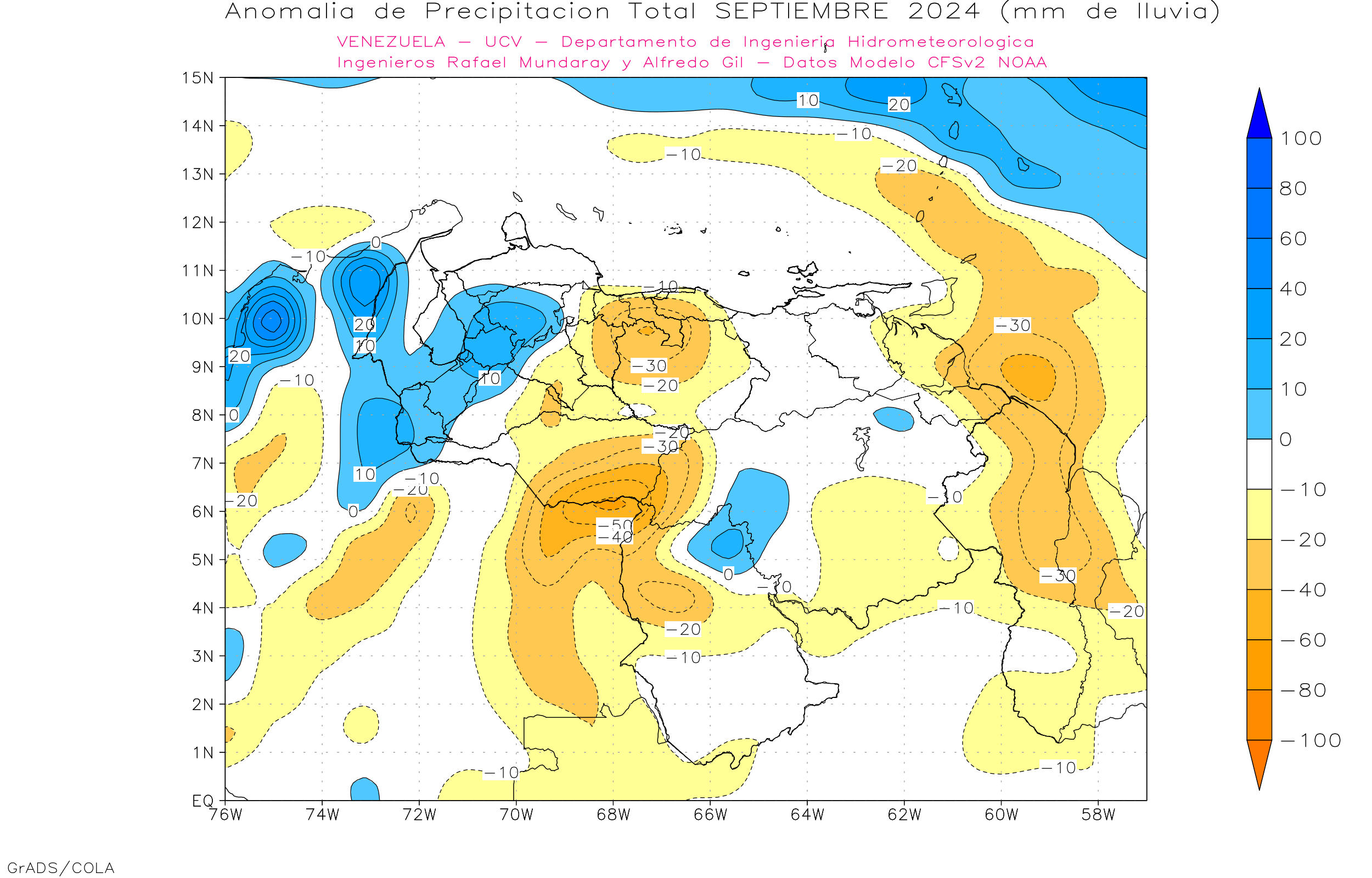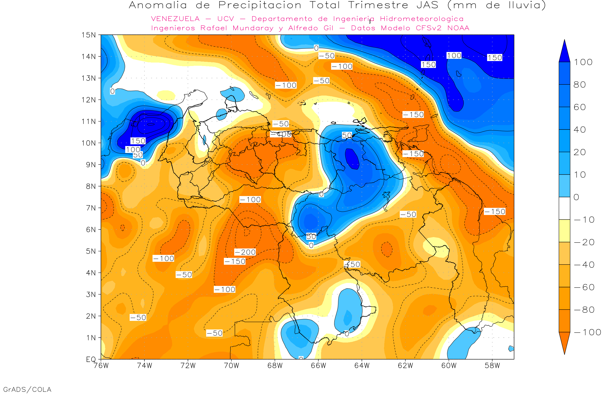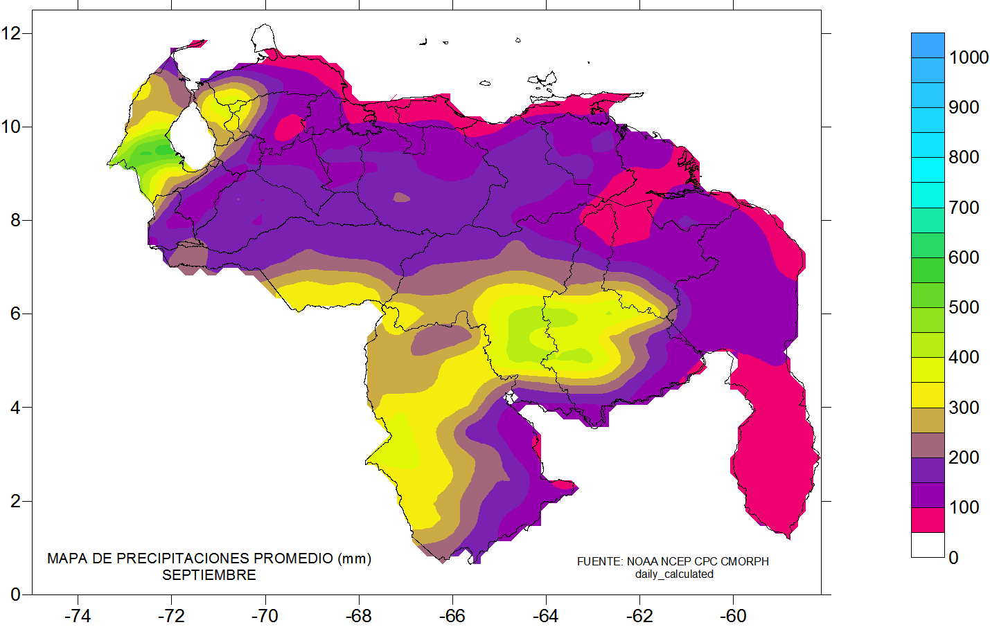 De acuerdo a la estadística de la precipitación estimada ( NOAA NCEP CPC CMORPH, daily_calculated) durante el trimestre Jul-Ago-Sep, los principales eventos de precipitaciones se ven en Amazonas, sur Bolívar y sur0oeste de Zulia con centro de precipitación entre 1200 y 1900 mm, por encima del 7° nortes precipitaciones por debajo de los 900 mm, por debajo de los 7° N la precipitación entre 900 y 1900 mm.