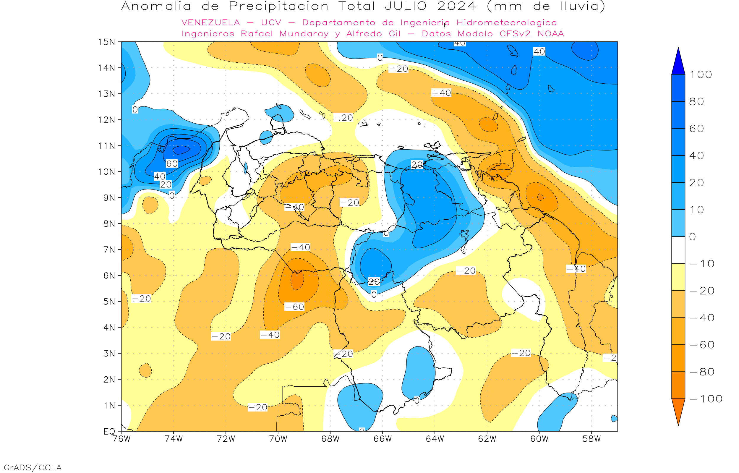 Mapas de pronostico mensual del modelo Seasonal climate forecast from CFSv2. NOAA, The North American Multi-Model Ensemble (NMME), Meteo France, Australia Bureau of Meteorology, no hay coincidencia para el pronóstico de junio, tres modelos dan valores porde bajo de la media en Amazonas, Bolívar y el oriente del país, el cuarto por encima de la media. Coinciden en precipitaciones por encima de la media en el occidente y los andes. La tendencia es el incremneto de las área con deficit de lluvia, en especial hacia el sur, oriente y llanos centrales.