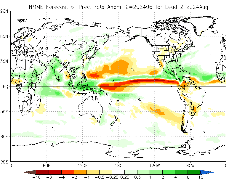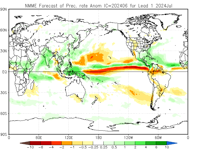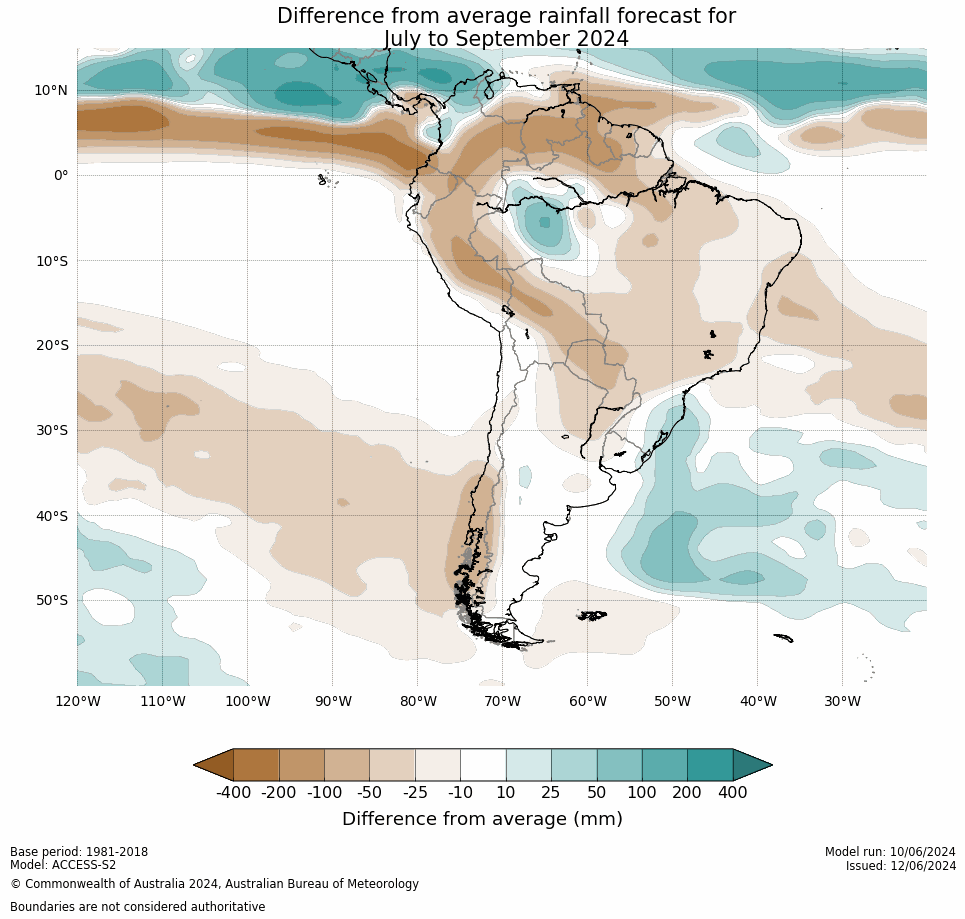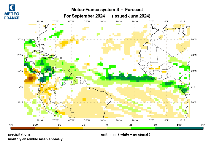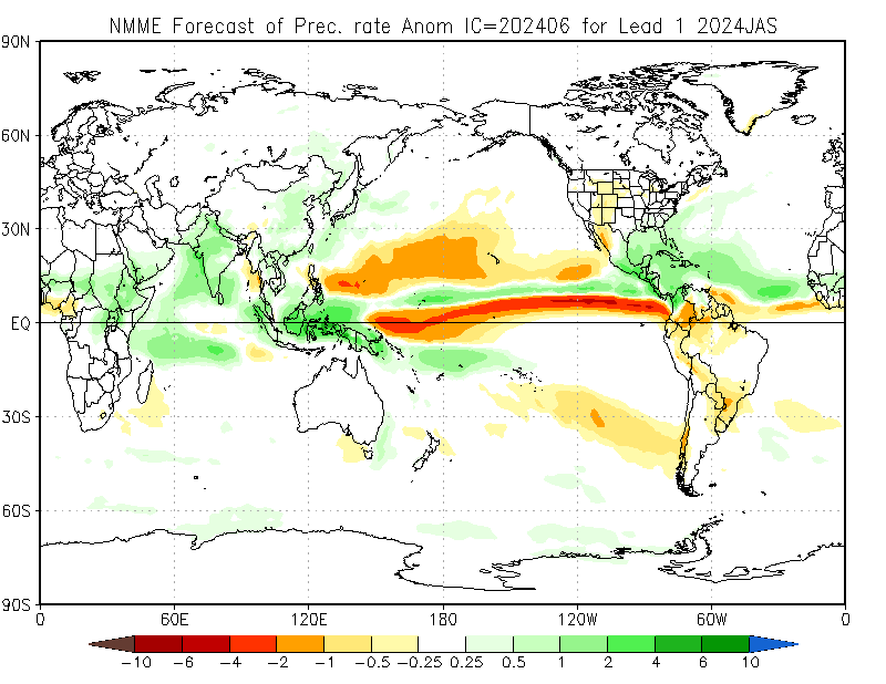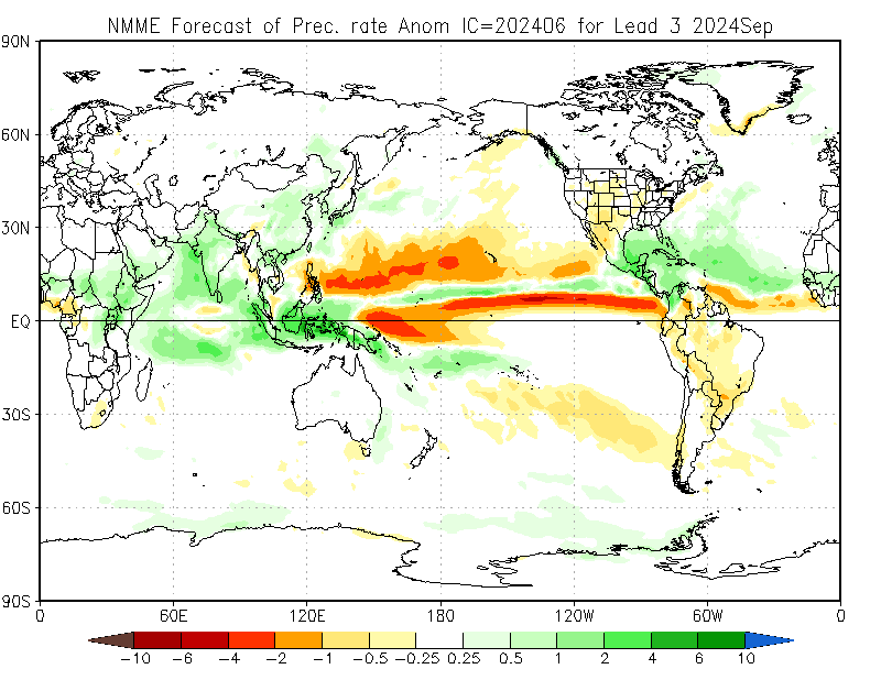 The North American Multi-Model Ensemble (NMME), Deutscher Wetterdienst de Alemania, Meteo France de Francia, ECMWF europeo, Met Office de Inglanterra, IRI, Australia Bureau of Meteorology, emperical, Integrated del CPTEC Brasil y CFSv2 de Estados Unidos. Se observa que el comportamiento de la precipitación para el trimestre Jul-Sep/2024 el 60% de los modelos ubican gran parte del país por encima de la media, lo que representa una reducción con respecto al mes pasado. Hacia el sur del país se observa una tendencia a reducción de los eventos de precipitación importante.
