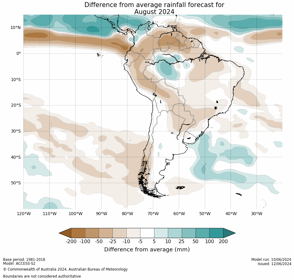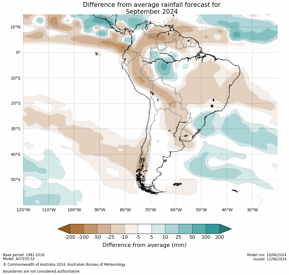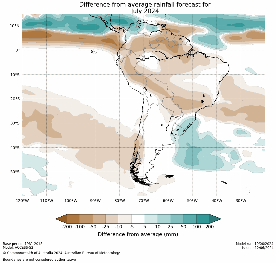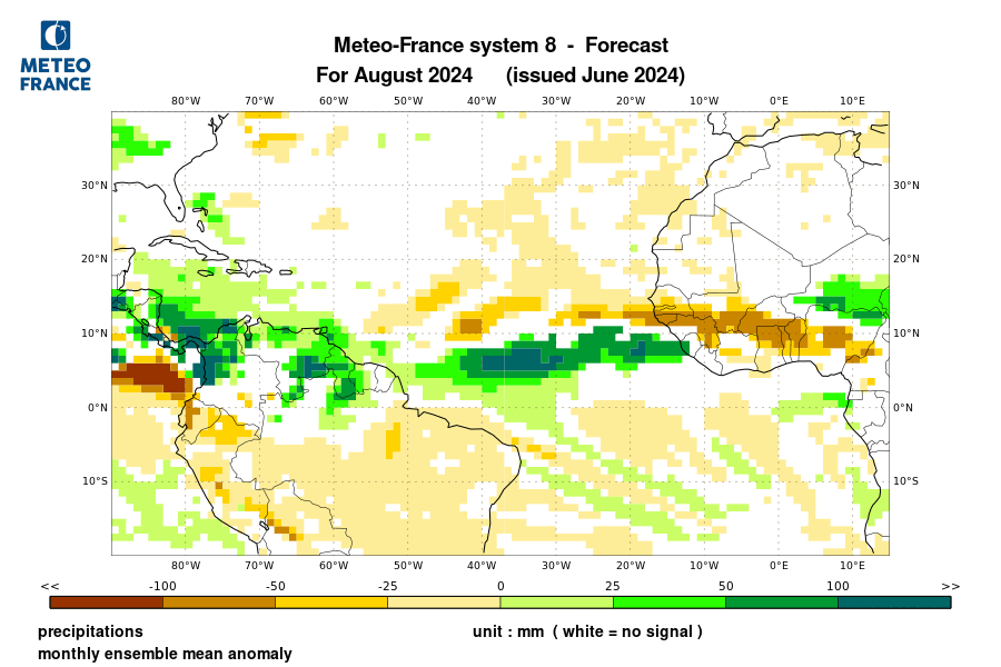 The North American Multi-Model Ensemble (NMME), Deutscher Wetterdienst de Alemania, Meteo France de Francia, ECMWF europeo, Met Office de Inglanterra, IRI, Australia Bureau of Meteorology, emperical, Integrated del CPTEC Brasil y CFSv2 de Estados Unidos. Se observa que el comportamiento de la precipitación para el trimestre Jul-Sep/2024 el 60% de los modelos ubican gran parte del país por encima de la media, lo que representa una reducción con respecto al mes pasado. Hacia el sur del país se observa una tendencia a reducción de los eventos de precipitación importante.