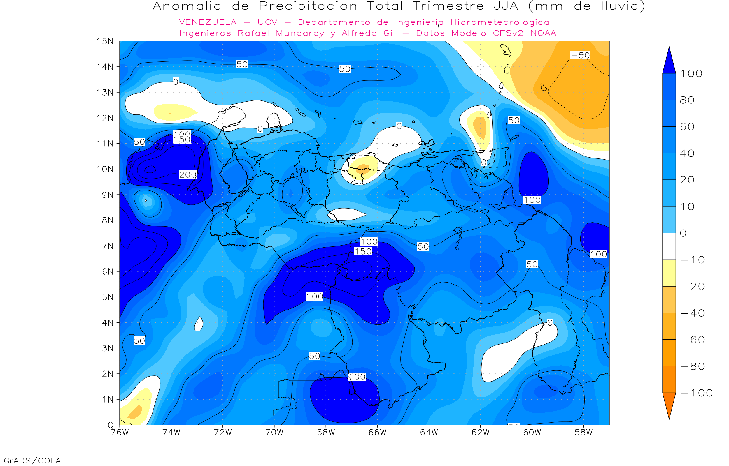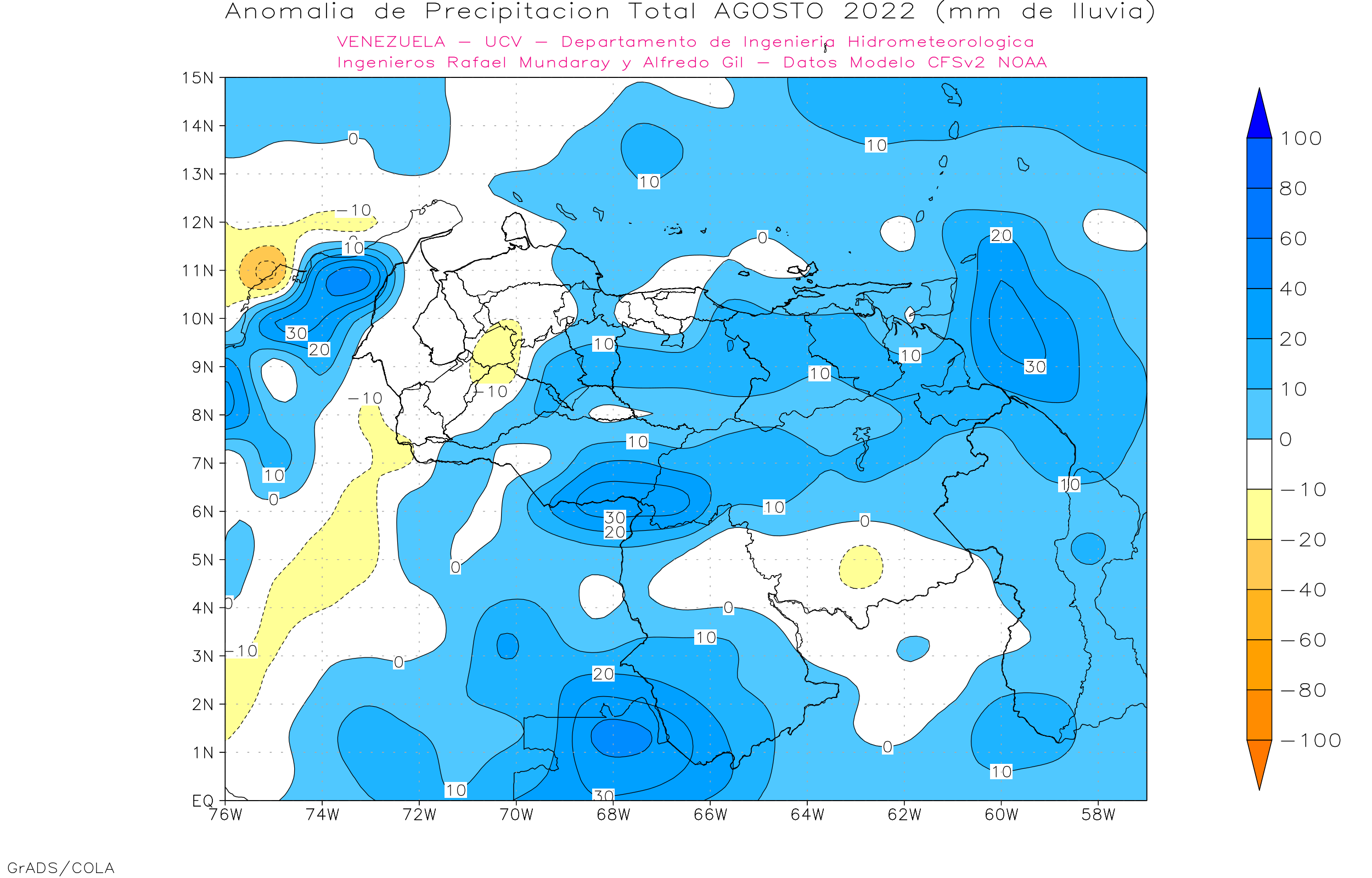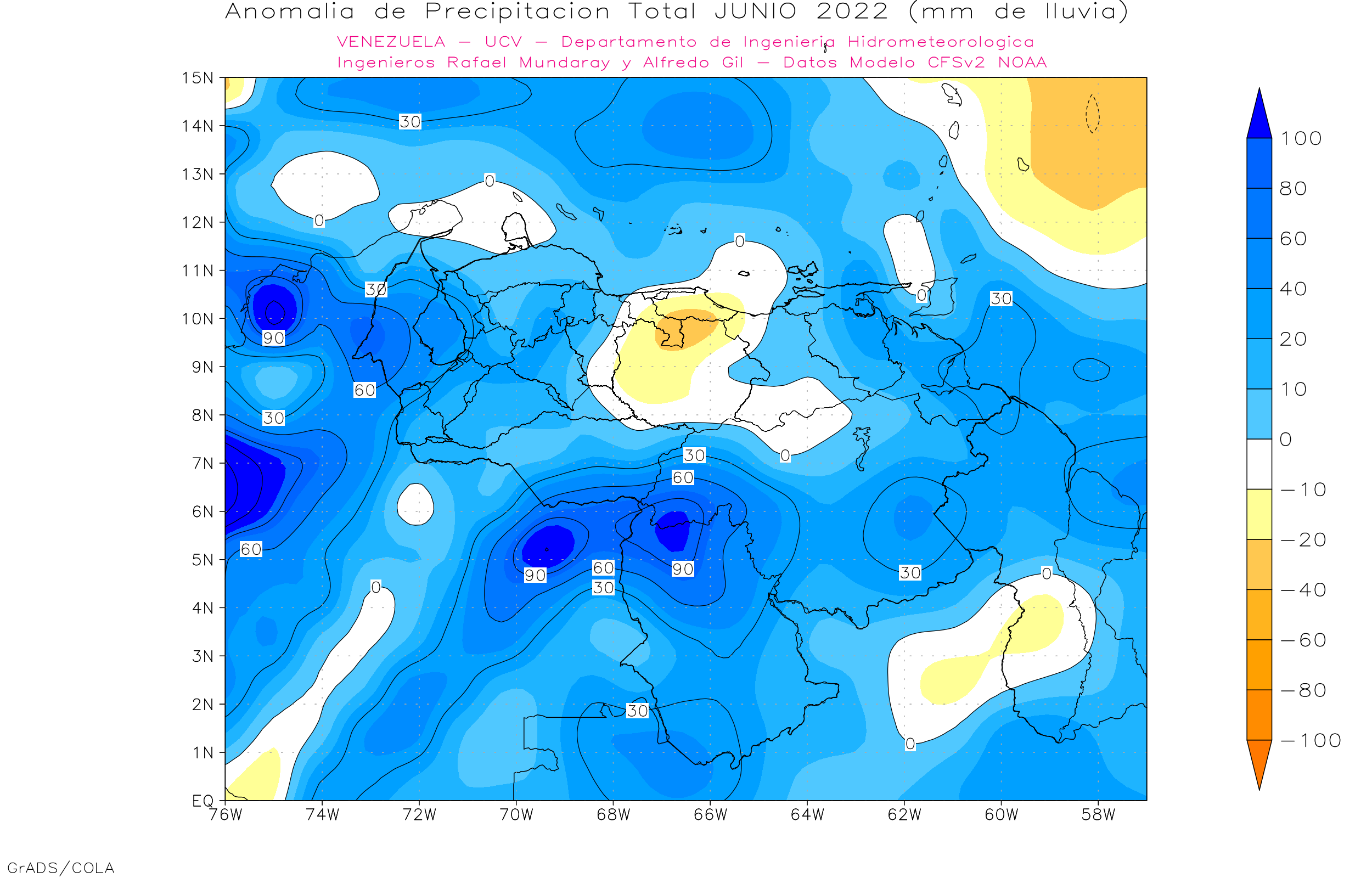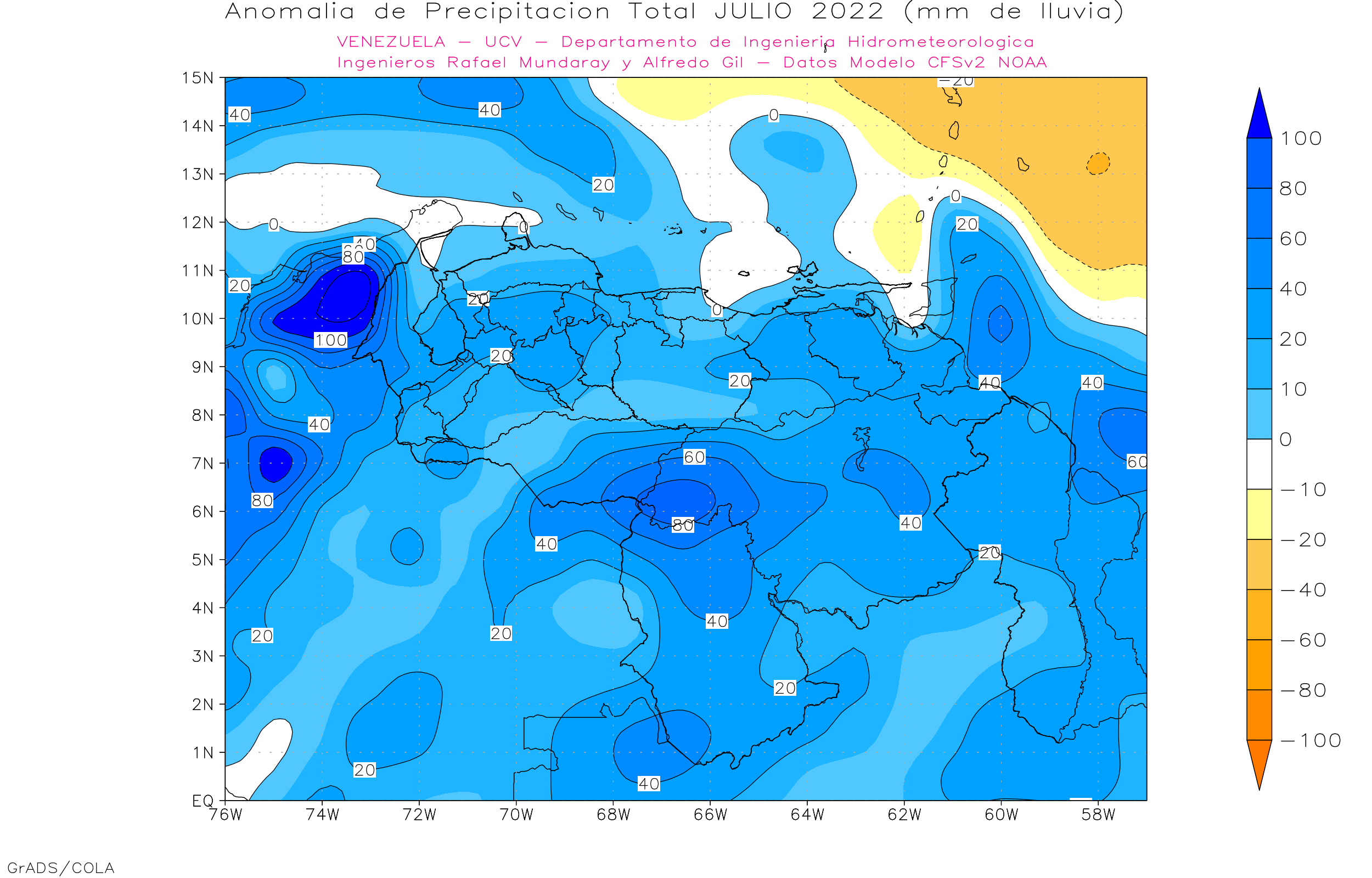 The North American Multi-Model Ensemble (NMME), Deutscher Wetterdienst de Alemania, Meteo France de Francia, ECMWF europeo, IRI y CFSv2 de Estados Unidos). Se observa que para el trimestre may-jun-jul/22, 7 (100%) de los modelos dan anomalías positivas al sur. Los estados centrales (Aragua, Carabobo, Miranda, Vargas, Yaracuy y Guárico) 4 (57.1%) de los modelos dan anomalías positivas, 1 (14.3%) dan anomalías negativas y 2 (28.3%) precipitaciones promedio. Los estados occidentales (Zulia, Lara, Falcón) 4 (57.1%) modelo dan anomalías positivas, 3 (42.9%) precipitaciones cercanas al promedio. La región andina (Táchira, Mérida y Trujillo) 7 (100%) modelos dan anomalías positivas de precipitación. Los llanos occidentales (Portuguesa, Apure, Barinas y Cojedes) 5 (71.4%) modelos dan anomalías positivas de precipitación, y 2 (28.6%) modelos precipitaciones cercanas al promedio, y la región oriental (Anzoátegui, Sucre, Monagas y Delta Amacuro) 5 (71.4%) modelos dan anomalías positivas y 2 (28.6%) modelos precipitaciones cercanas al promedio.