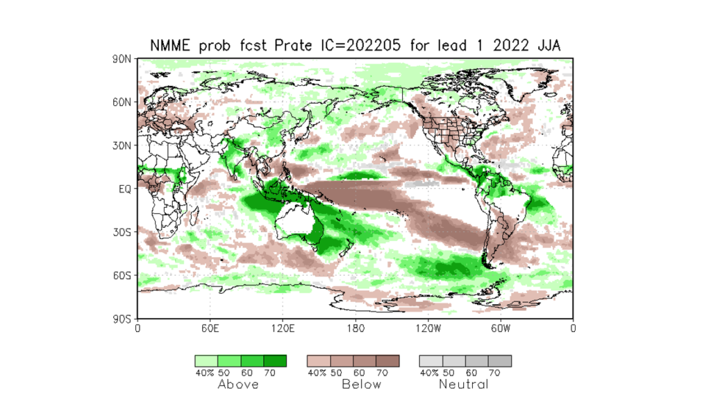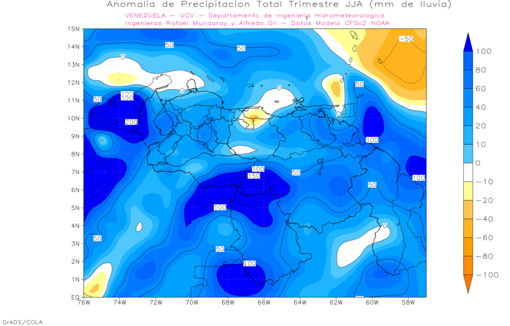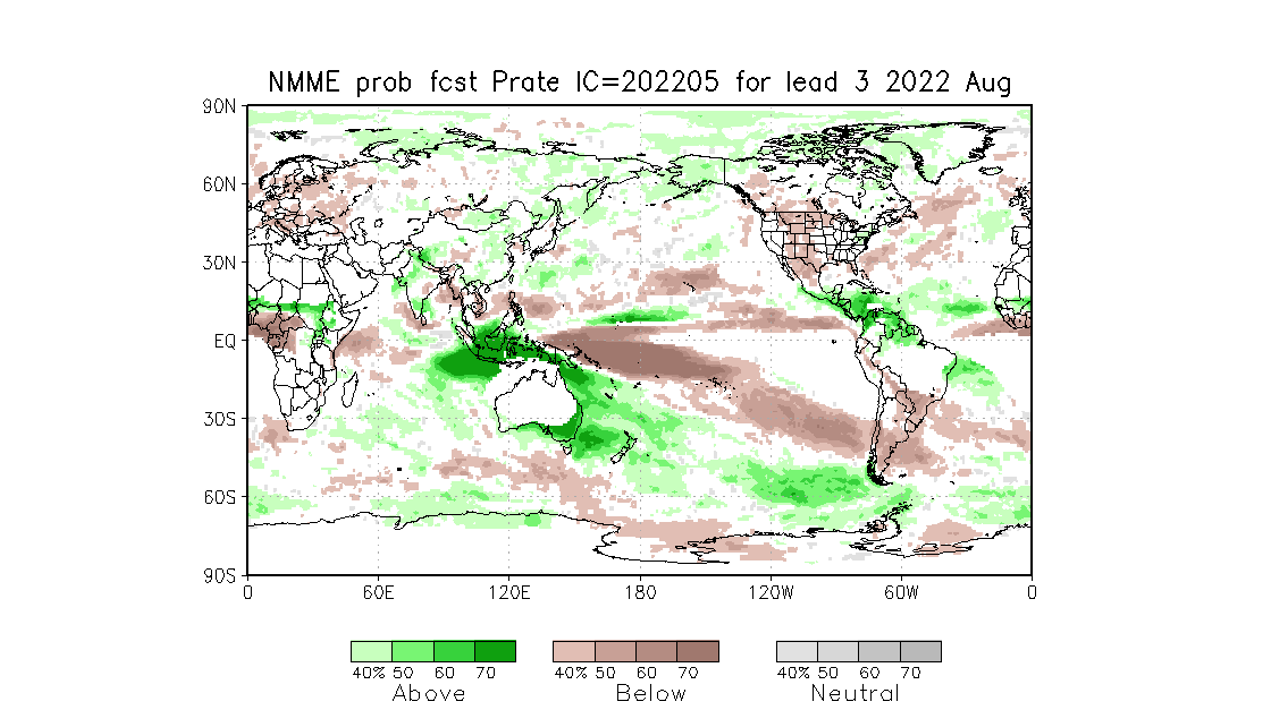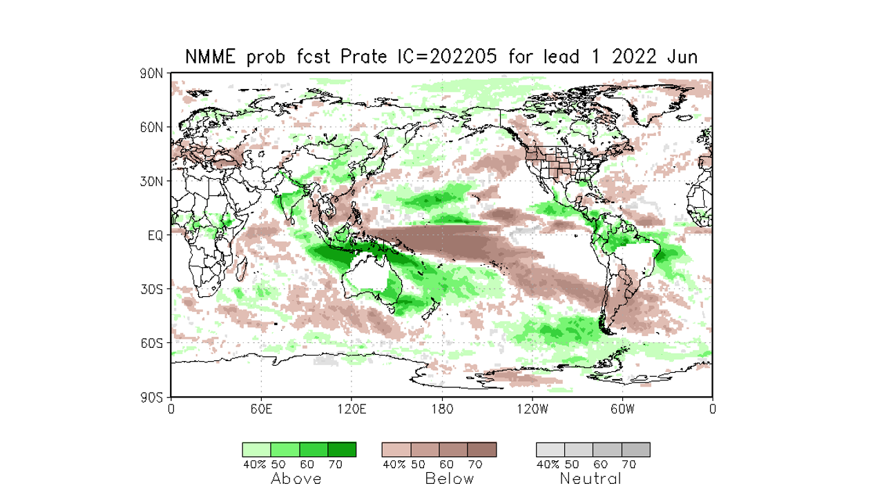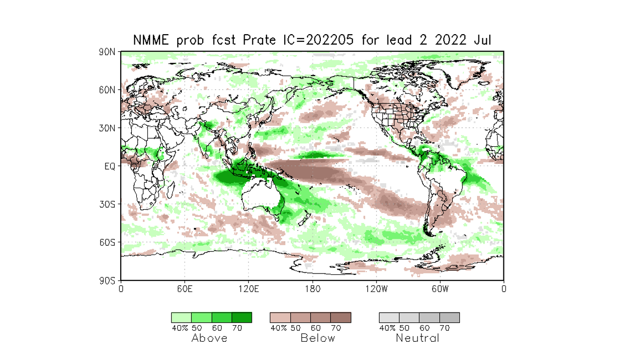 Mapas de pronostico mensual del conjunto de modelos múltiples de América del Norte (NMME) (es un sistema de predicción estacional que combina pronósticos de los principales modelos climáticos de América del Norte), se aprecia que los llanos occidentales son los que presentan la menor probabilidad de eventos por encima de la media. Las anomalías positivas van ubicando mas áreas del país hacia agosto.