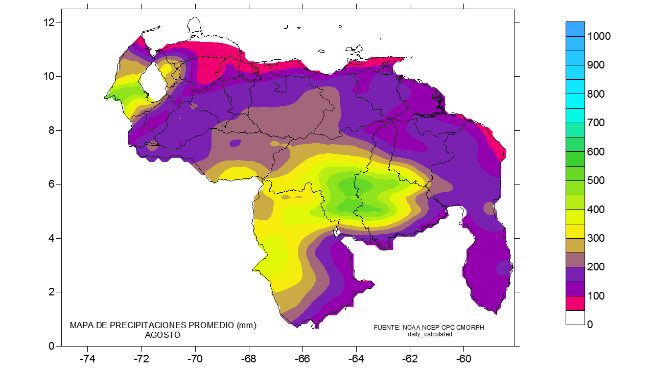 De acuerdo a la estadística de la precipitación estimada ( NOAA NCEP CPC CMORPH, daily_calculated) durante el trimestre Jun-Jul-Ago 2022, los principales eventos de precipitaciones se ven en Amazonas, Bolívar y suroeste de Zulia y sur de Apure, los menores eventos se observa en la franja norte costera, las precipitaciones por encima de los 900 mm se ubican al sur de 9° norte y suroeste de Zulia.