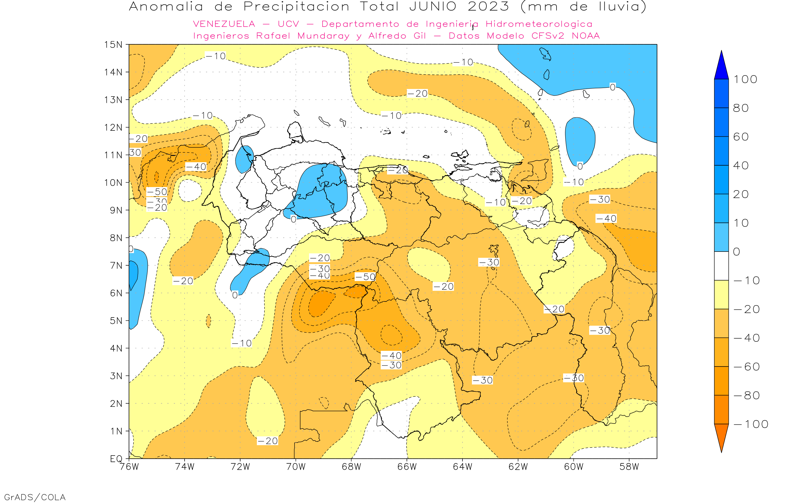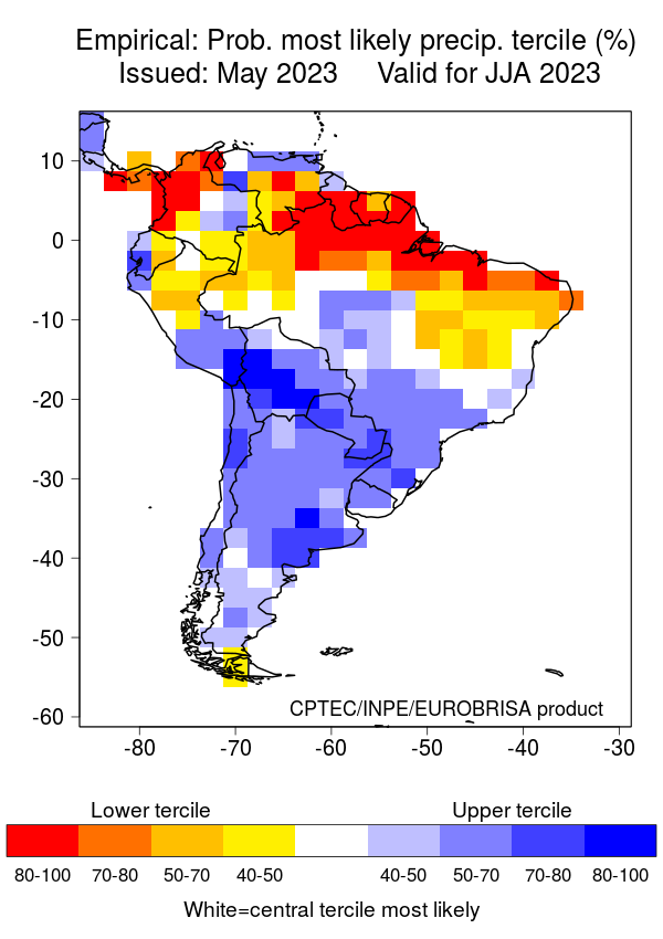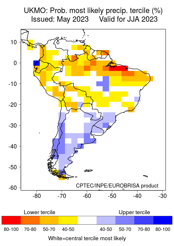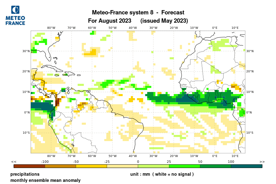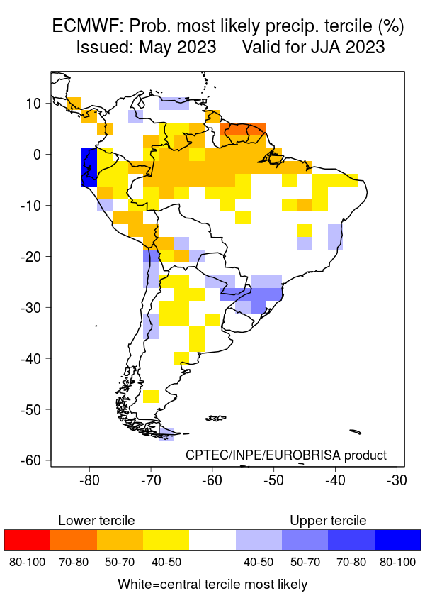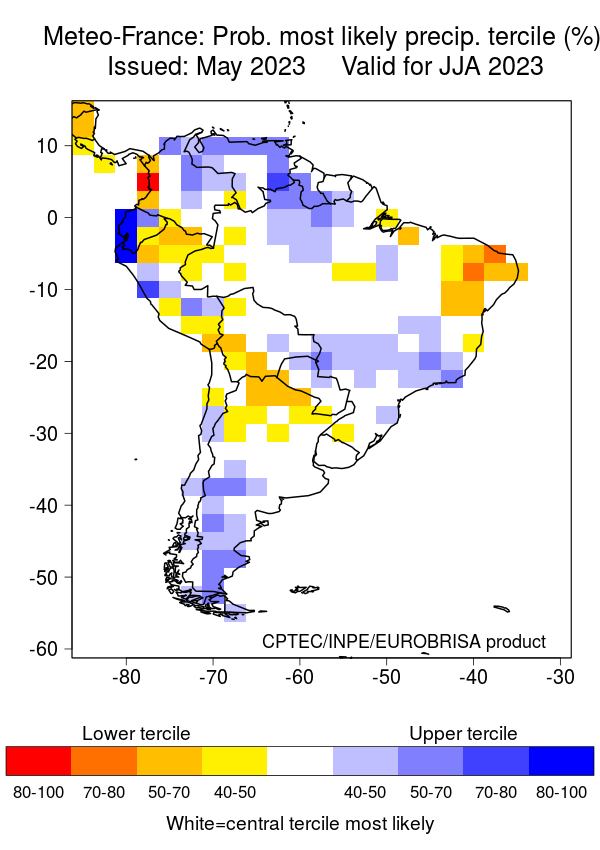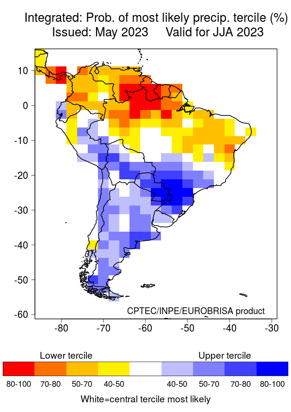 The North American Multi-Model Ensemble (NMME), Deutscher Wetterdienst de Alemania, Meteo France de Francia, ECMWF europeo, Met Office de Inglanterra, IRI, CFSv2 de Estados Unidos y emperical, Integrated del CPTEC Brasil. Se observa que el comportamiento de la precipitación para el trimestre JUN-JUL-AGO/2023: