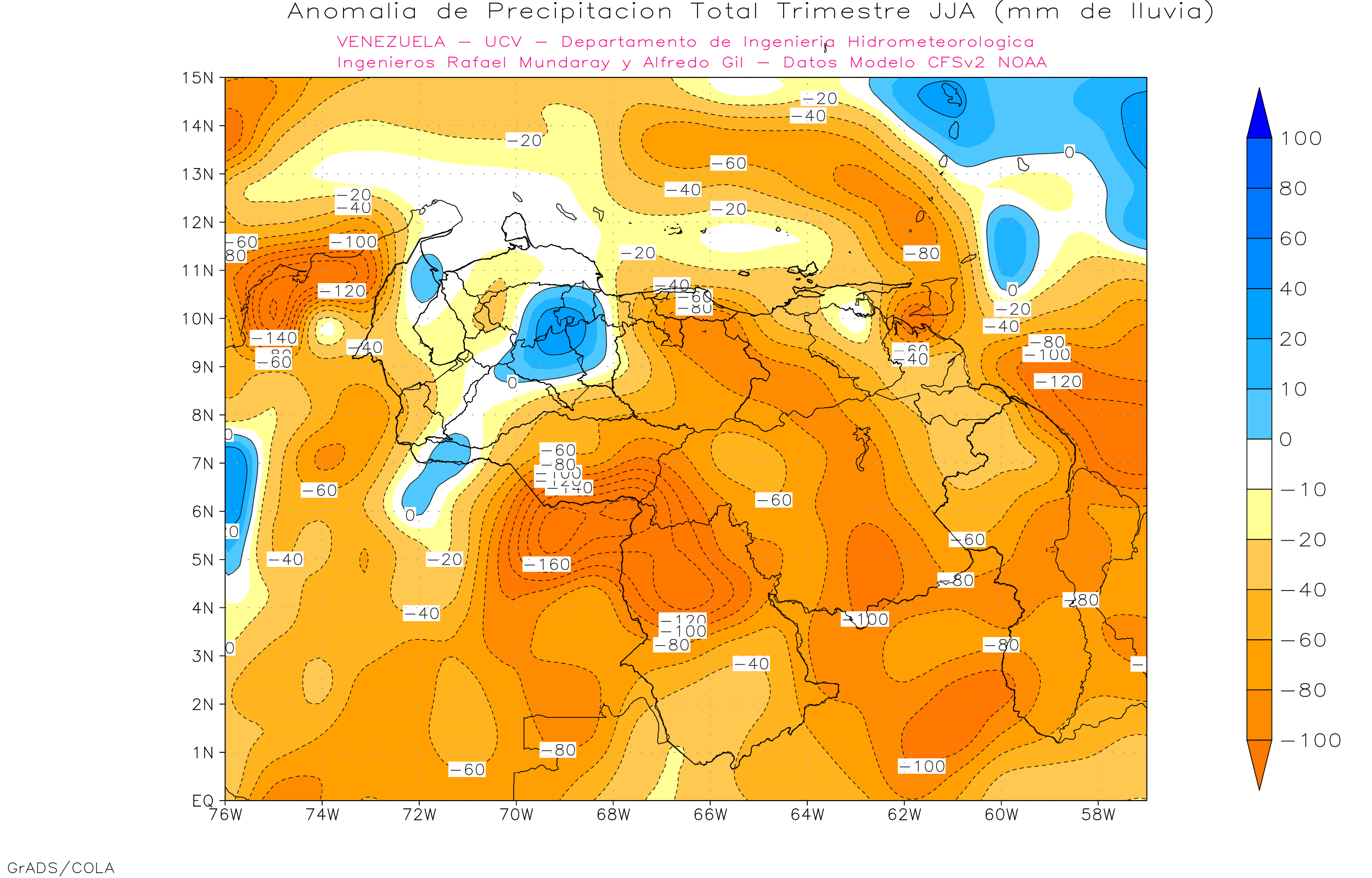 La región andina (Táchira, Mérida y Trujillo) 1 (11.1 %) modelos dan anomalías positivas de precipitación, 1 (11.1%) modelos dan precipitaciones promedio y 7 (77.8 %) modelo dan anomalías negativas.