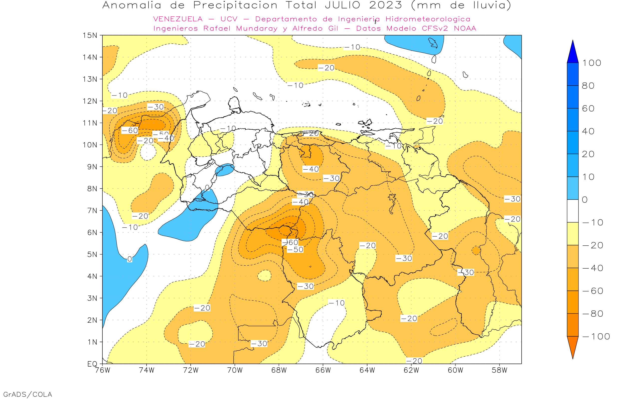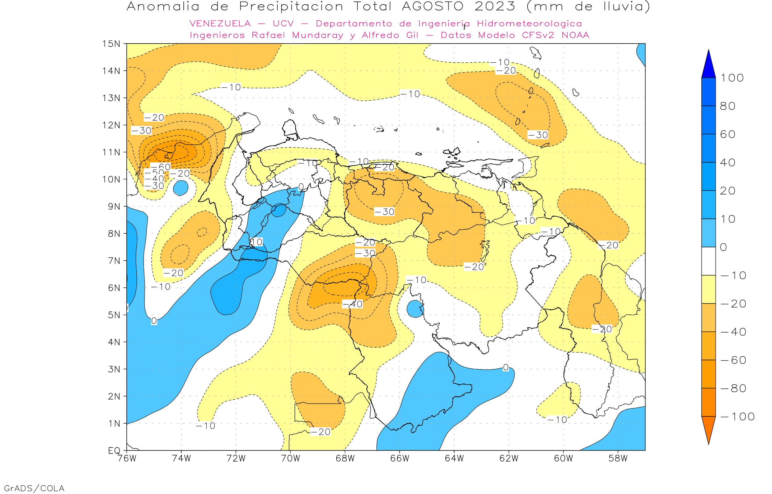 De acuerdo a la estadística de la precipitación estimada ( NOAA NCEP CPC CMORPH, daily_calculated) durante el trimestre Jun-Jul-Ago 2023, los principales eventos de precipitaciones se ven en Amazonas, suroeste de Bolívar y sur del lago de Maracaibo, los menores eventos se observa en la franja norte costera, llanos orientales, las precipitaciones por encima de los 900 mm se ubican al sur de 8° norte.