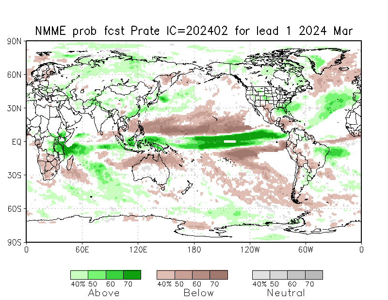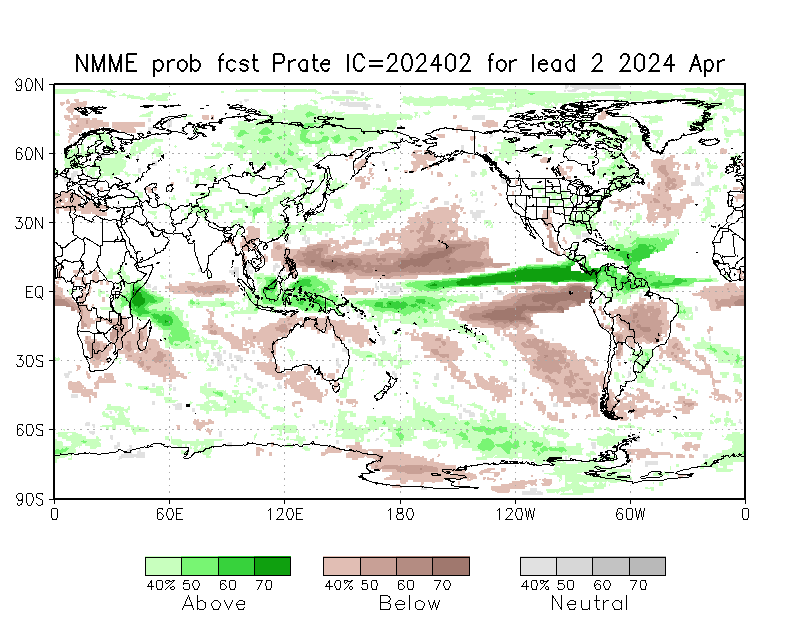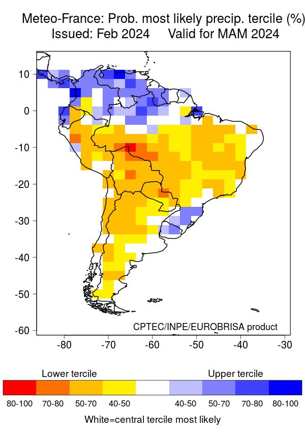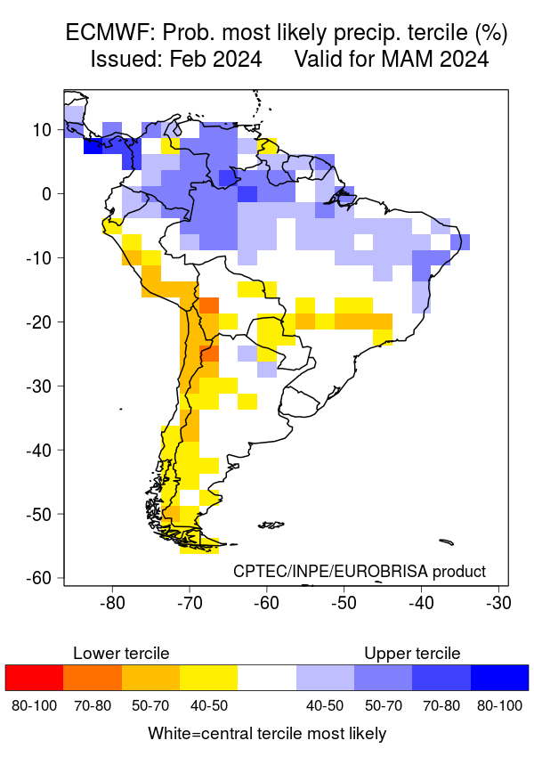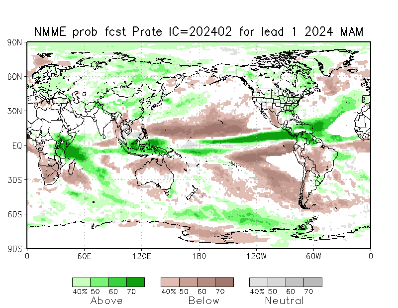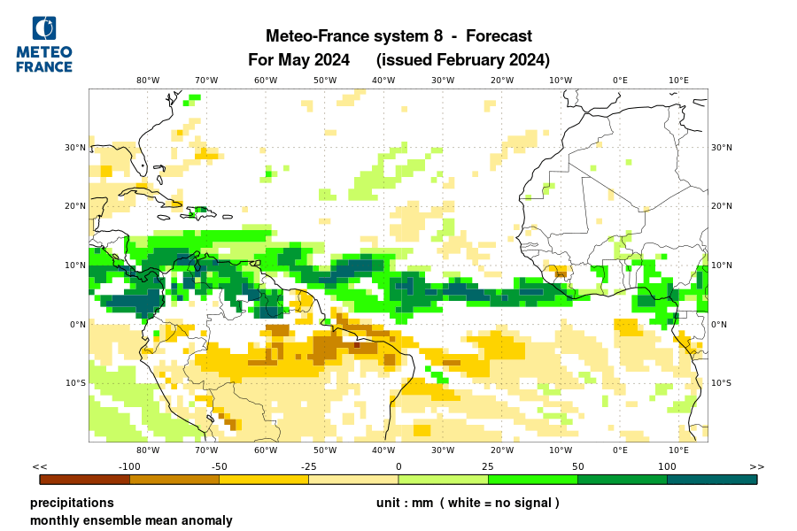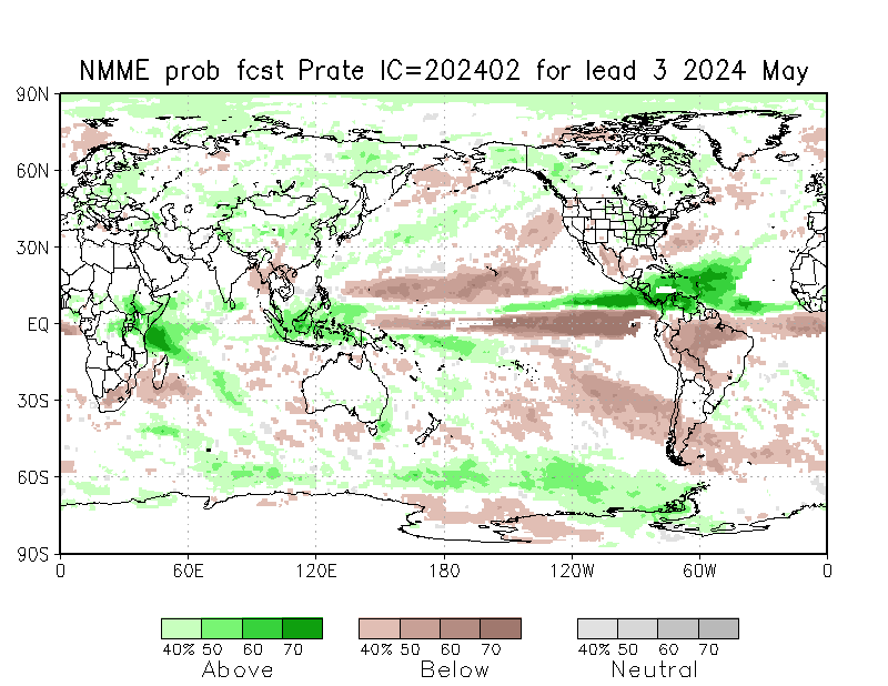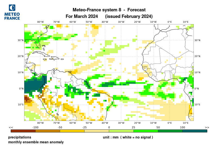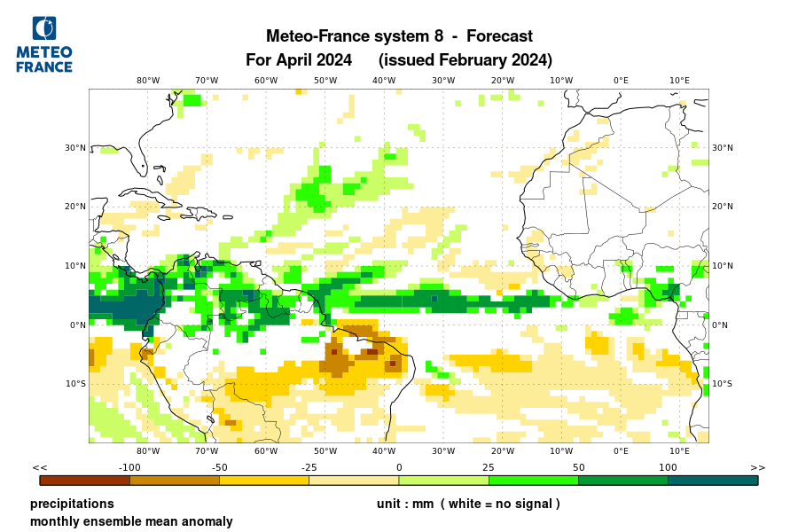 The North American Multi-Model Ensemble (NMME), Deutscher Wetterdienst de Alemania, Meteo France de Francia, ECMWF europeo, Met Office de Inglanterra, IRI, Australia Bureau of Meteorology, emperical, Integrated del CPTEC Brasil y CFSv2 de Estados Unidos. Se observa que el comportamiento de la precipitación para el trimestre Mar – May/2024 este debe ubicarse en general con valores por encima de la media, en especial hacia el final del trimeste (mayo)