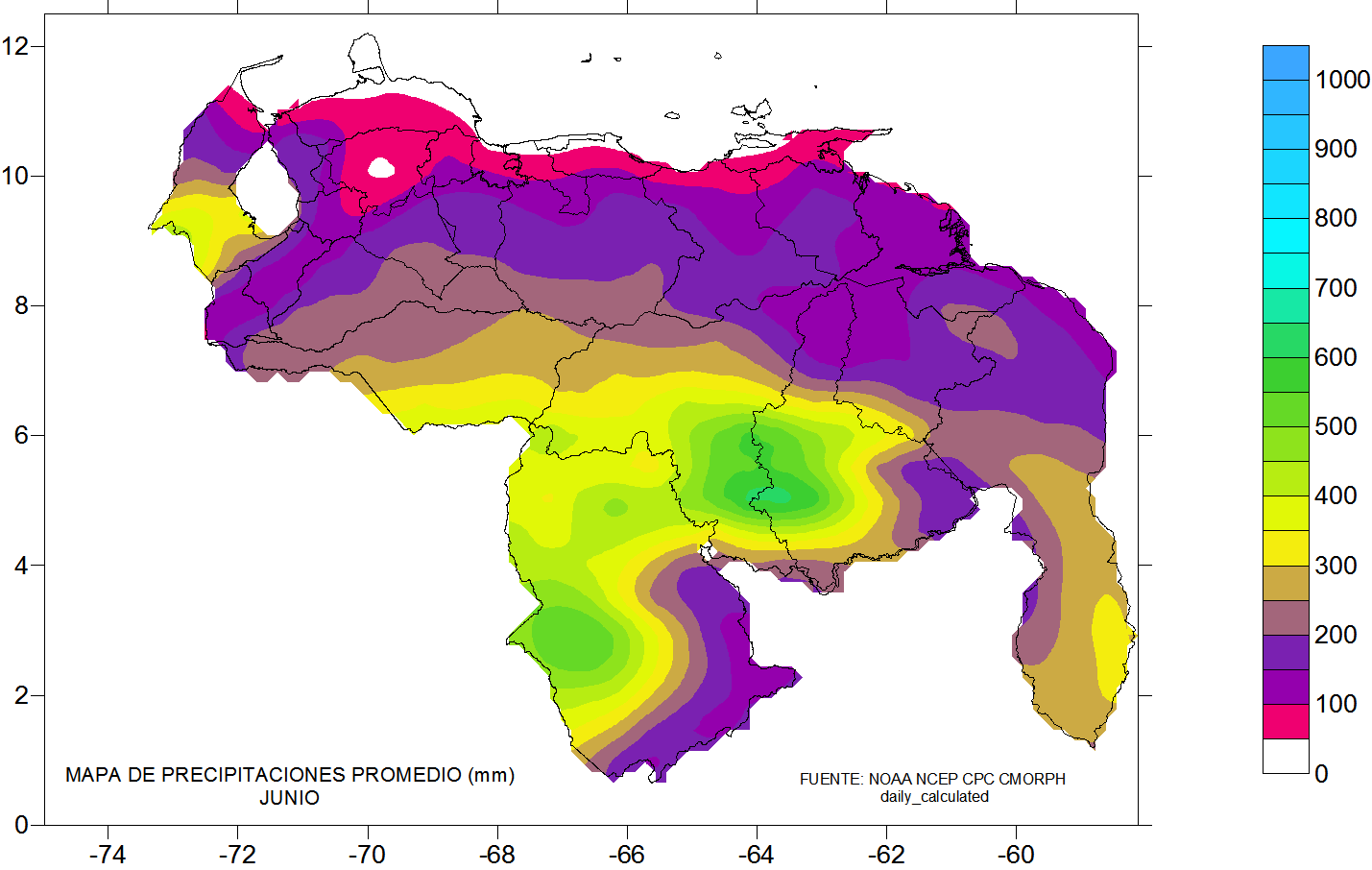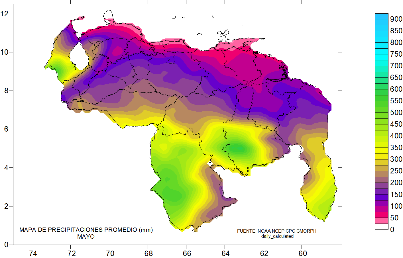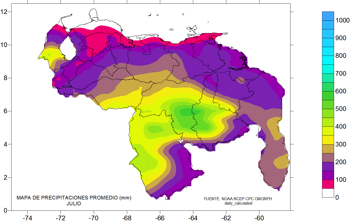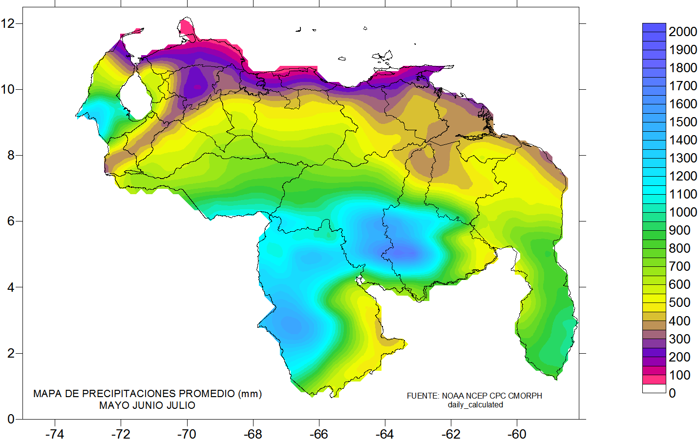 En los mapas de la estadística de la precipitación estimada ( NOAA NCEP CPC CMORPH, daily_calculated) durante los meses mayo-junio-julio. Se observa como sigue ingresando la temporada de lluvia sobre el territorio nacional, comenzando en mayo en Amazonas y sur de Bolívar, en junio Amazonas, mitad de Bolívar y sur de Apure y julio al sur de 7° norte.
