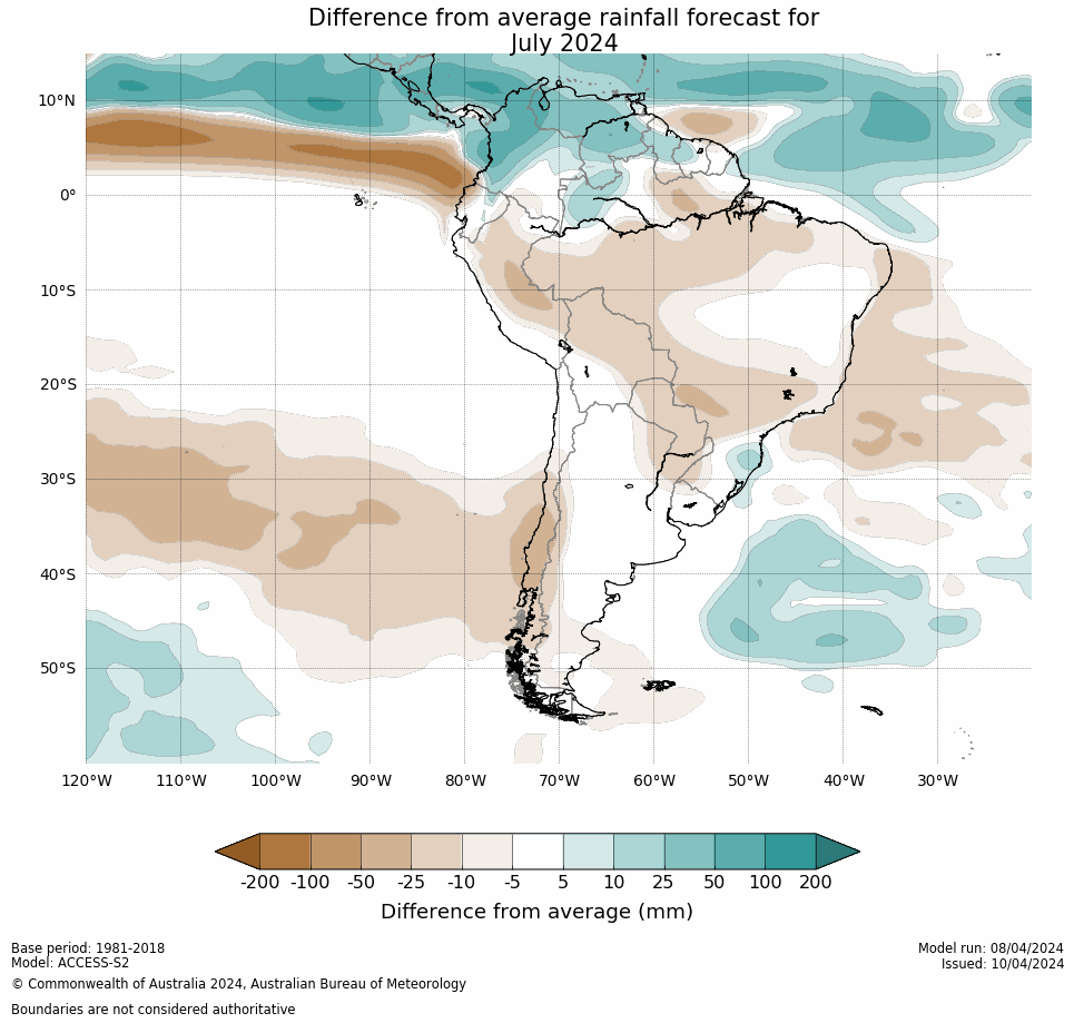 he North American Multi-Model Ensemble (NMME), Deutscher Wetterdienst de Alemania, Meteo France de Francia, ECMWF europeo, Met Office de Inglanterra, IRI, Australia Bureau of Meteorology, emperical, Integrated del CPTEC Brasil y CFSv2 de Estados Unidos. Se observa que el comportamiento de la precipitación para el trimestre May – Jul/2024 el 75% de los modelos ubican gran parte del país por encima de la media y se observa que la temporada de lluvia llegara en promedio para el sur del país..