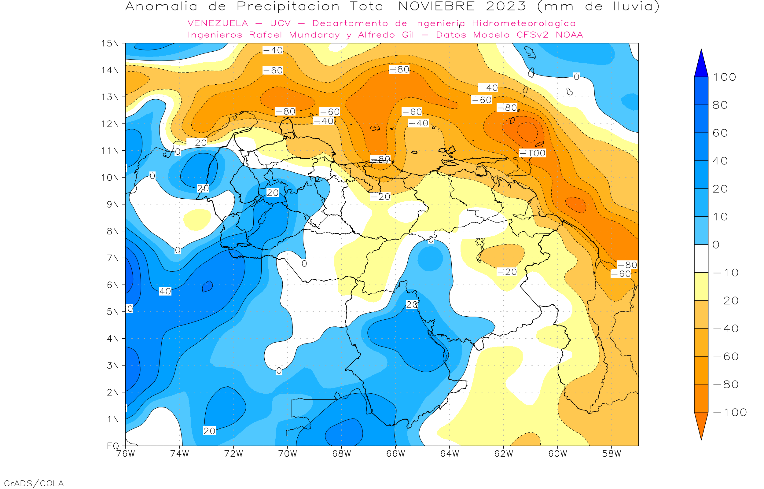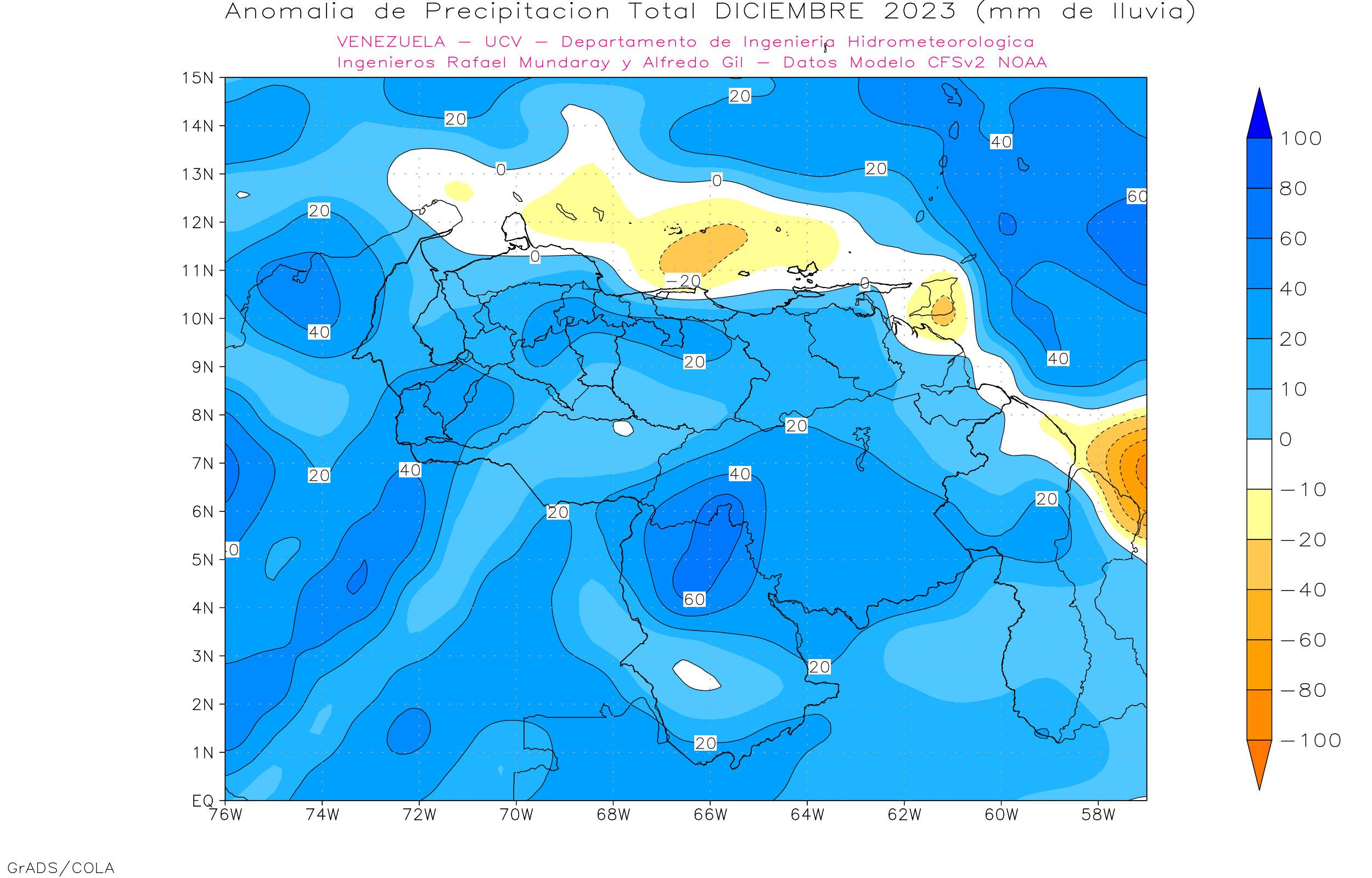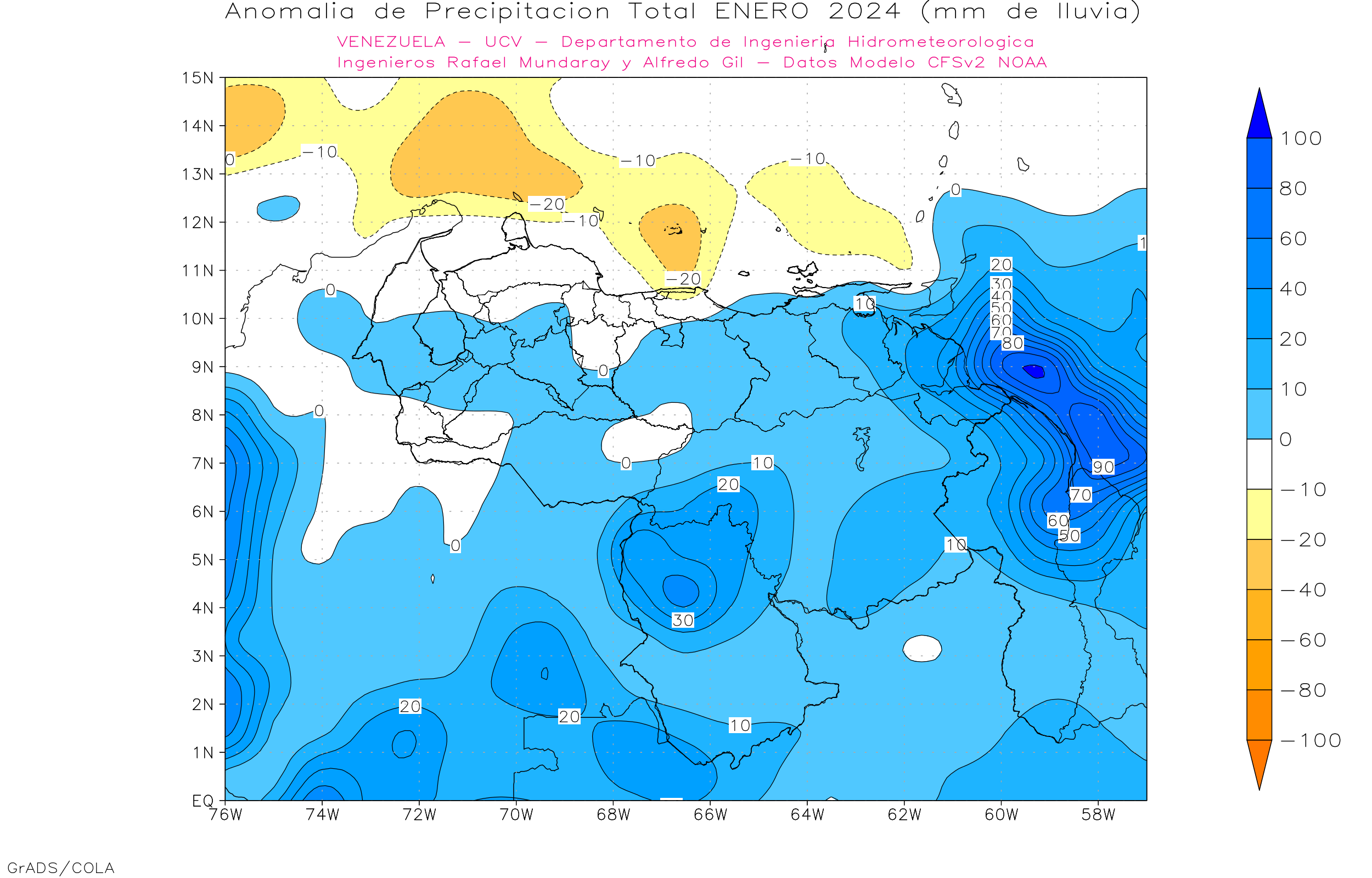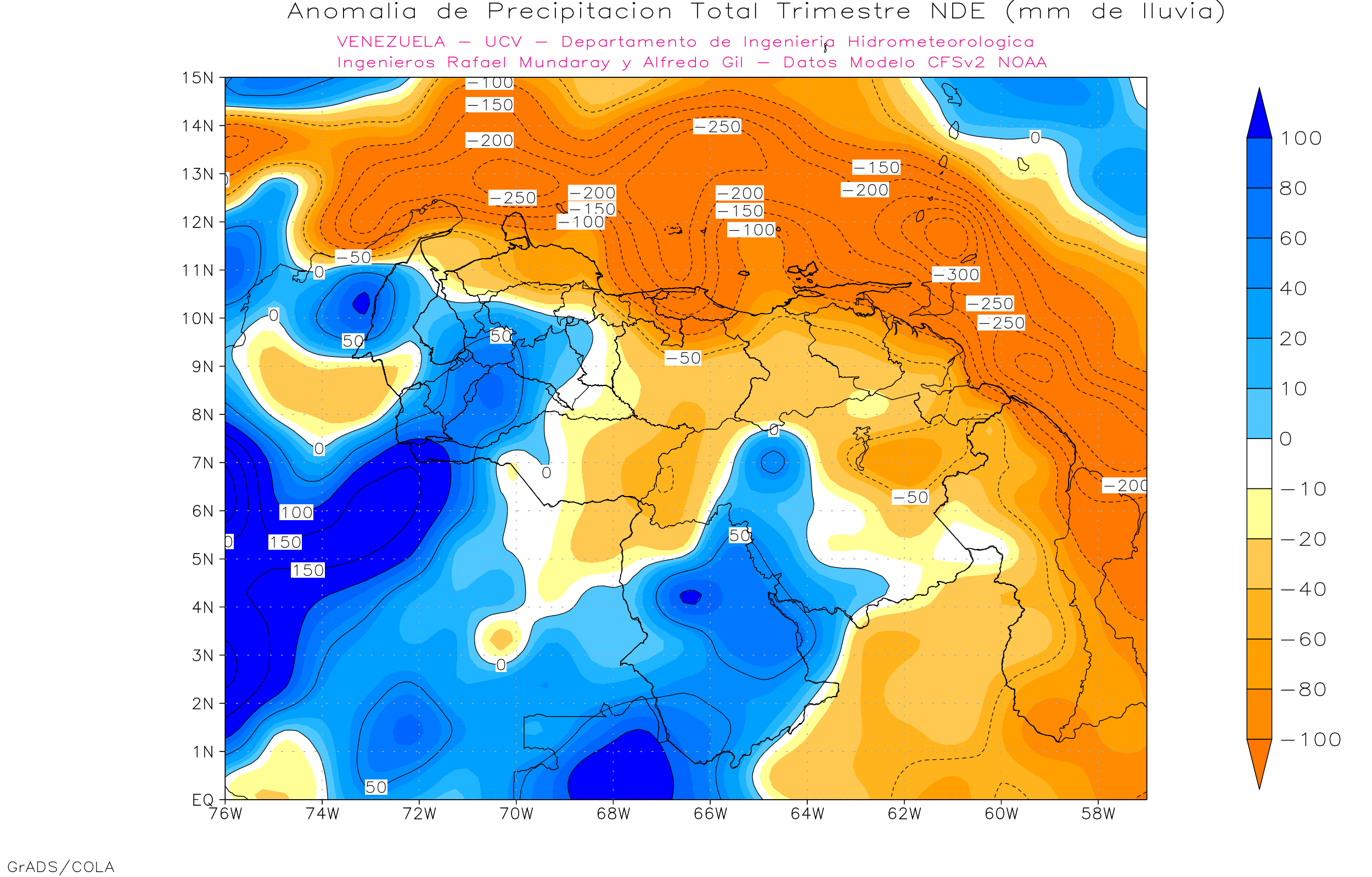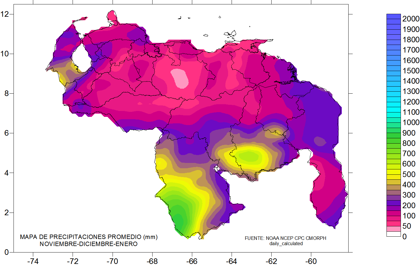 De acuerdo a la estadística de la precipitación estimada ( NOAA NCEP CPC CMORPH, daily_calculated) durante el trimestre Nov-Dic-Ene, los principales eventos de precipitaciones se ven en Amazonas, sur de Bolívar y sur del Lago de Maracaibo, los menores eventos se observa en la franja norte costera, llanos orientales, centrales y occidentales, las precipitaciones por encima de los 500 mm se ubican al sur de 5° norte.