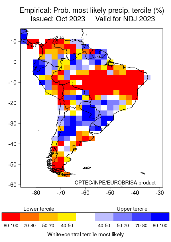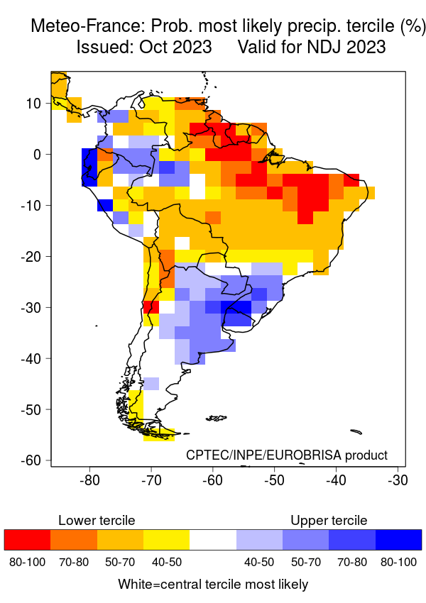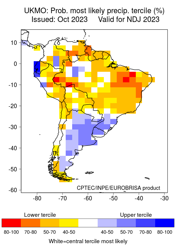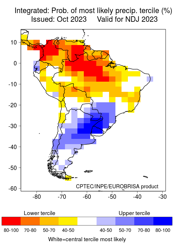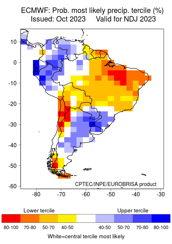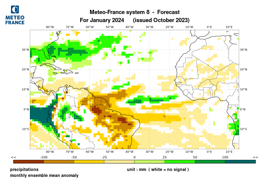 The North American Multi-Model Ensemble (NMME), Deutscher Wetterdienst de Alemania, Meteo France de Francia, ECMWF europeo, Met Office de Inglanterra, IRI, Australia Bureau of Meteorology, emperical, Integrated del CPTEC Brasil y CFSv2 de Estados Unidos. Se observa que el comportamiento de la precipitación para el trimestre NOV-DIC/2023 – Ene/2024