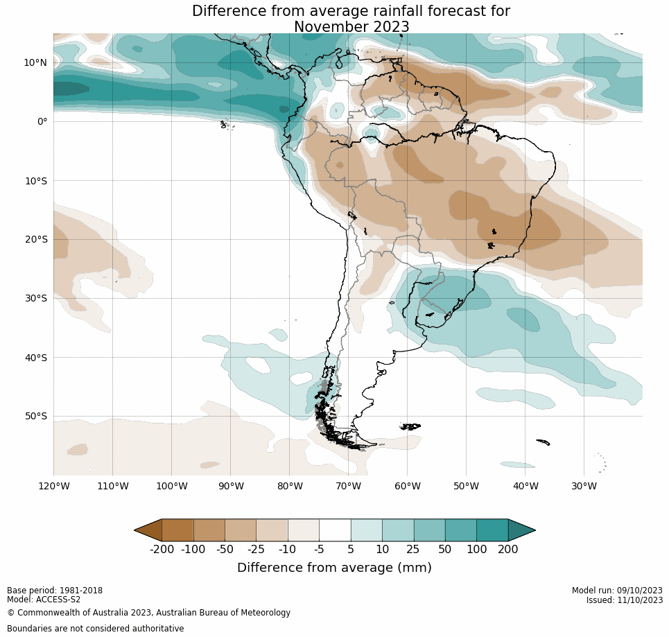 Mapas de pronostico mensual del modelo Seasonal climate forecast from CFSv2. NOAA, The North American Multi-Model Ensemble (NMME), Meteo France, Australia Bureau of Meteorology, dos modelos (NMME, CFSv2) coinciden que noviembre sera un mes con anomalías negativas en la región norte costera y promedio el resto del país y los otros dos (Meteo France, Australia Bureau of Meteorology) dan deficit al sur y promedio el resto del país. Para diciembre dos modelos (NMME, CFSv2) ubican al país entre promedio a por encima, y los otros dos (Meteo France, Australia Bureau of Meteorology) dan deficit al sur y promedio el resto del país. Enero dos modelos (NMME, CFSv2) dan promedio casi todo el país y los otros dos (Meteo France, Australia Bureau of Meteorology) dan deficit al sur y promedio el resto del país