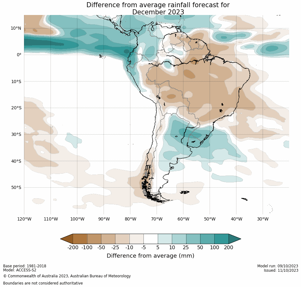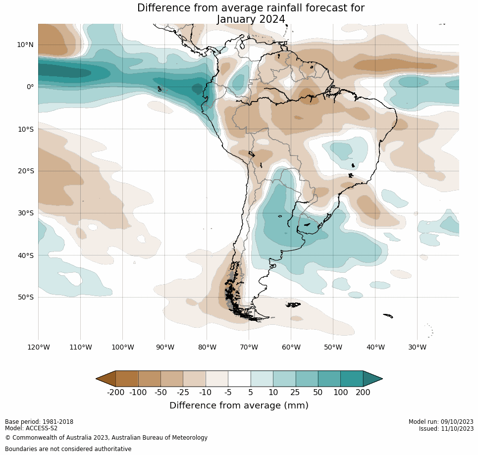 Región sur (Amazonas y Bolívar): 5 (50.0 %) de los modelos dan anomalías negativas y 5 (50.0 %) de los modelos dan precipitaciones promedio