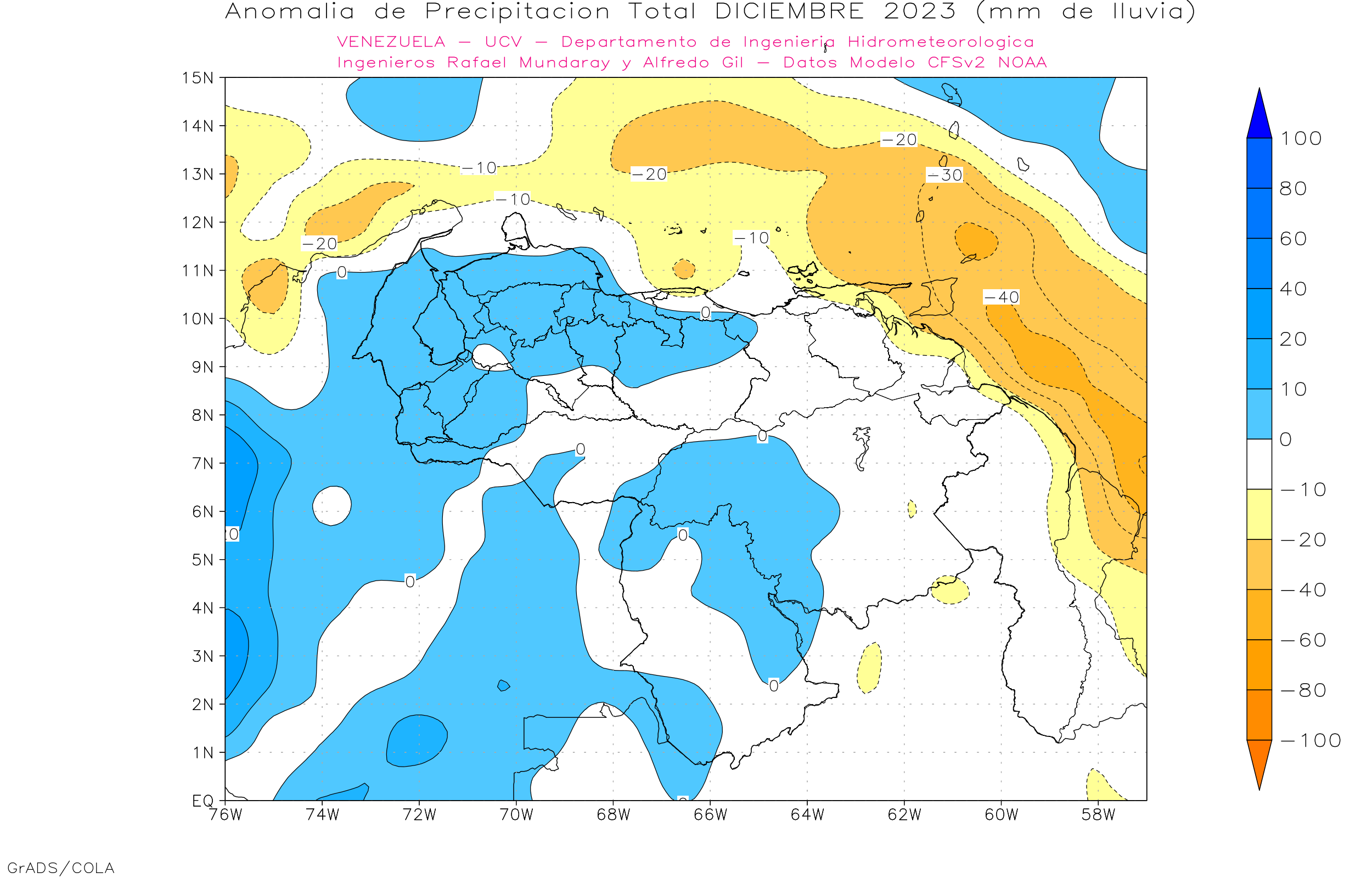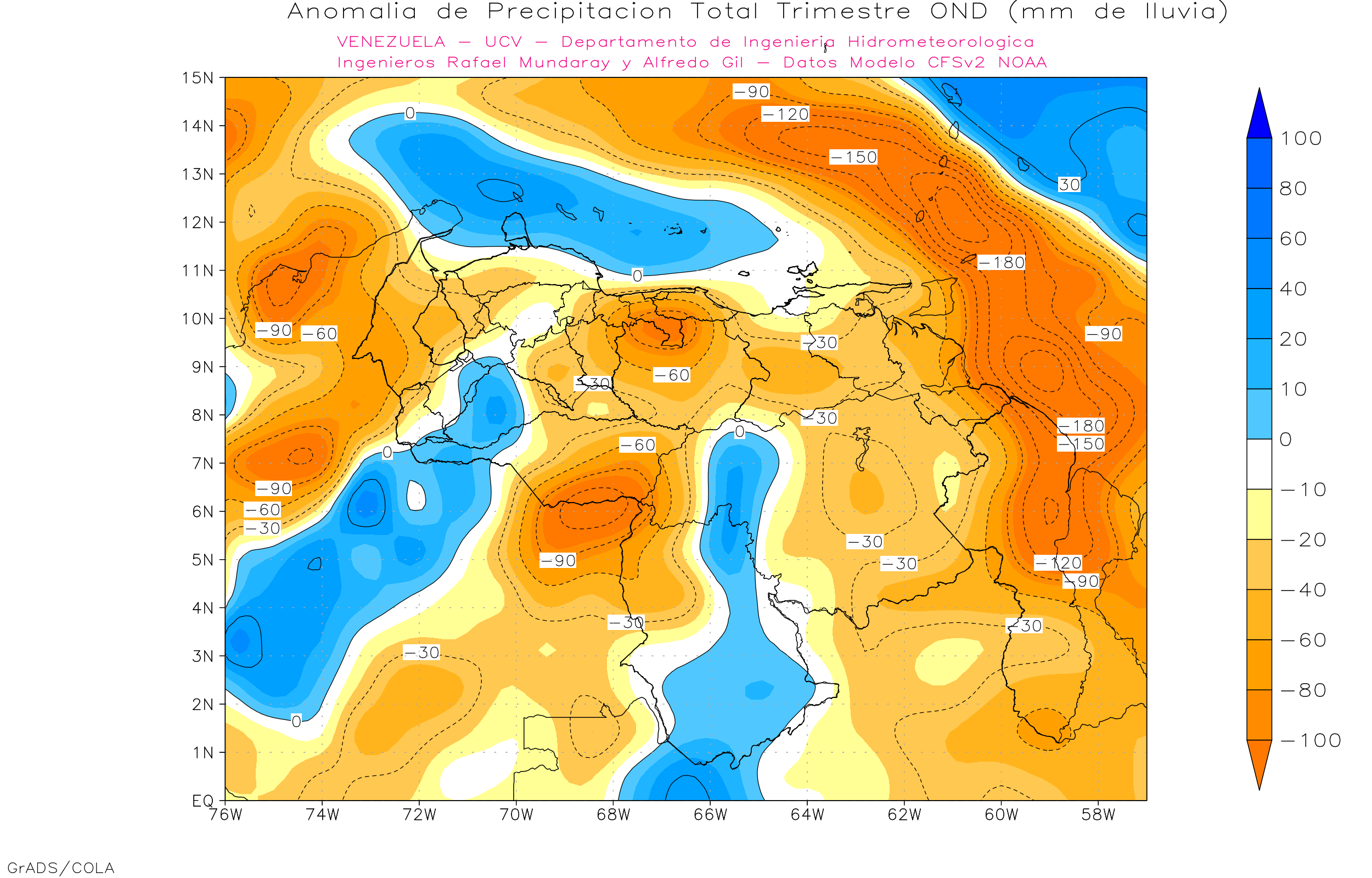 De acuerdo a la estadística de la precipitación estimada ( NOAA NCEP CPC CMORPH, daily_calculated) durante el trimestre Oct-Nov-Dic, los principales eventos de precipitaciones se ven en Amazonas, sur de Bolívar y sur del Lago de Maracaibo, los menores eventos se observa en la franja norte costera, llanos orientales, las precipitaciones por encima de los 500 mm se ubican al sur de 7° norte.