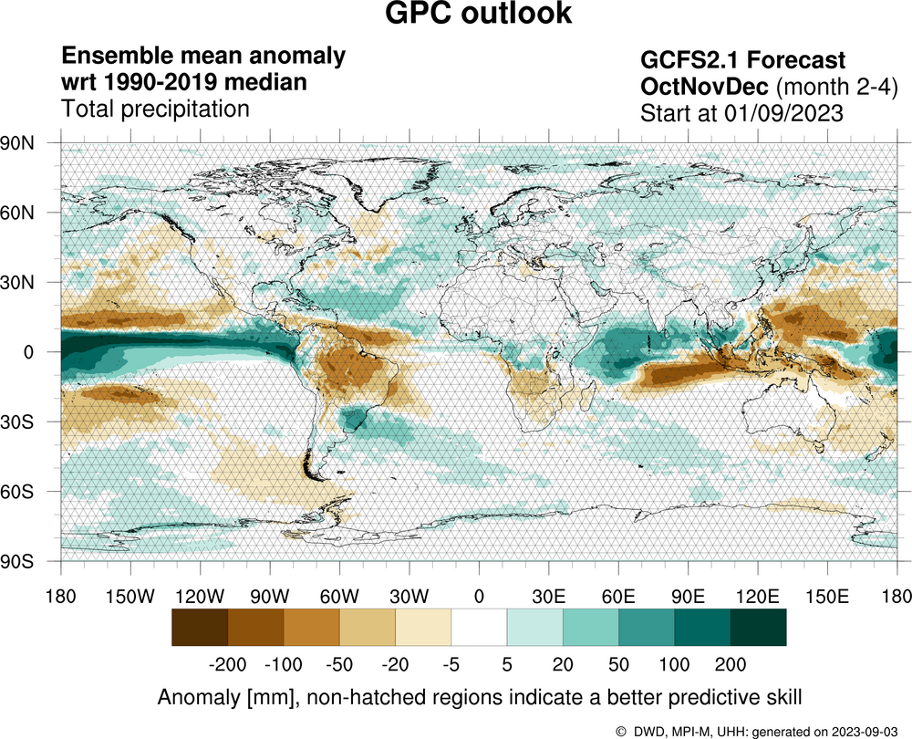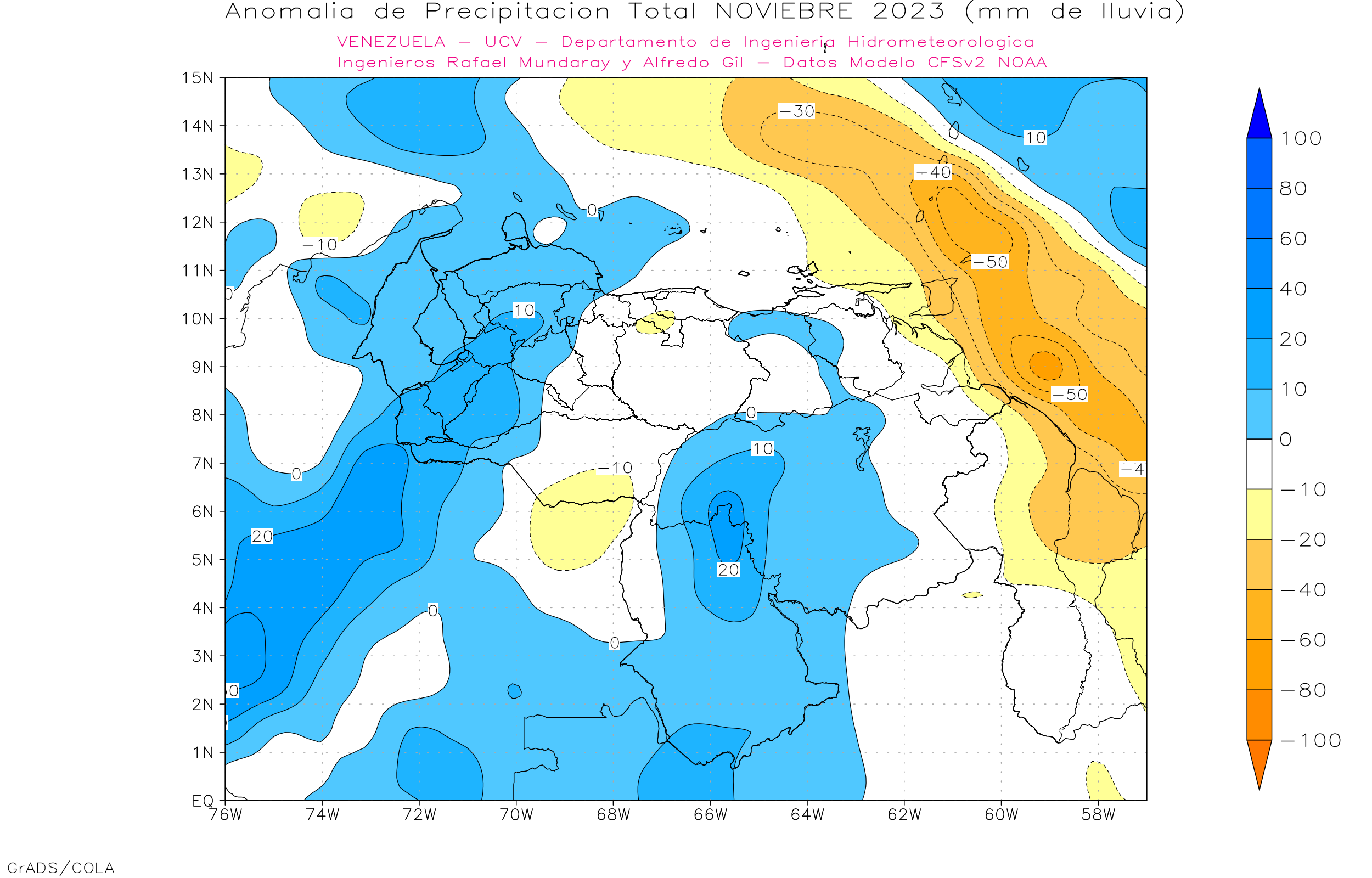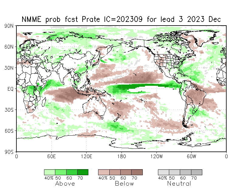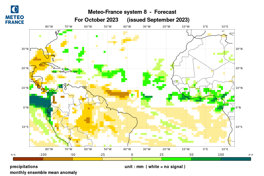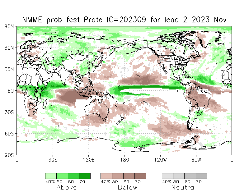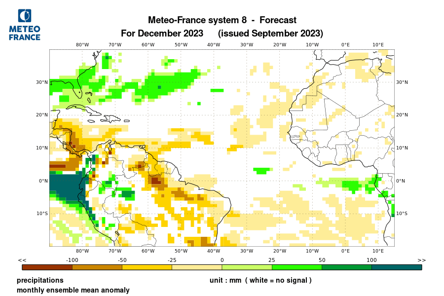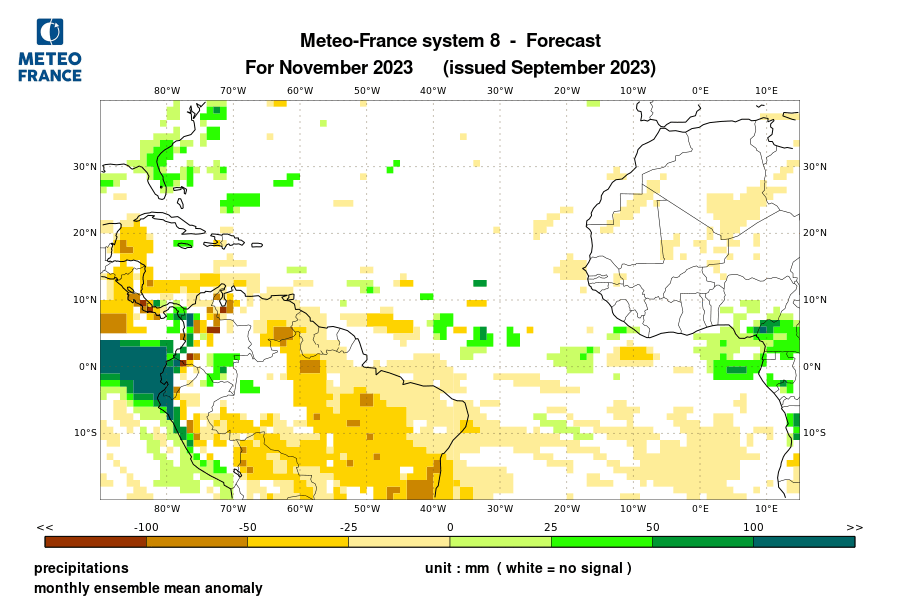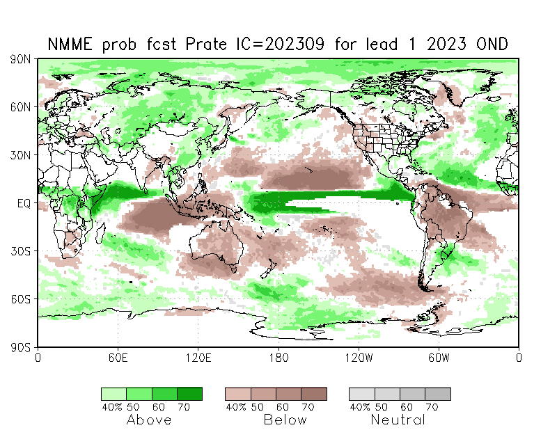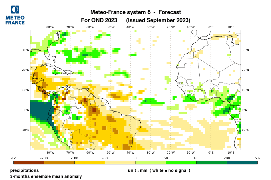 The North American Multi-Model Ensemble (NMME), Deutscher Wetterdienst de Alemania, Meteo France de Francia, ECMWF europeo, Met Office de Inglanterra, IRI y CFSv2 de Estados Unidos. Se observa que el comportamiento de la precipitación para el trimestre OCT-NOV-DIC/2023: