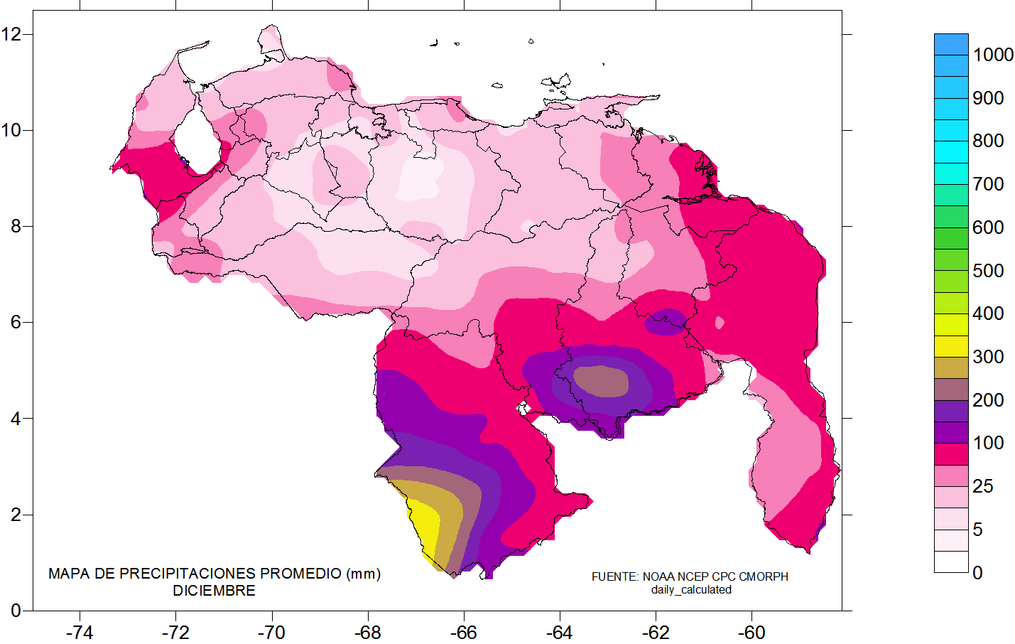 En los mapas de la estadística de la precipitación estimada ( NOAA NCEP CPC CMORPH, daily_calculated) durante los meses octubre-noviembre-diciembre. Se observa como se van disminuyendo el total de lluvia en los llanos, estados occidentales y norte costera, a partir de diciembre se observa que los máximos de lluvia mensual son de 300 mm al sur del país